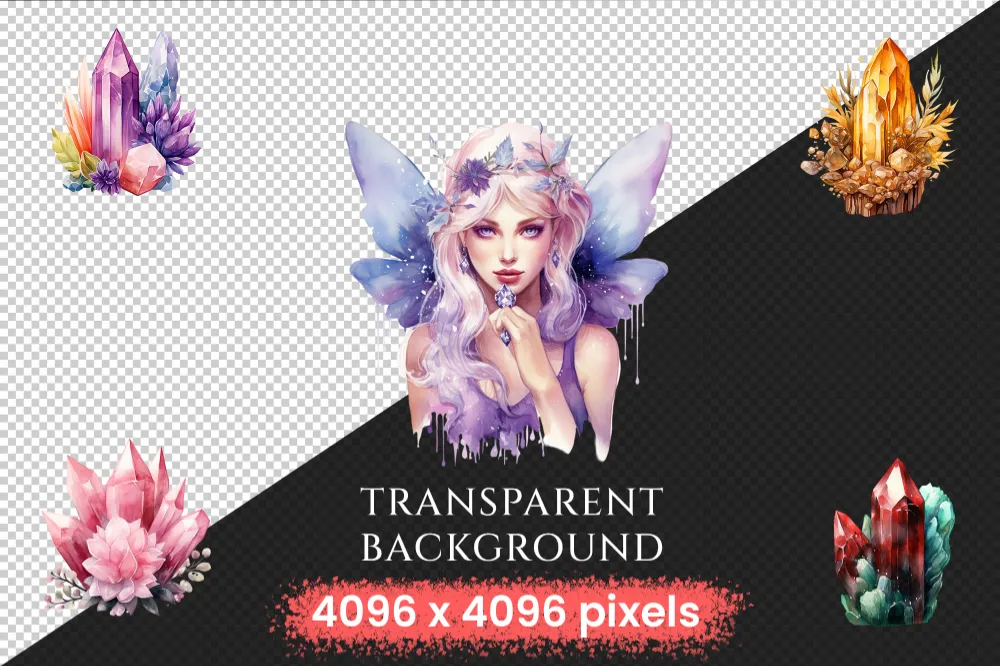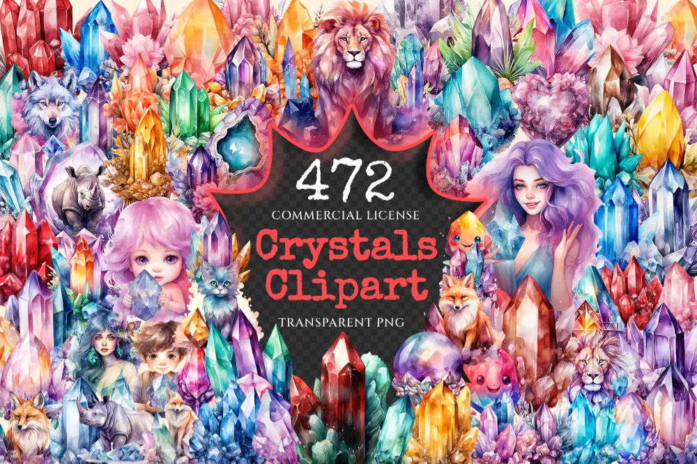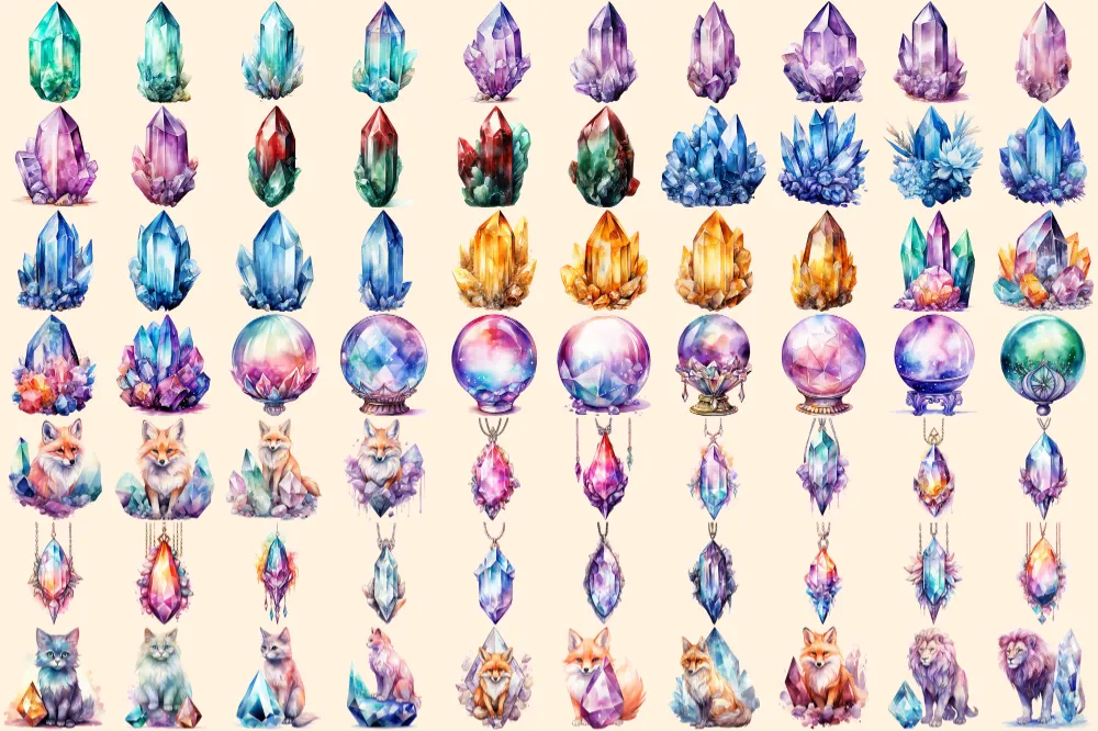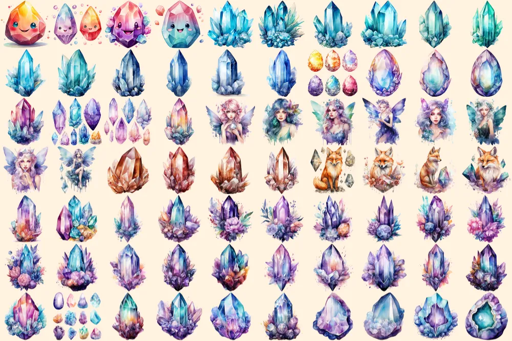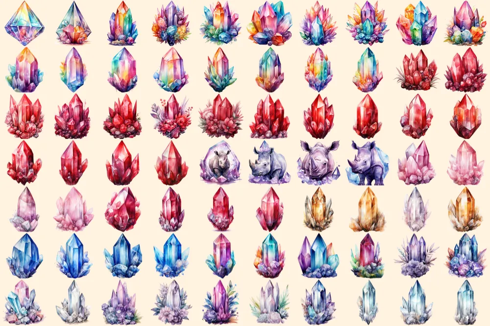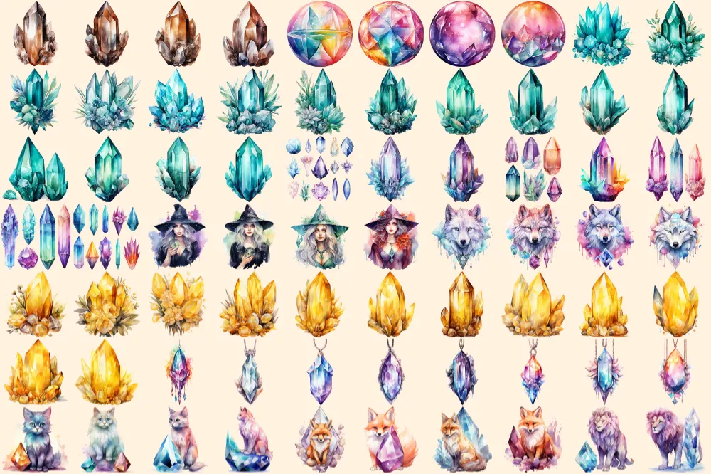Crystals Watercolor Clipart Bundle – 470+ transparent PNG, Crystal illustrations, Enchanted gem graphics, Commercial use, Digital download
