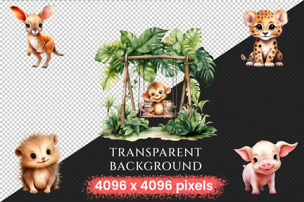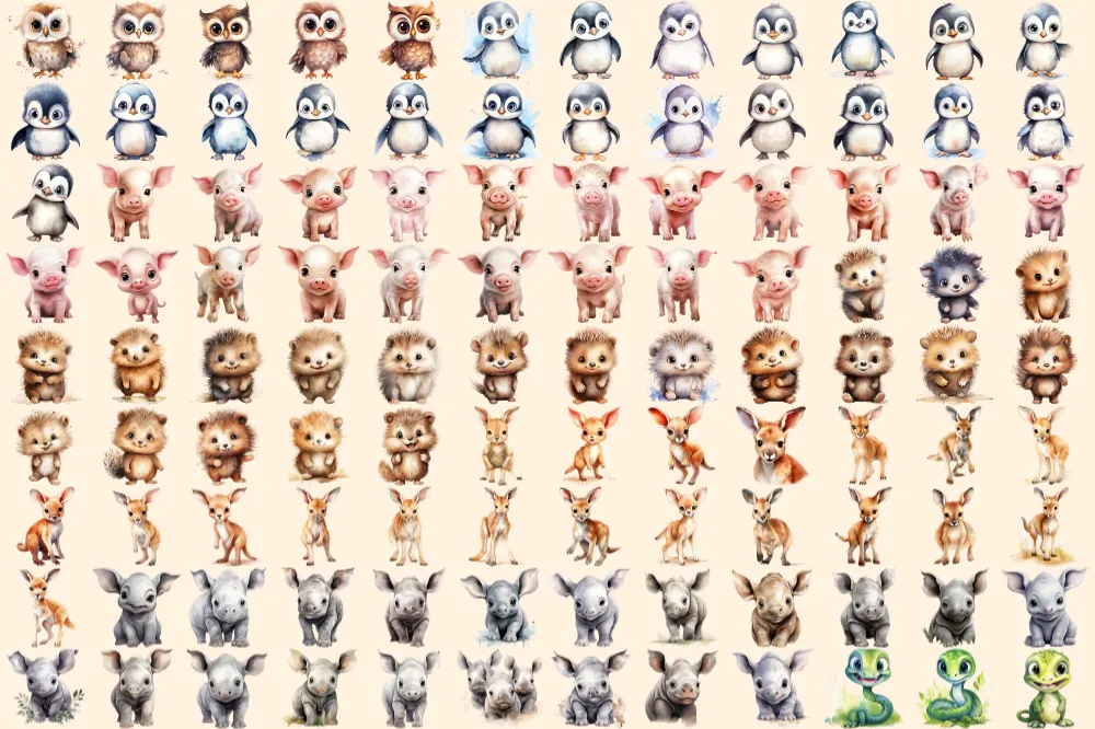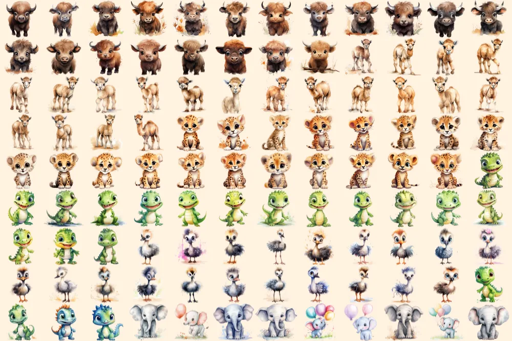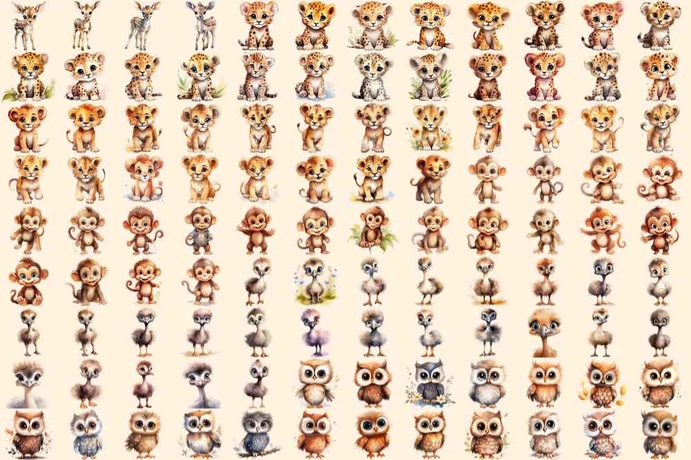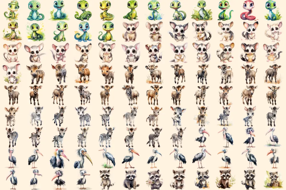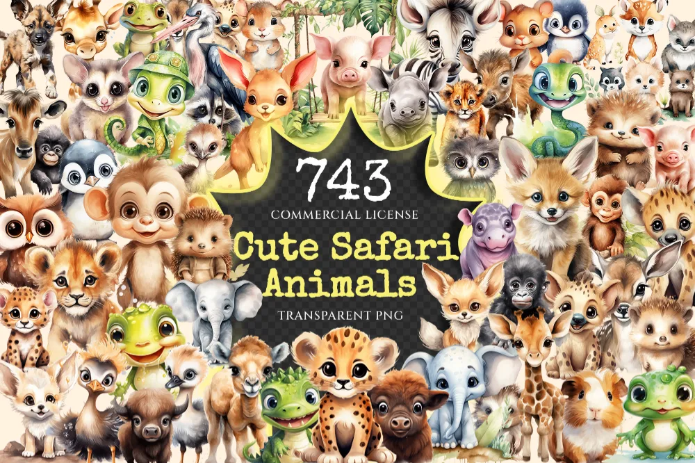 Cute Safari Animals Watercolor Clipart Bundle – 740+ transparent PNG, Charming baby animals, Cute wild art, Commercial use, Digital download