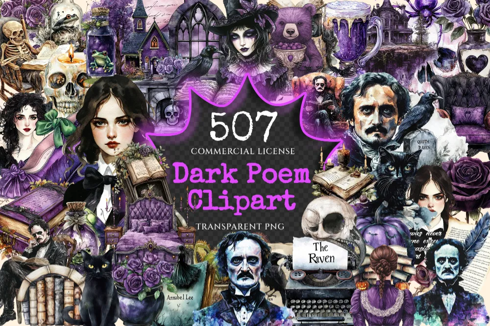 Dark Poem Watercolor Clipart Bundle – 500+ transparent PNG, Edgar allan poe graphics, Dark victorian png, Commercial use, Digital download