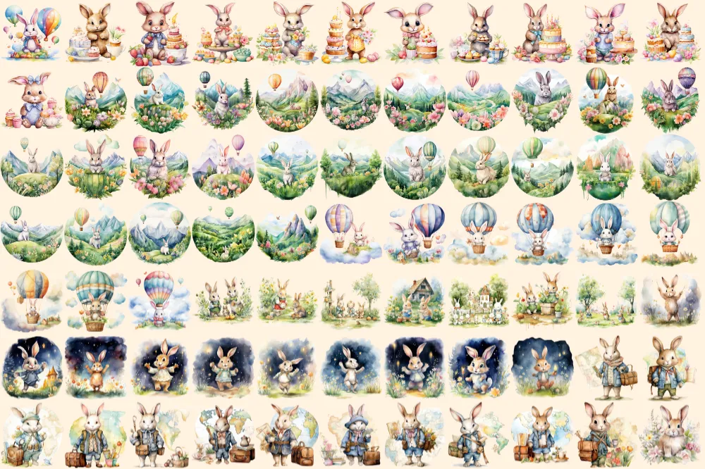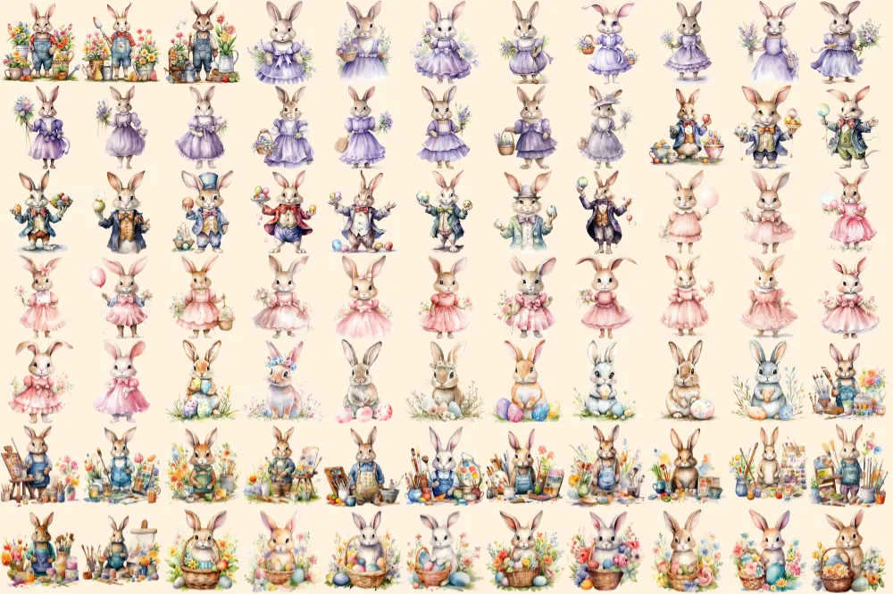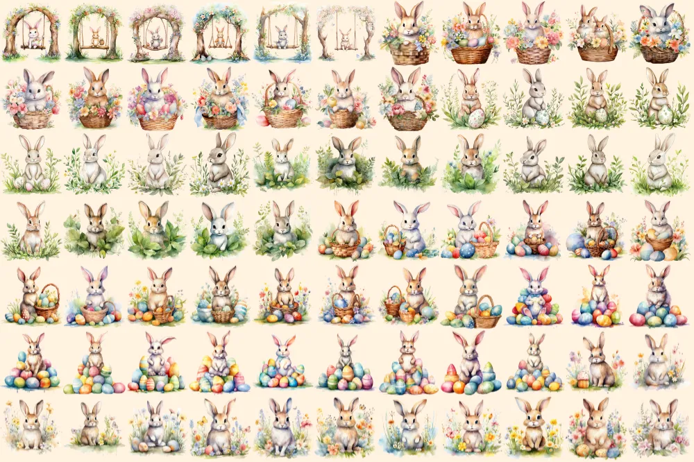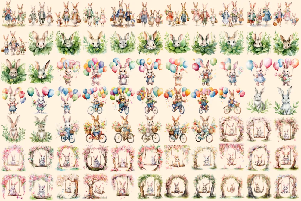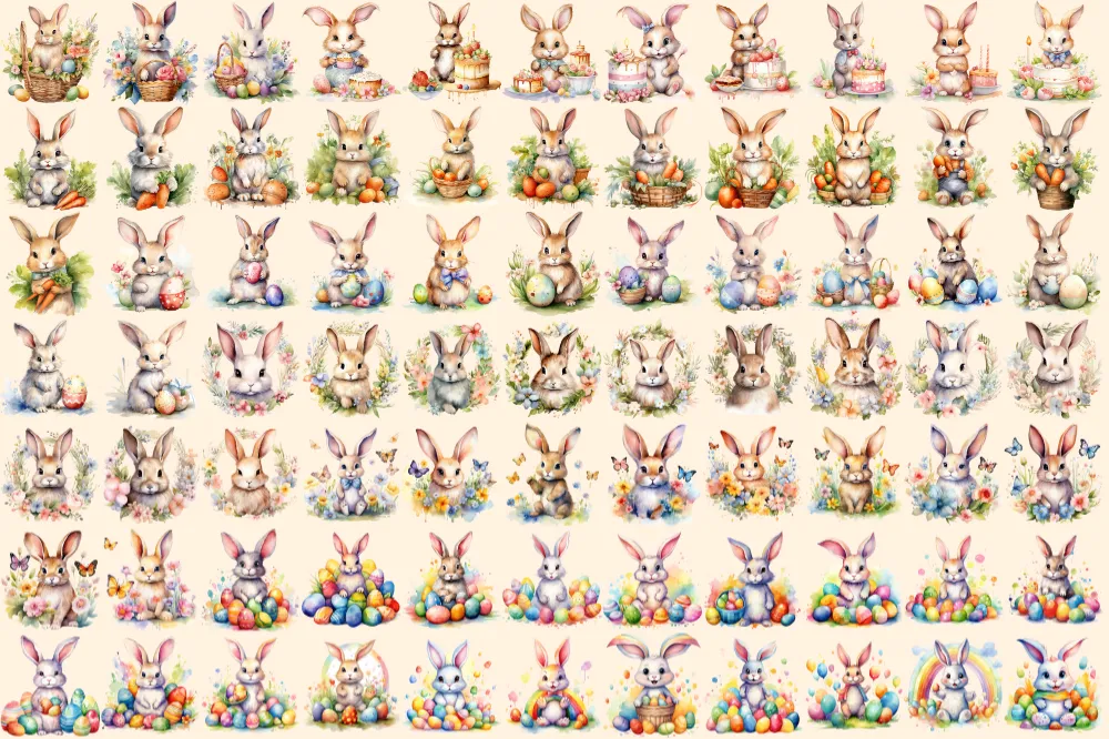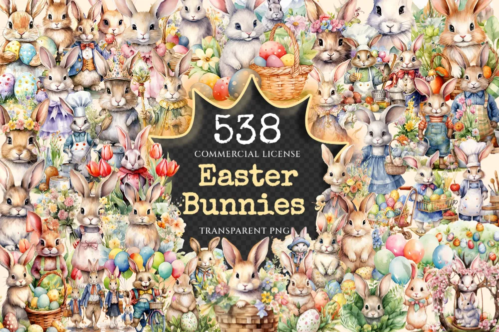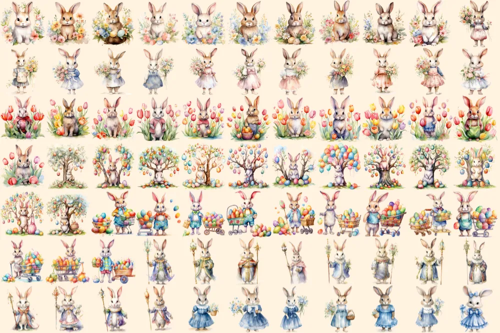 Easter Bunnies Watercolor Clipart Bundle – 535+ transparent PNG, Easter rabbit graphics, Playful bunny art, Commercial use, Digital download