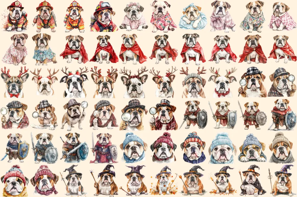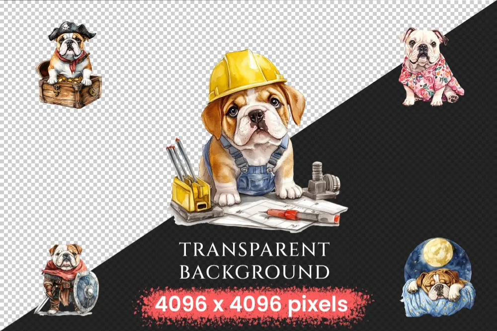 English Bulldogs Watercolor Clipart Bundle – 410+ transparent PNG, Cute bulldog graphics, Cute puppy png, Commercial use, Digital download