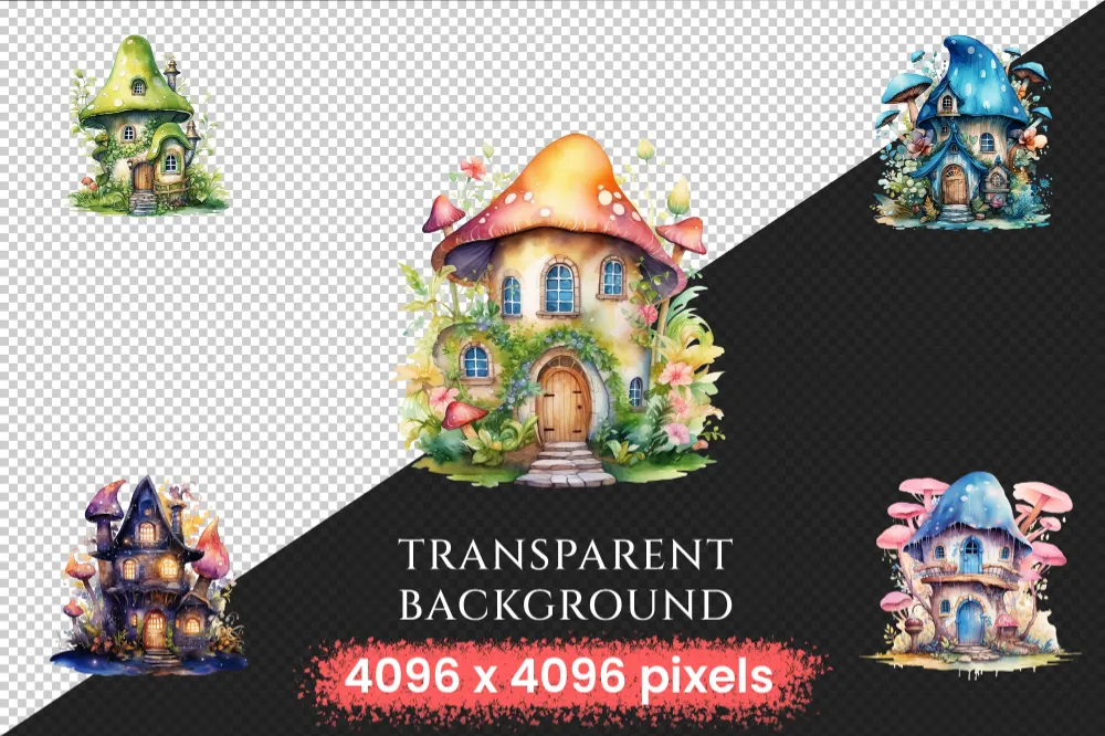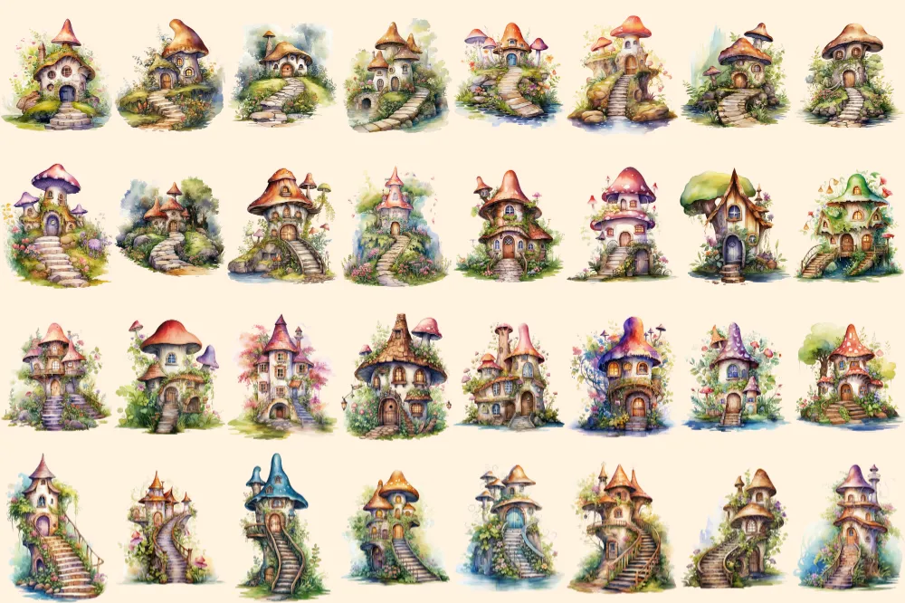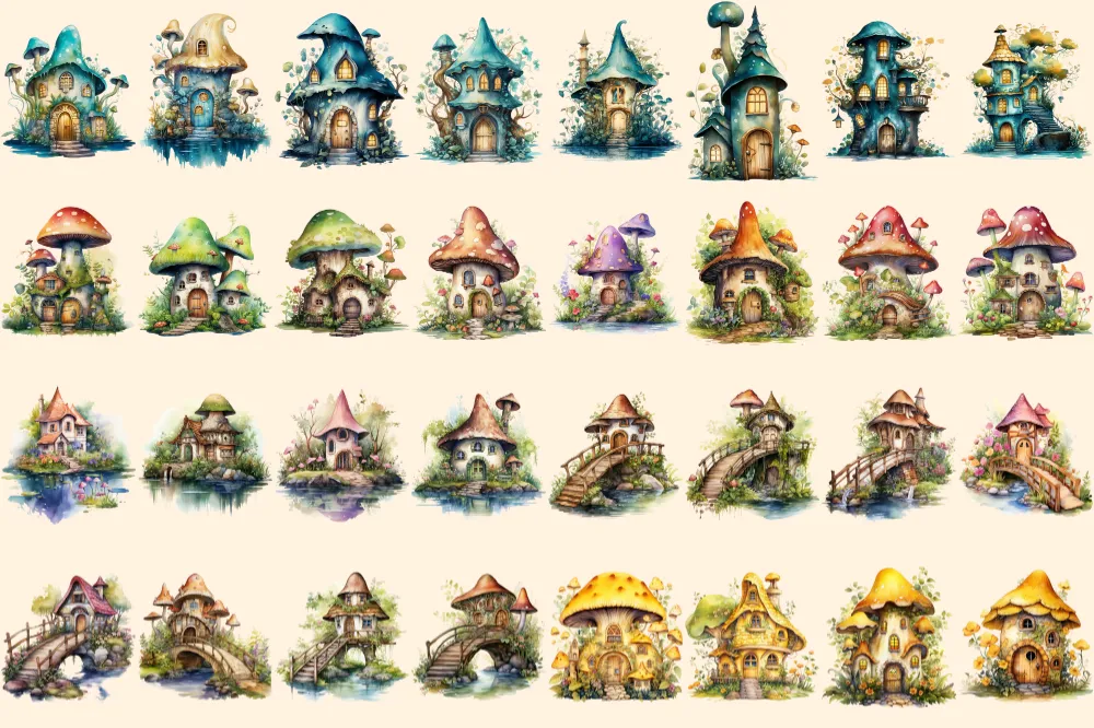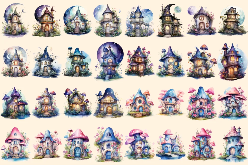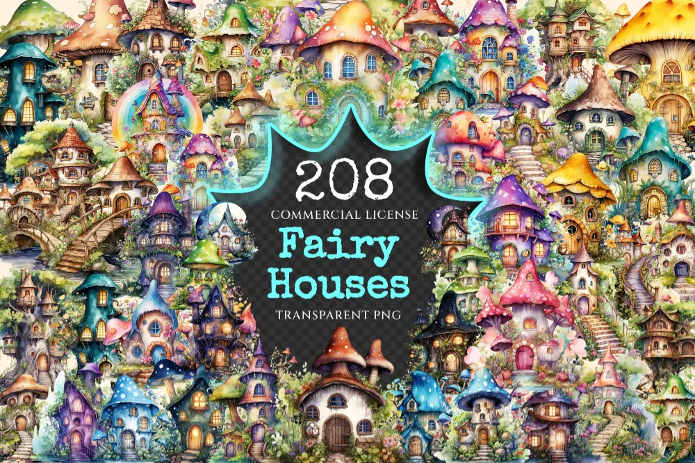 Fairy Houses Watercolor Clipart Bundle – 205+ transparent PNG, Whimsical storybook graphics, Cute fantasy, Commercial use, Digital download