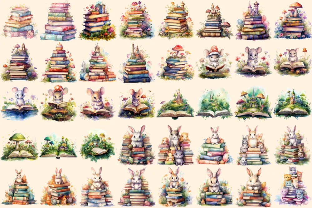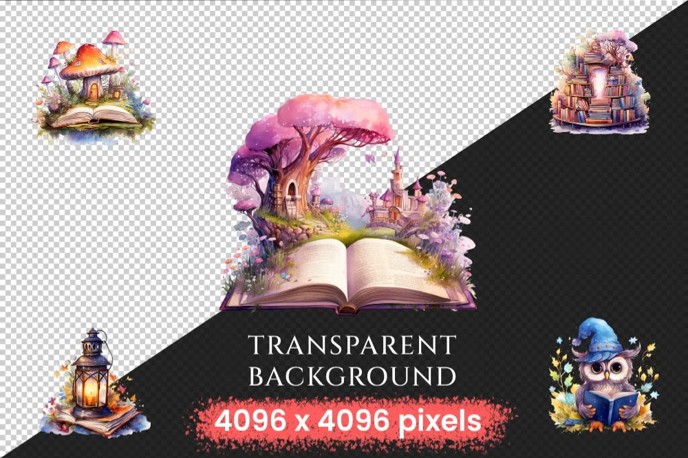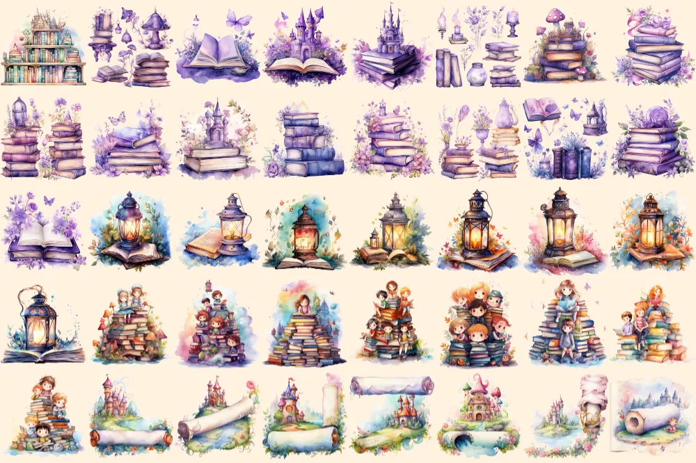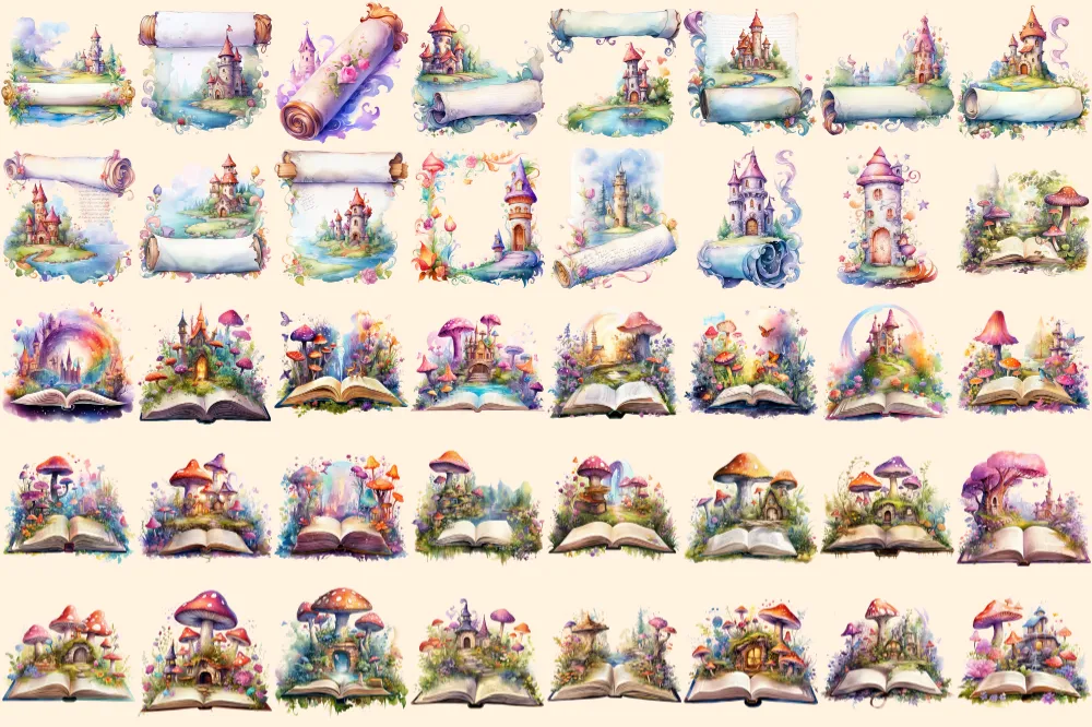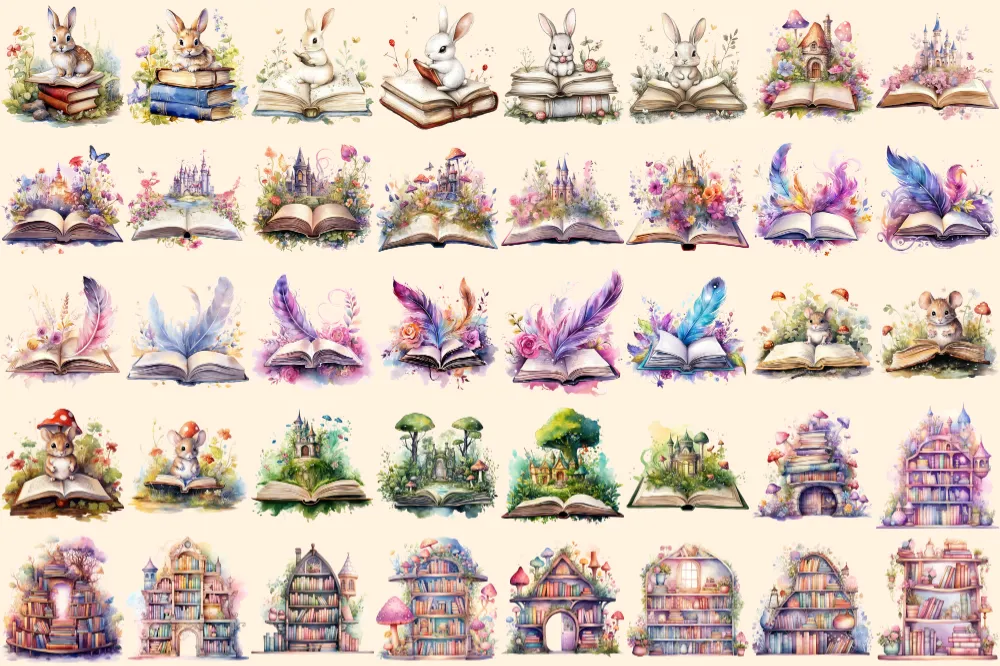 Fairytale Books Watercolor Clipart Bundle – 248+ transparent PNG, Cute storybook graphics, Magical images, Commercial use, Digital download