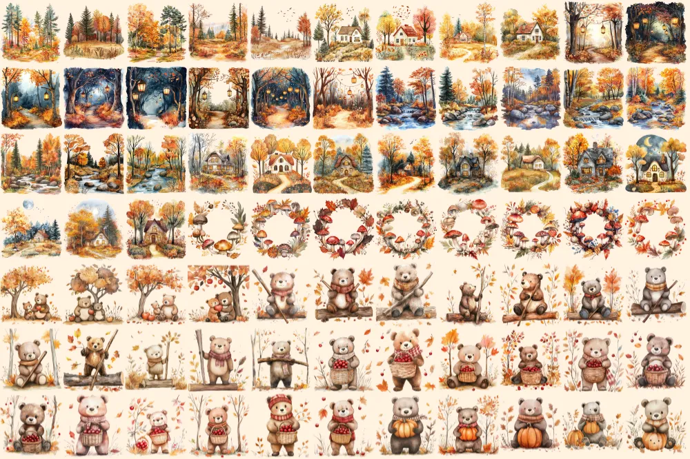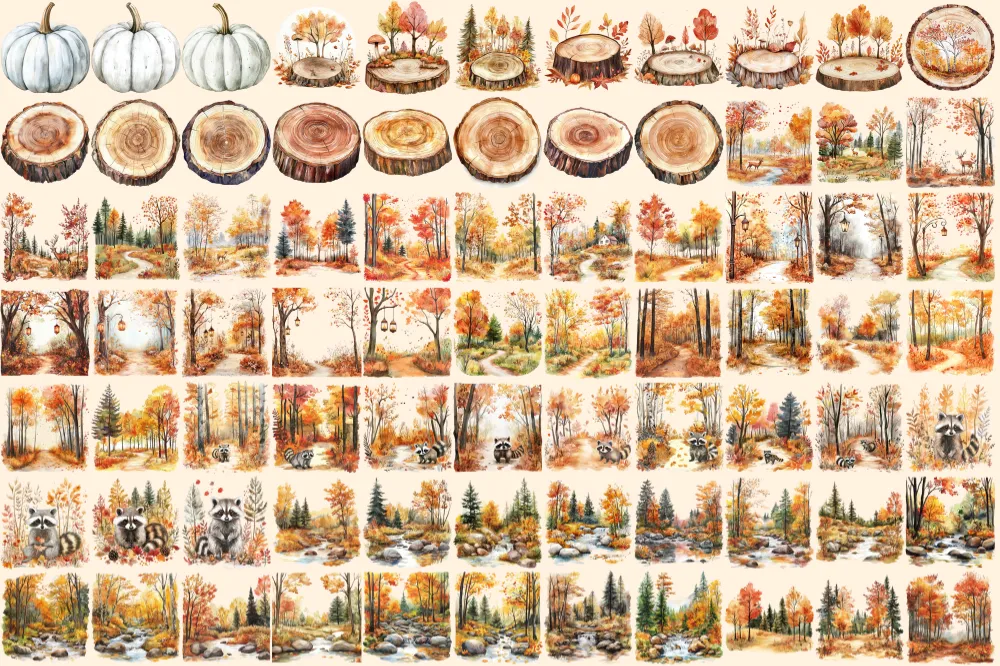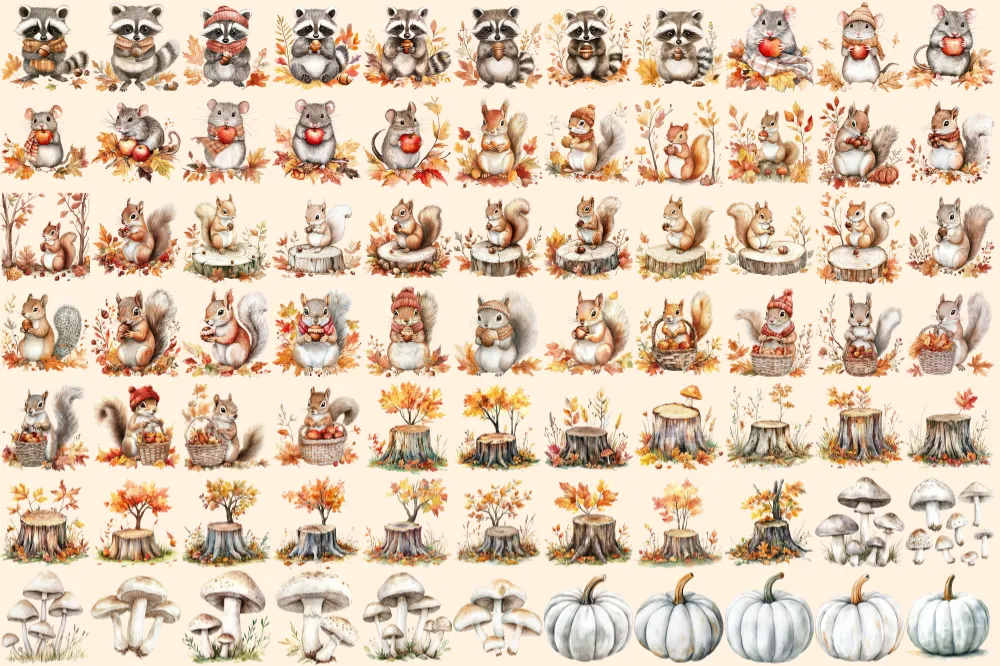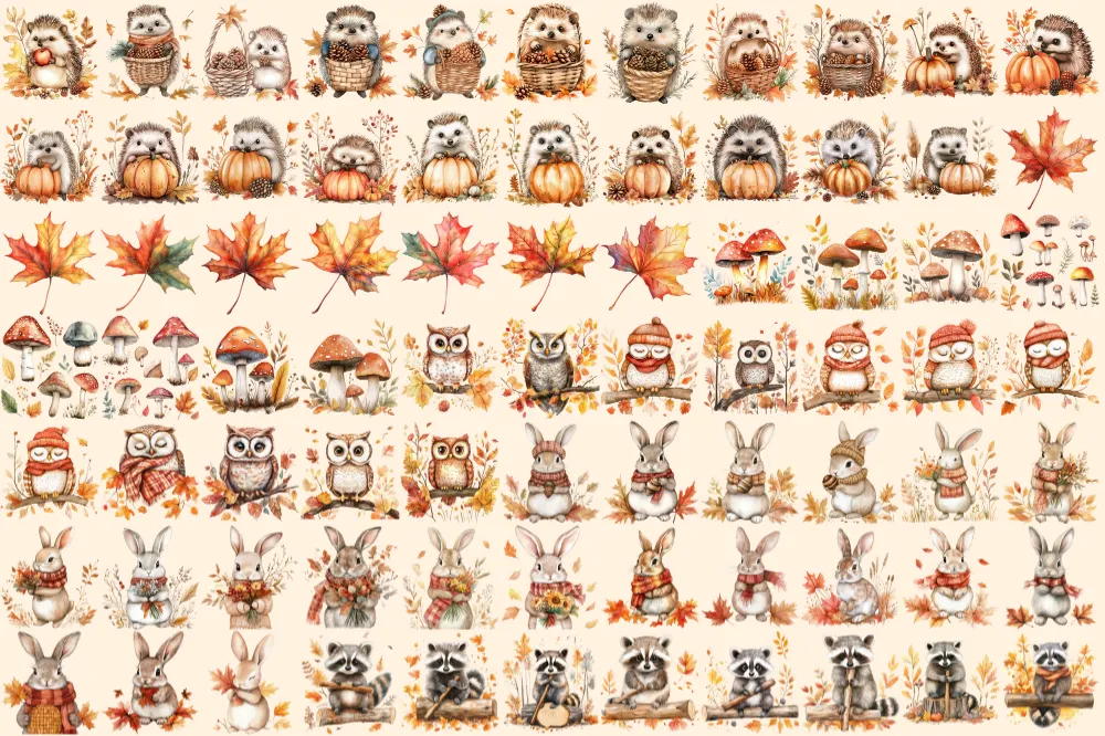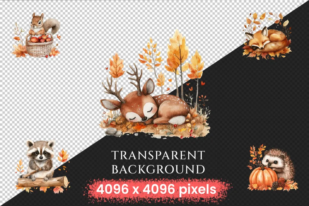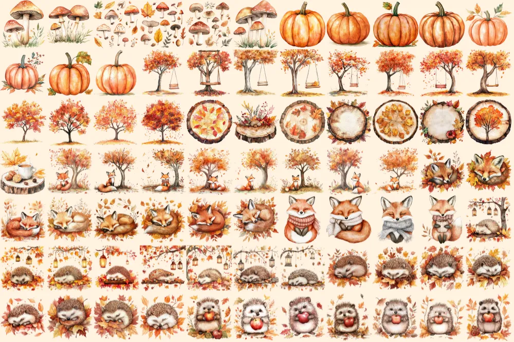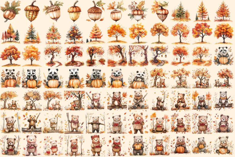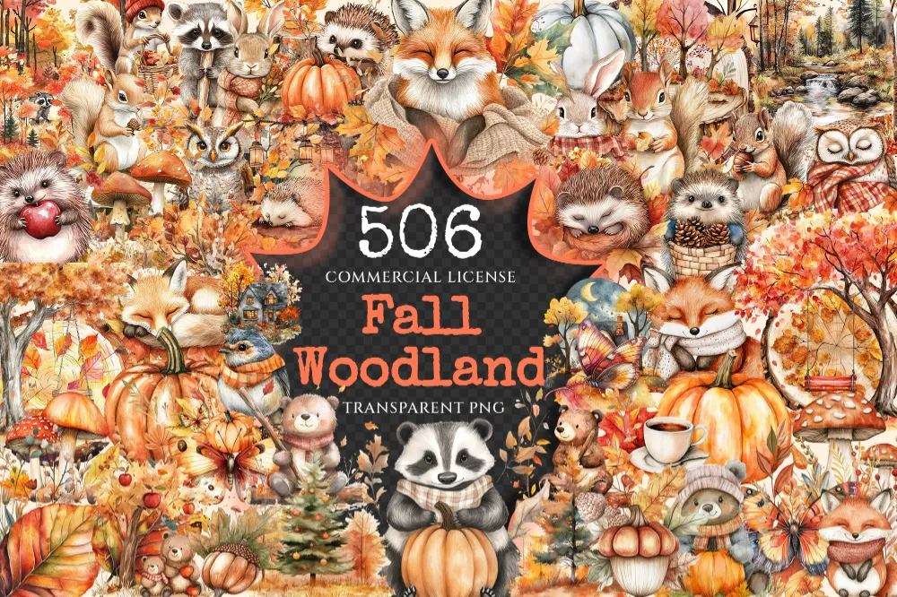 Fall Woodland Watercolor Clipart Bundle – 502+ transparent PNG, Warm forest animal graphics, Fall woodland, Commercial use, Digital download