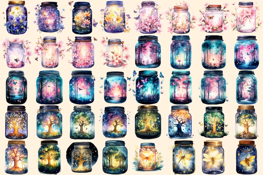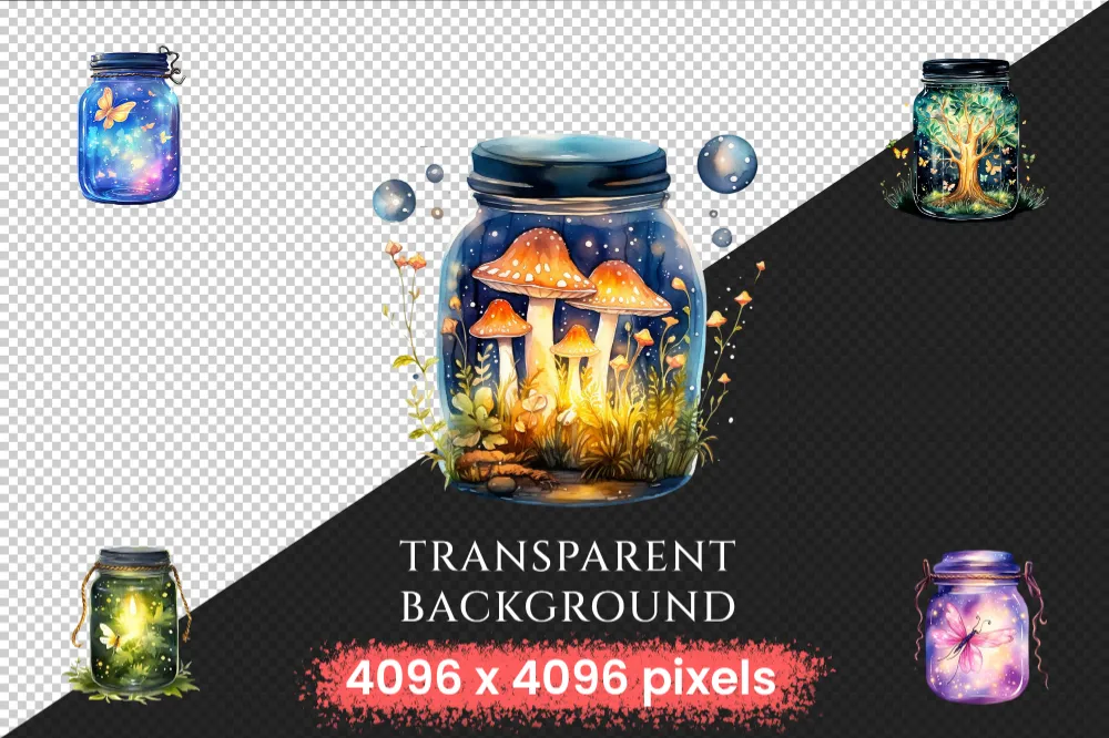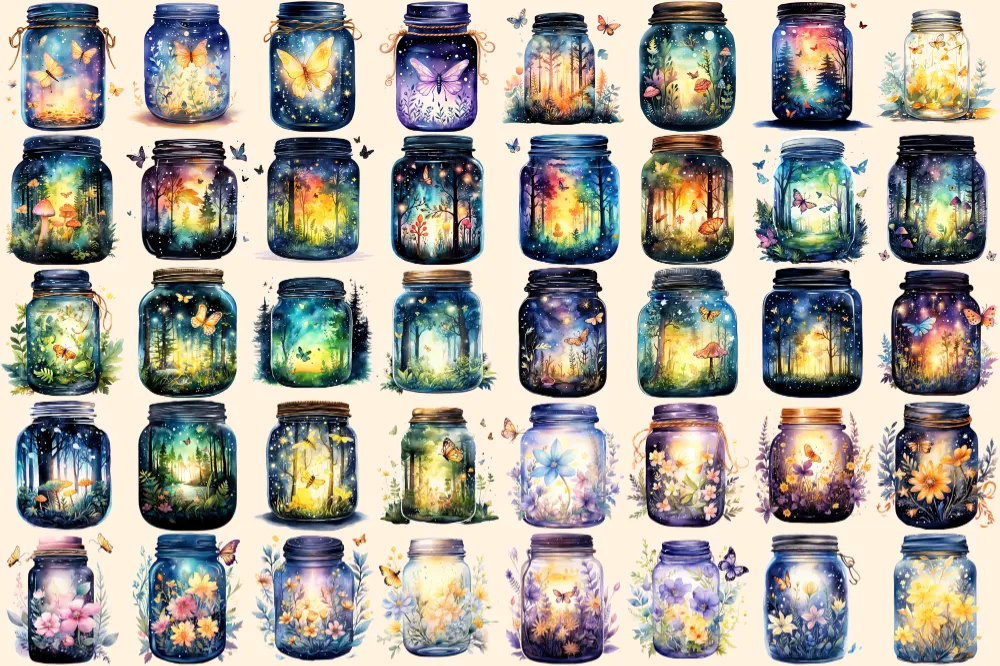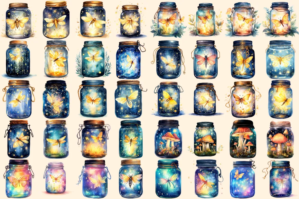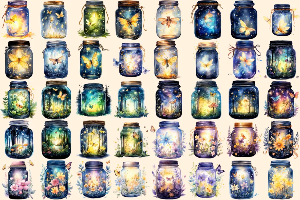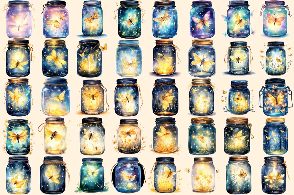 Firefly Jars Watercolor Clipart Bundle – 253+ transparent PNG, Whimsical fairytale graphics, Storybook art, Commercial use, Digital download