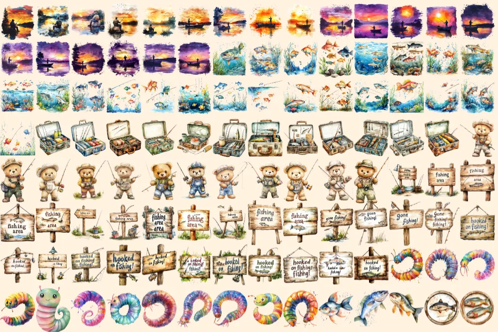 Fishing Watercolor Clipart Bundle – 690+ transparent PNG, Fishing gear illustration, Angler equipment art, Commercial use, Digital download