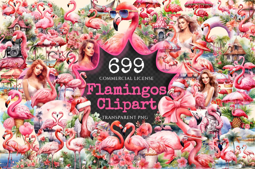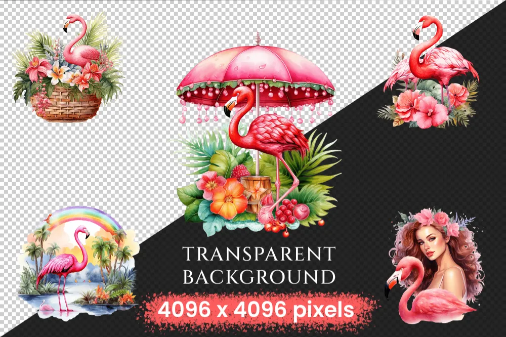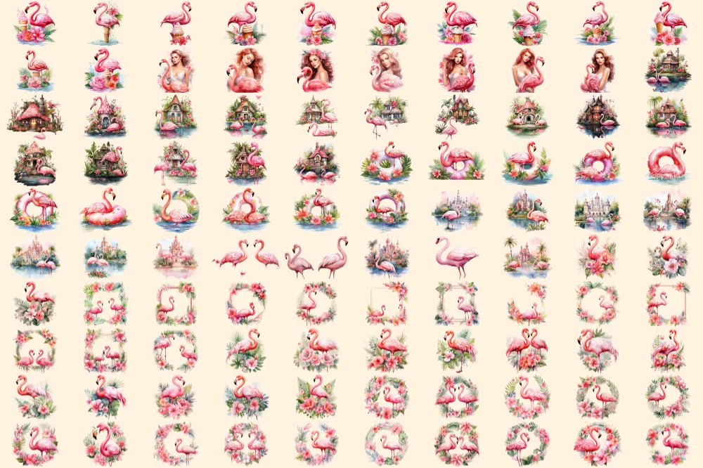 Flamingos Watercolor Clipart Bundle – 690+ transparent PNG, Flamingo imagery, Floral tropical bird designs, Commercial use, Digital download