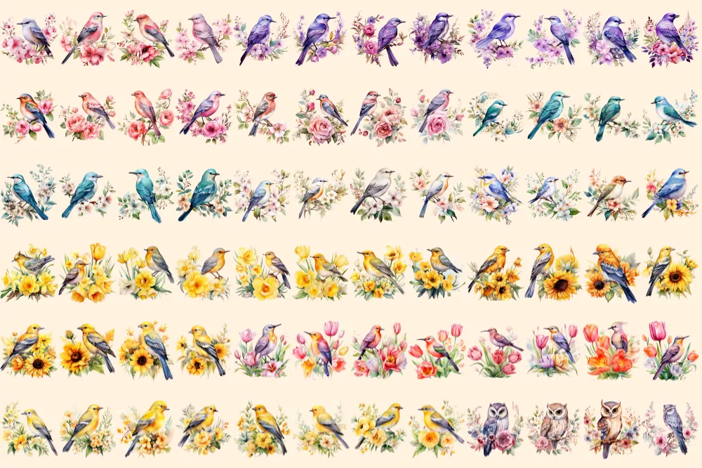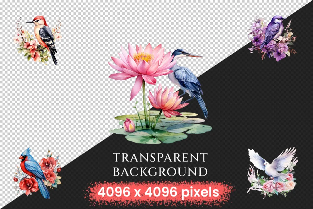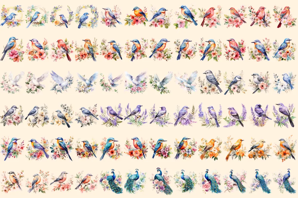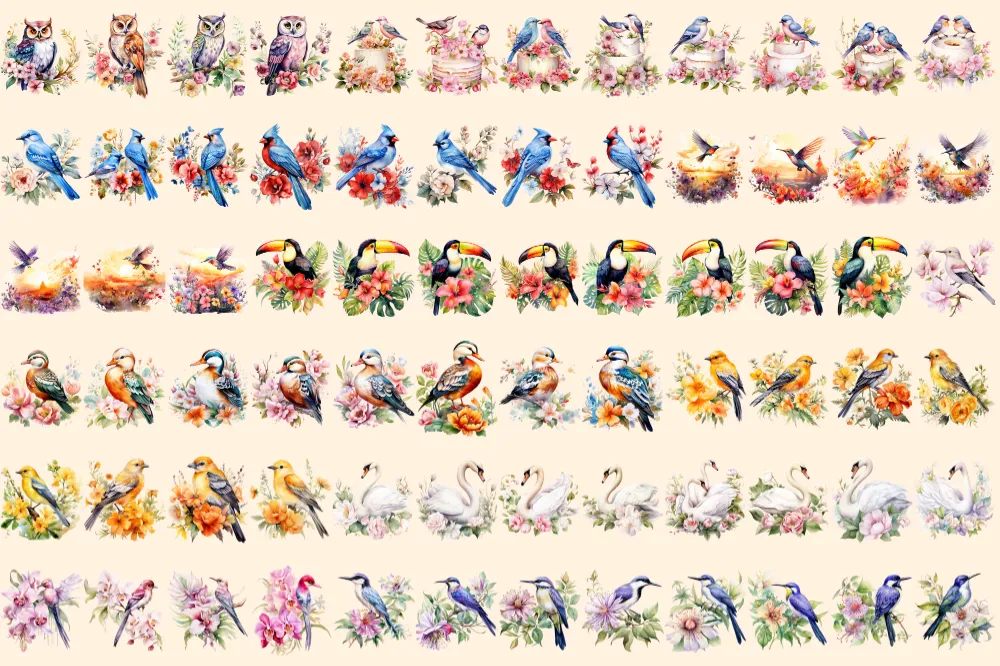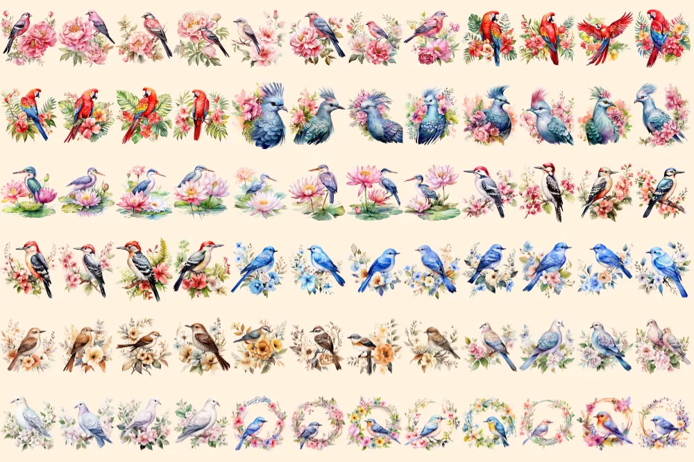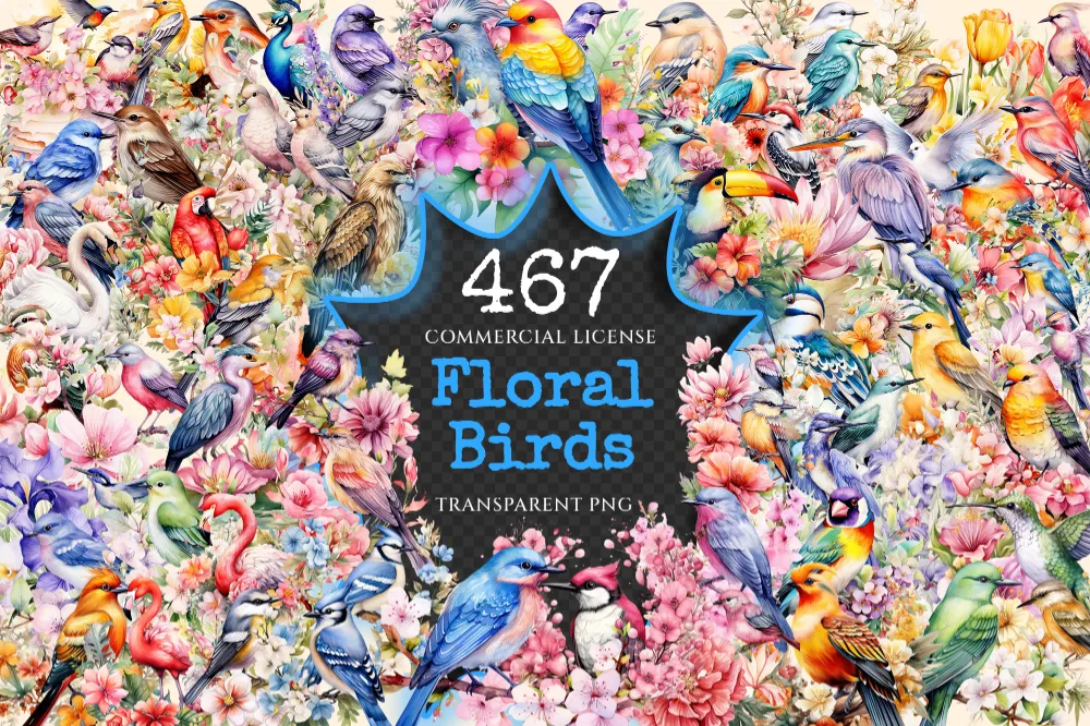 Floral Birds Watercolor Clipart Bundle – 463+ transparent PNG, Floral bird graphics, Nature avian images, Commercial use, Digital download