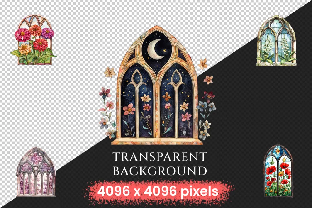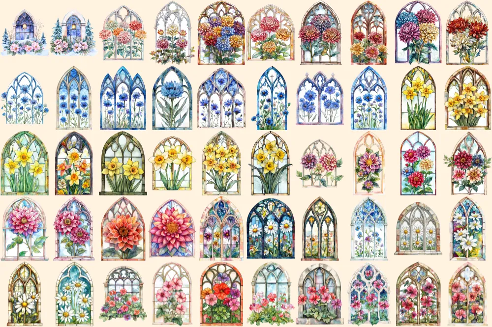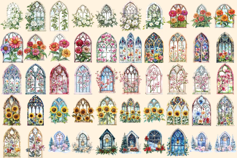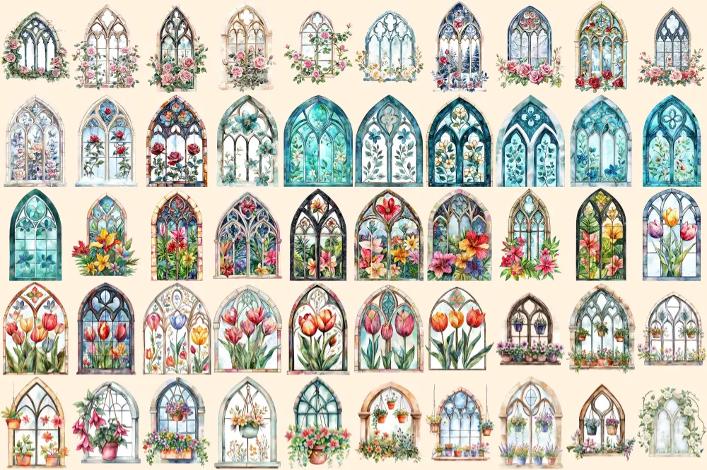 Floral Church Windows Watercolor Clipart Bundle – 340+ transparent PNG, Sacred graphics, Floral glass art, Commercial use, Digital download