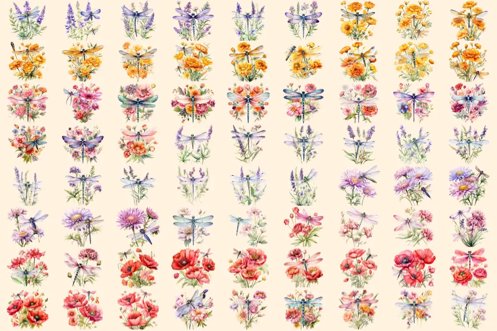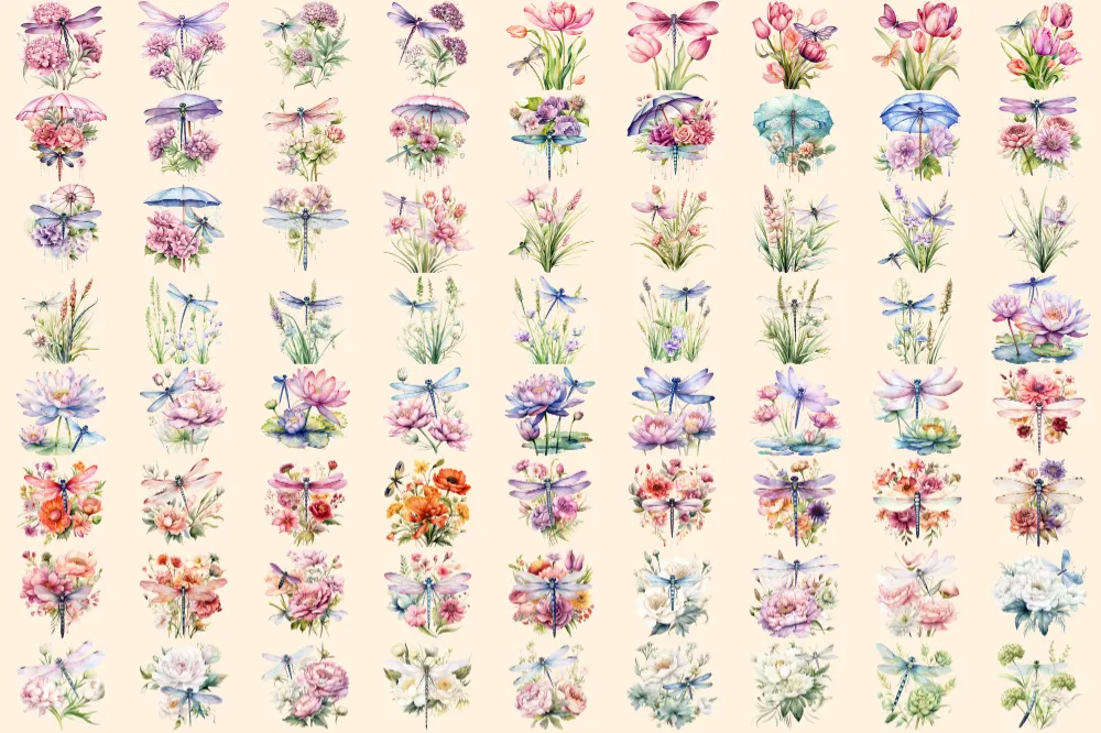 Floral Dragonfly Watercolor Clipart Bundle – 495+ transparent PNG, Floral dragonfly graphics, Nature images, Commercial use,Digital download