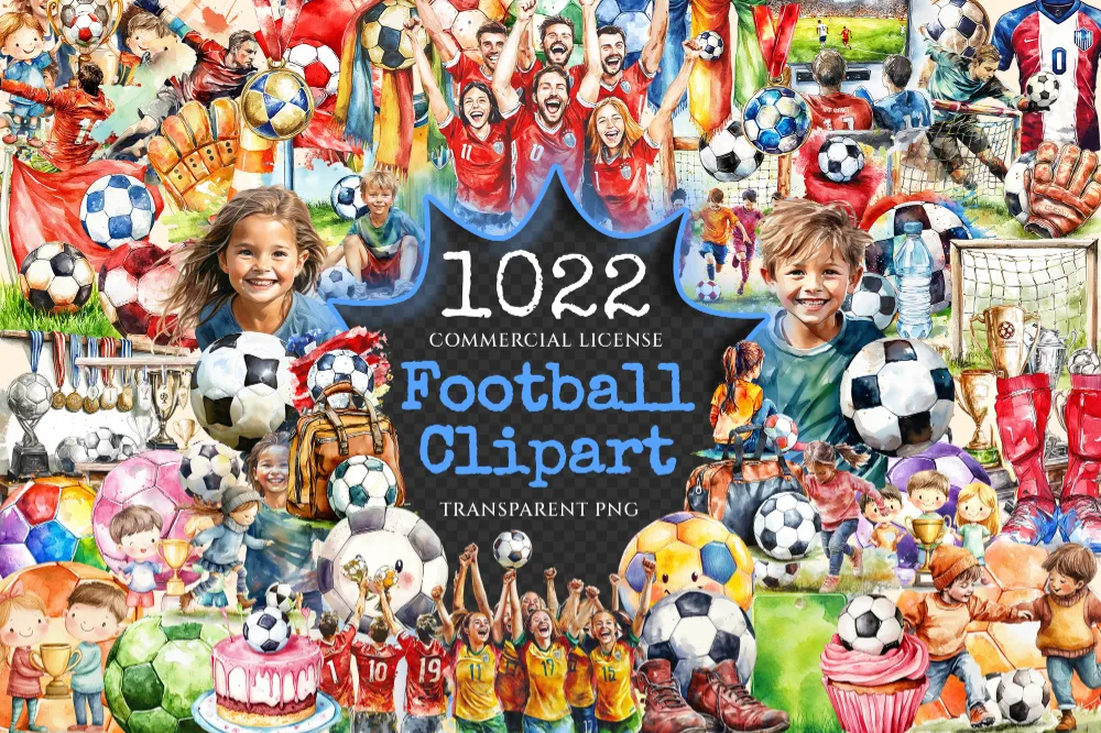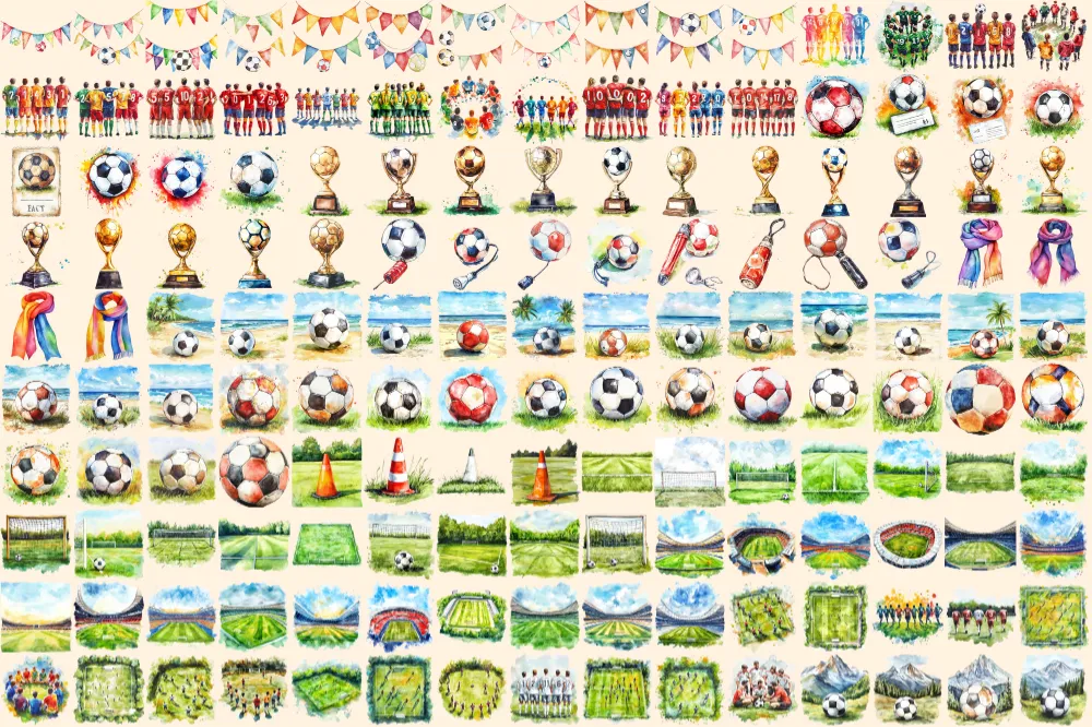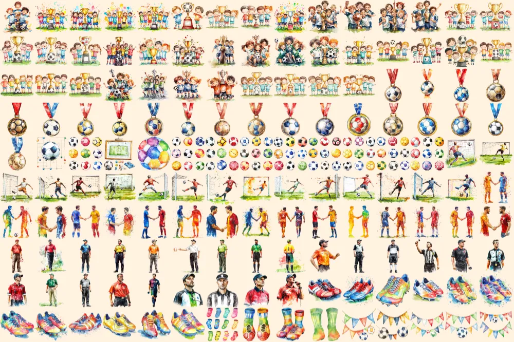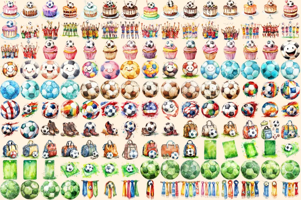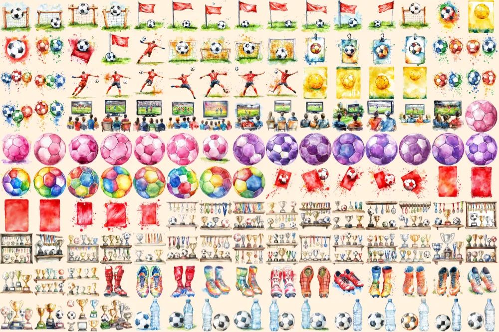 Football Watercolor Clipart Bundle – 1015+ transparent PNG, Sports equipment graphics, Soccer ball images, Commercial use, Digital download