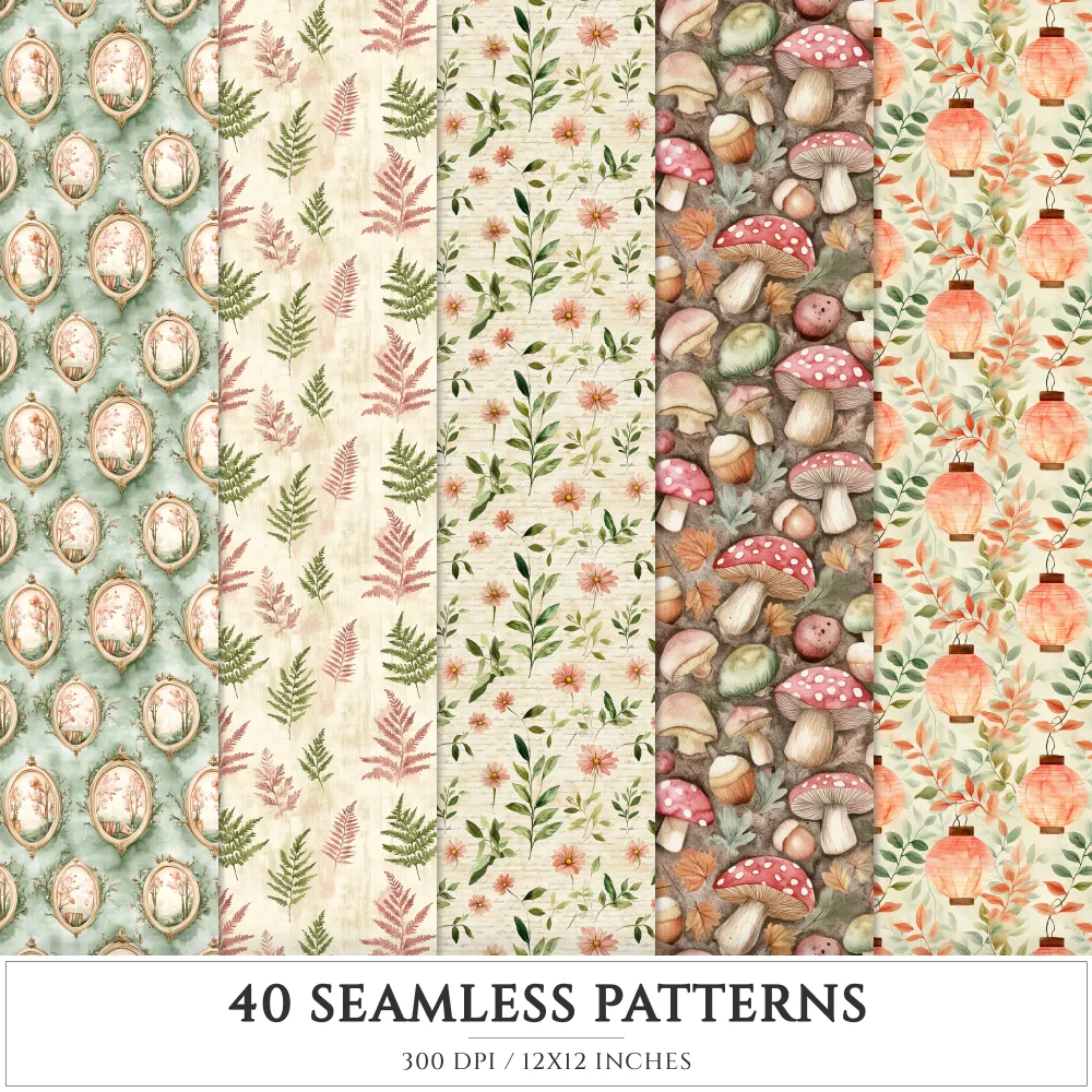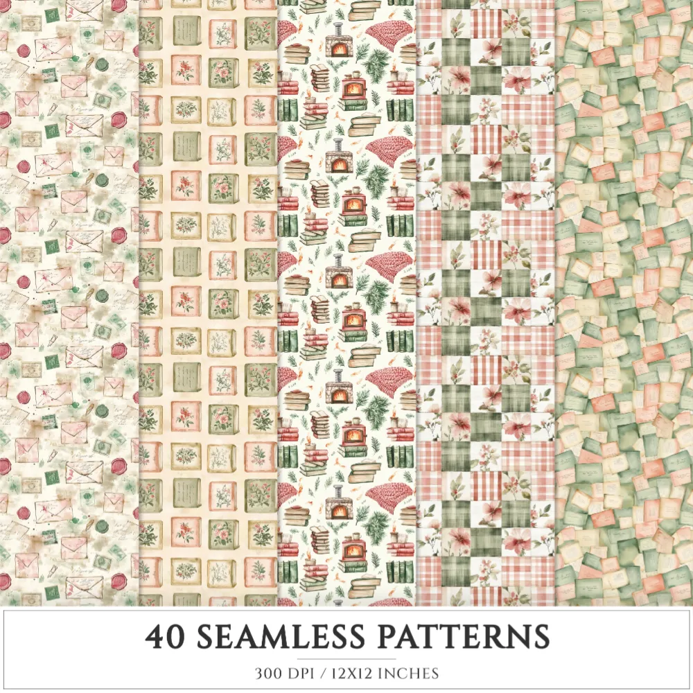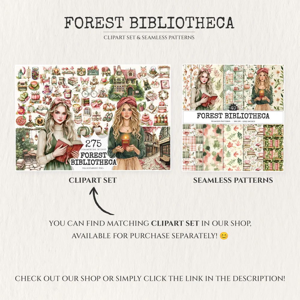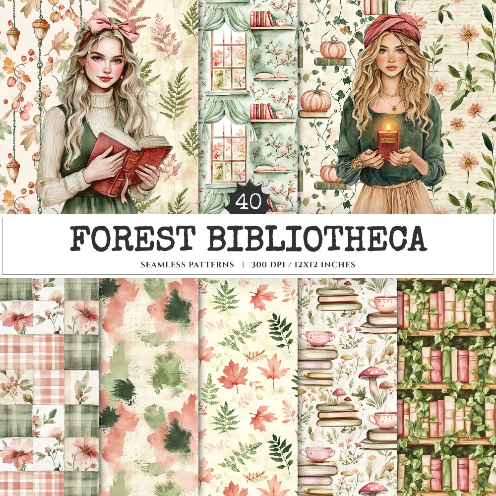 Forest Bibliotheca Seamless Patterns, Autumn library JPEG, Book pattern, Reading, Falling leaves repeating pattern, Digital scrapbook paper