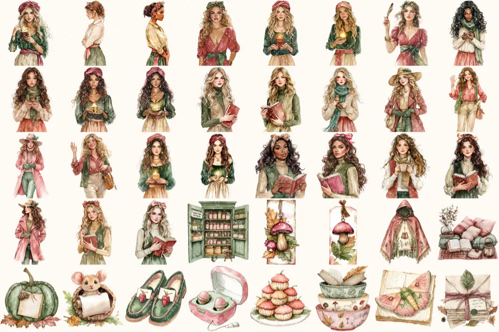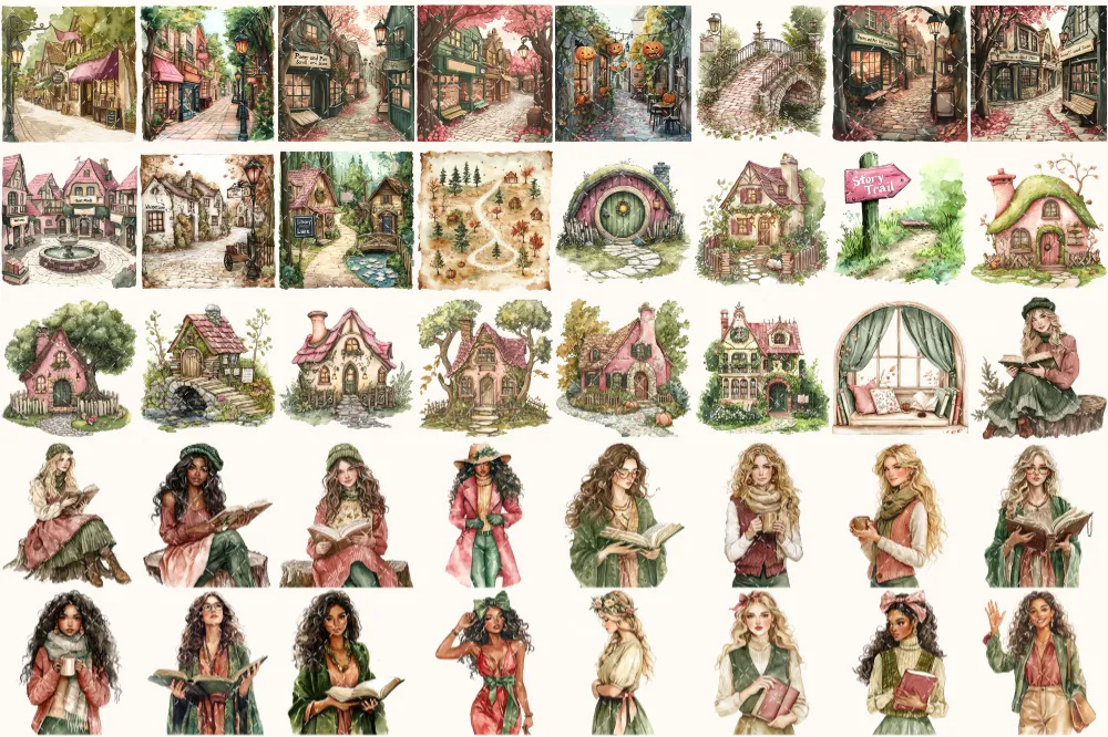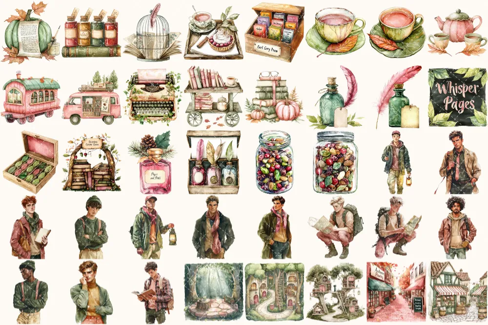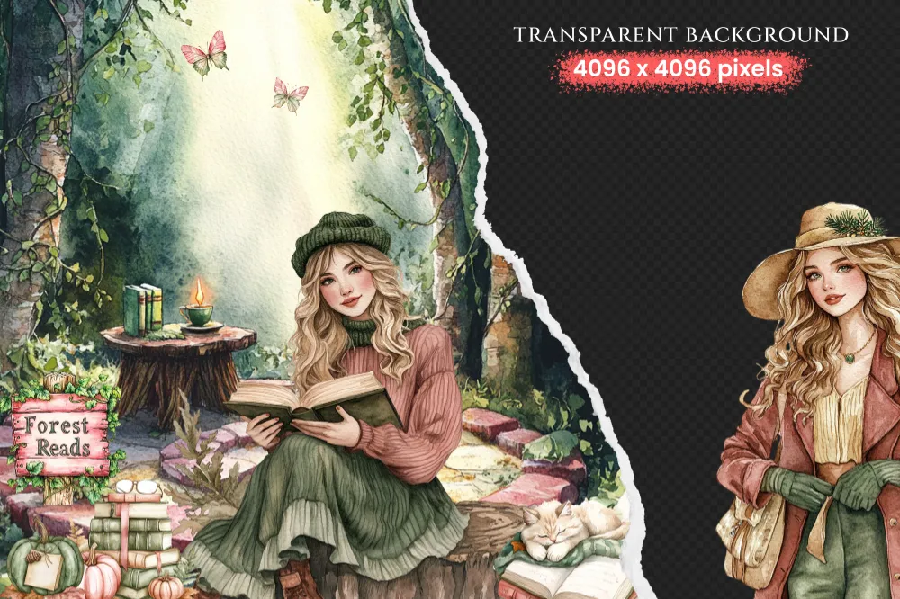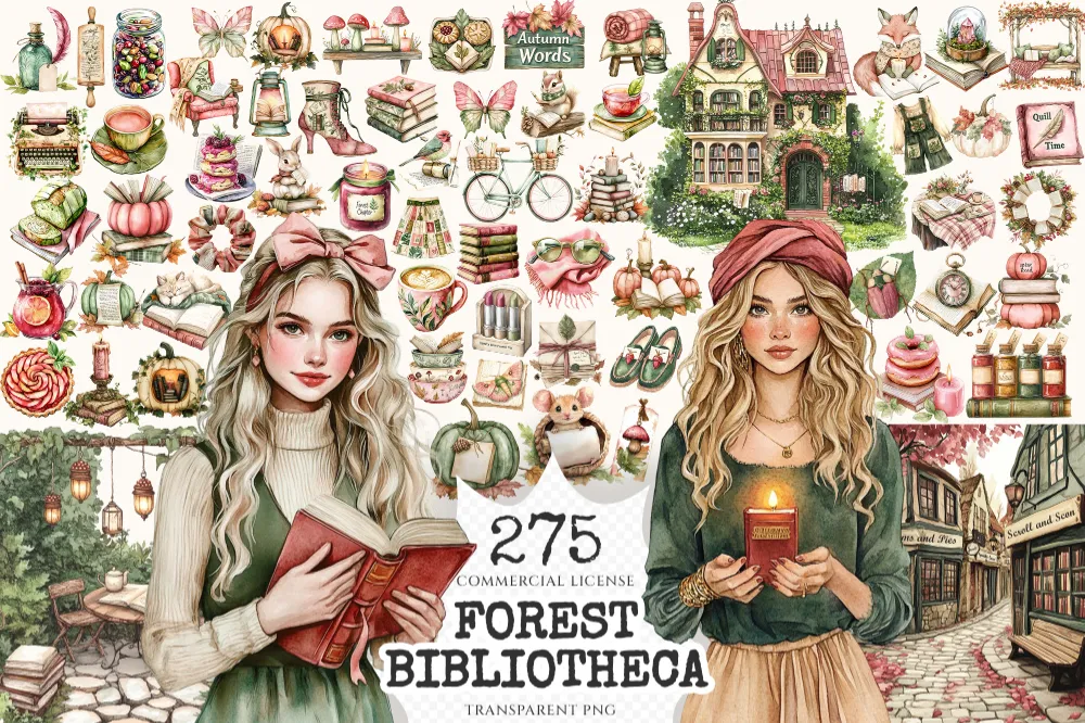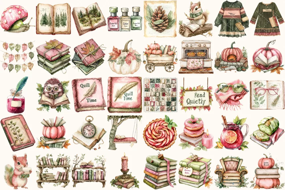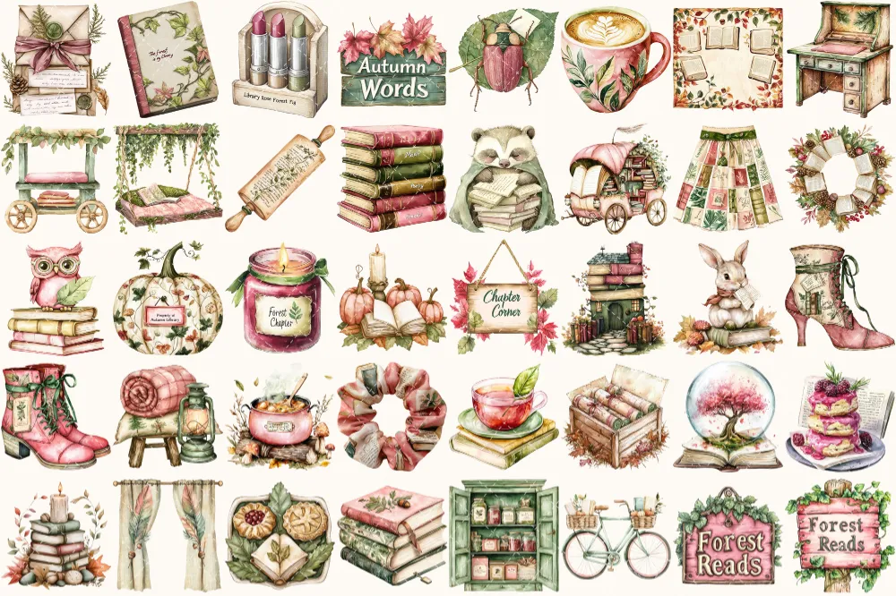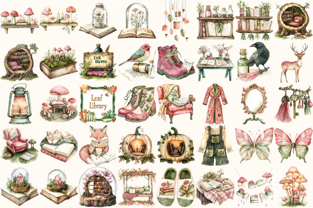 Forest Bibliotheca Watercolor Clipart Set – 270+ transparent PNG, Autumn library graphics, Cozy reading png, Commercial use,Digital download