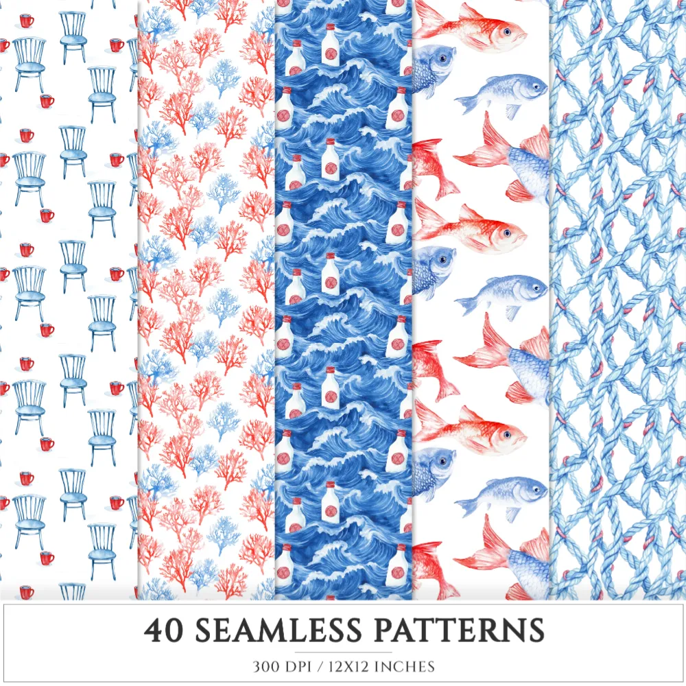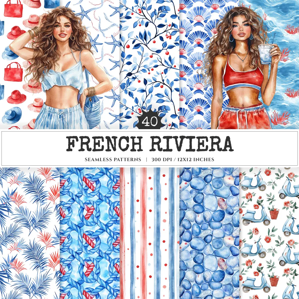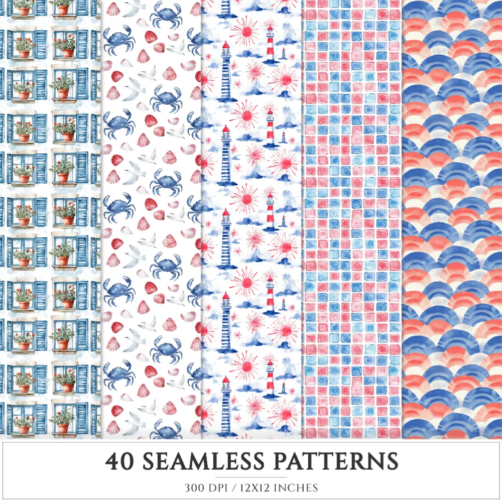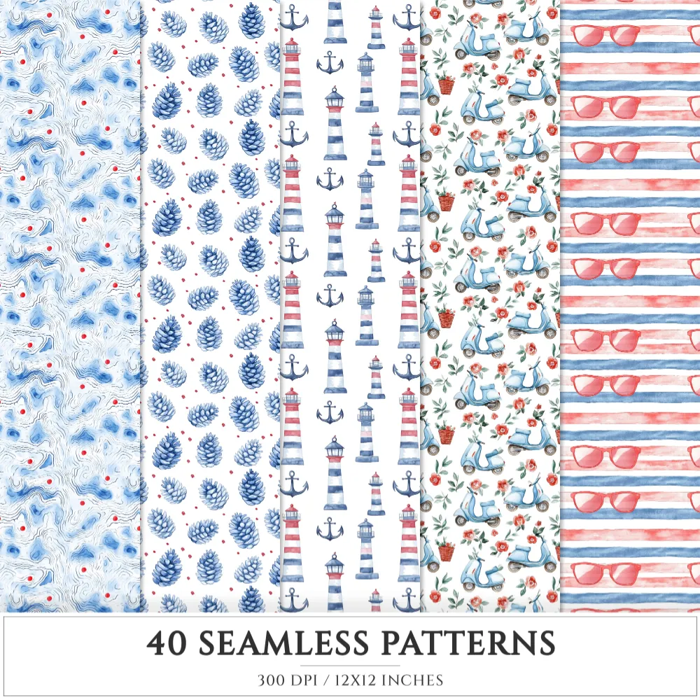 French Riviera Seamless Patterns, Summer beach JPEG, Sea pebble pattern, Shells, Seagull, Seaside repeating pattern, Digital scrapbook paper