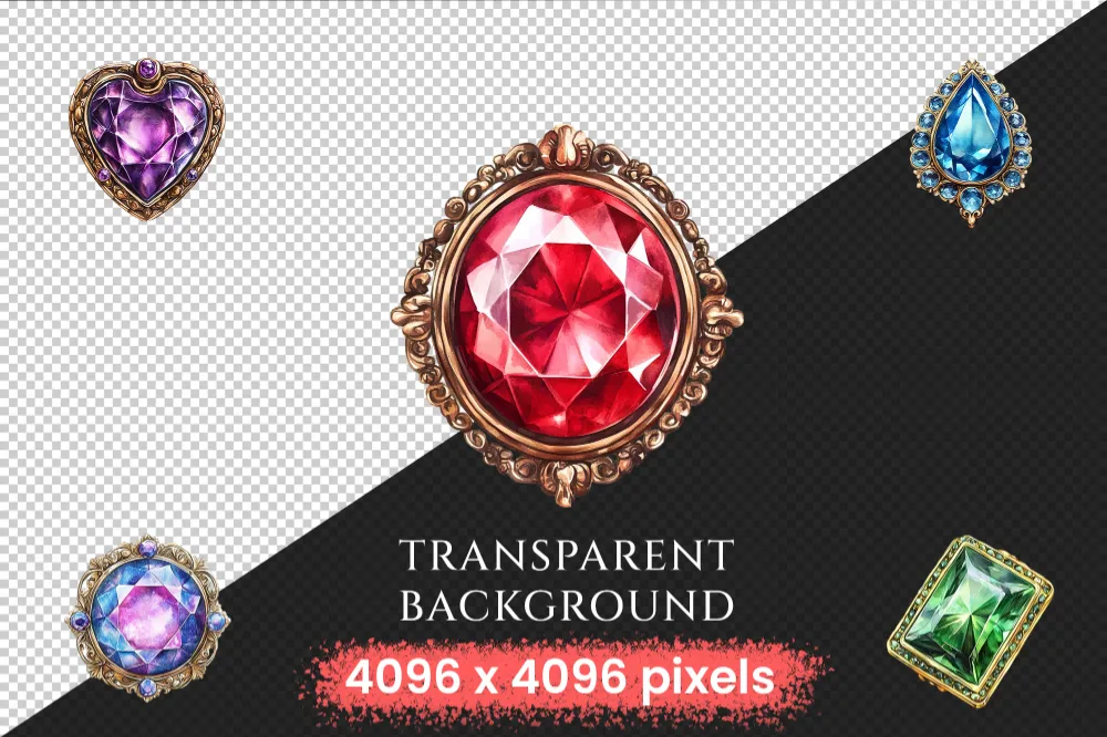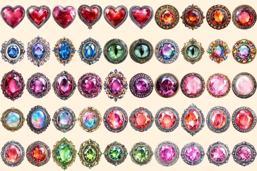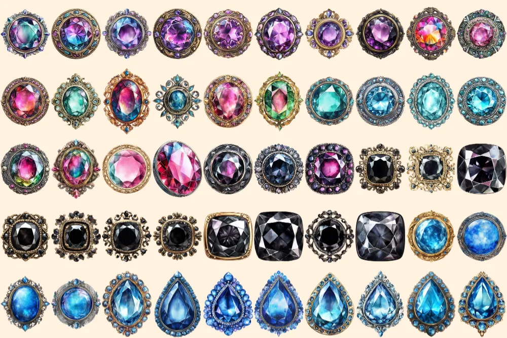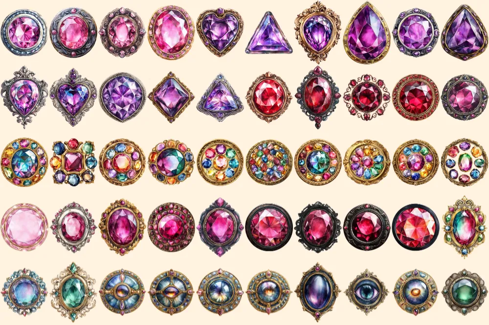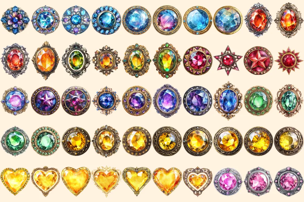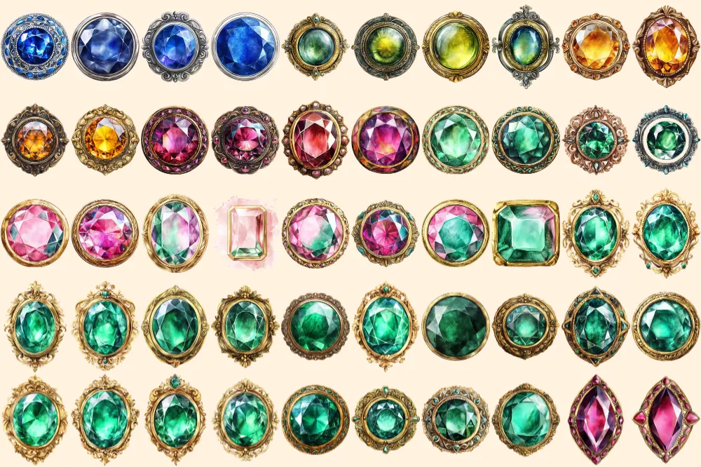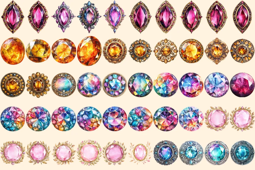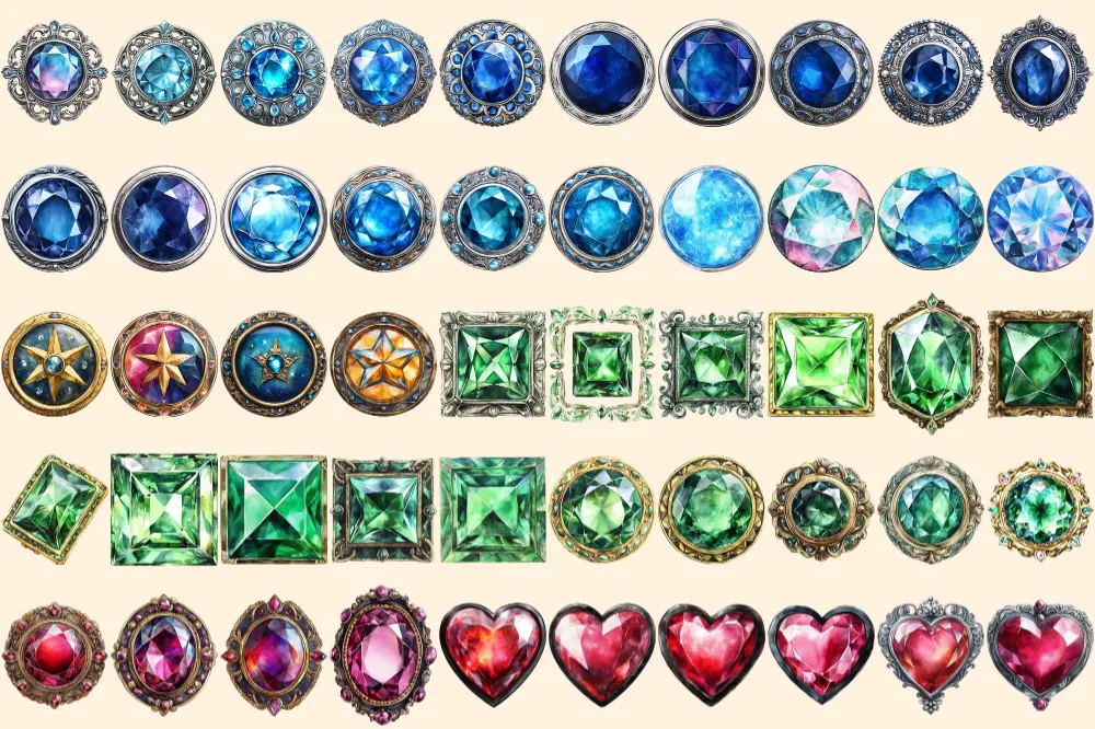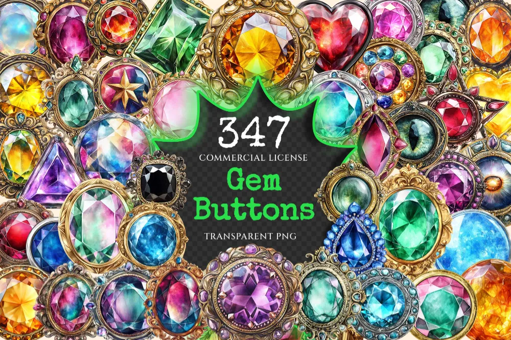 Gem Buttons Watercolor Clipart Bundle – 343+ transparent PNG, Shimmering gem button png, Decorative art, Commercial use, Digital download