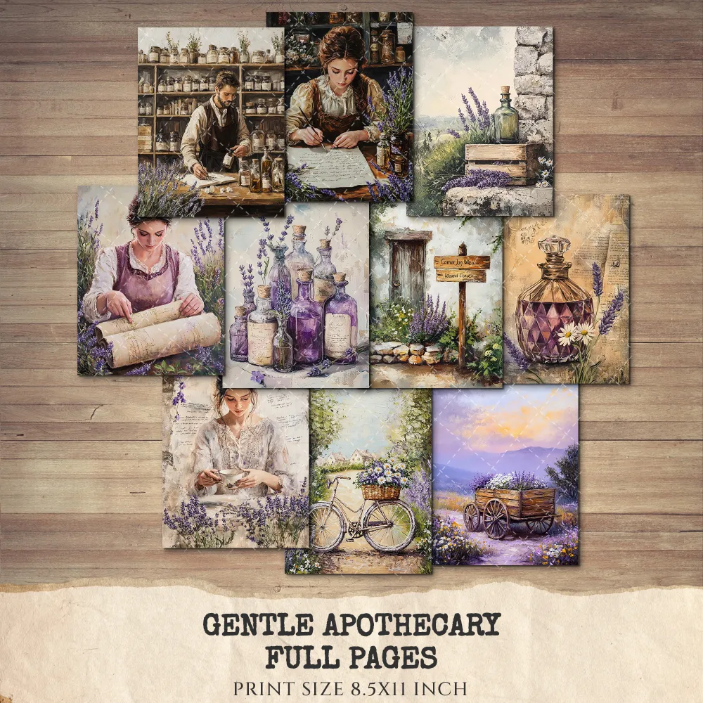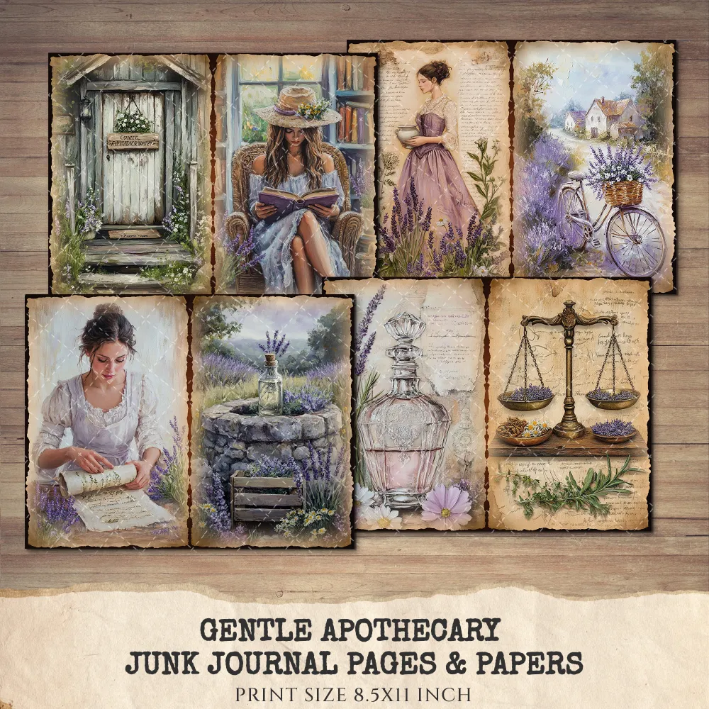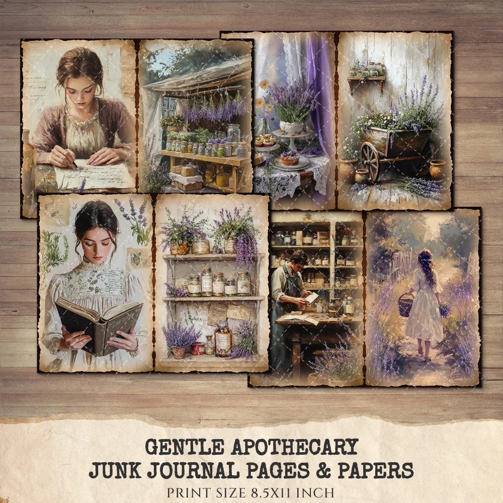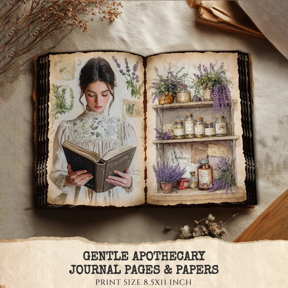 Gentle Apothecary Junk Journal Pages & Papers – Vintage Herb Jars, Botanical Printable, Lavender Scrapbook, Rosemary, Digital Download
