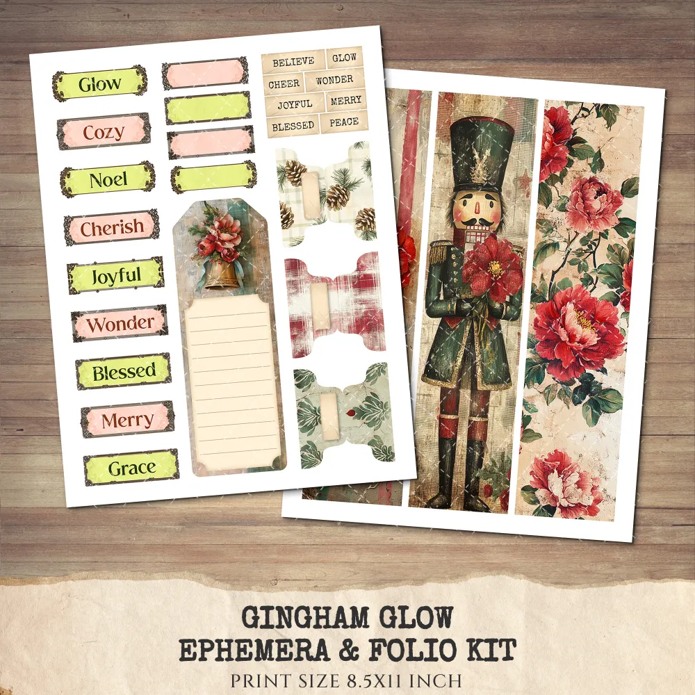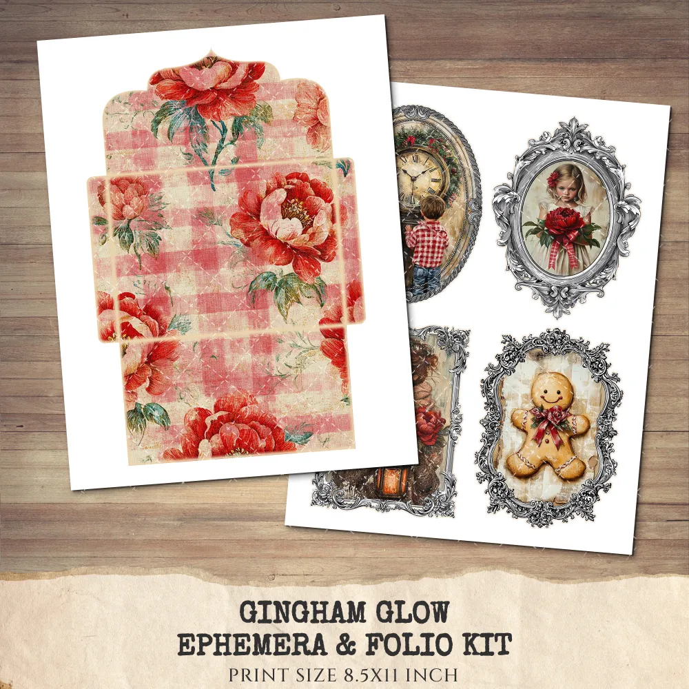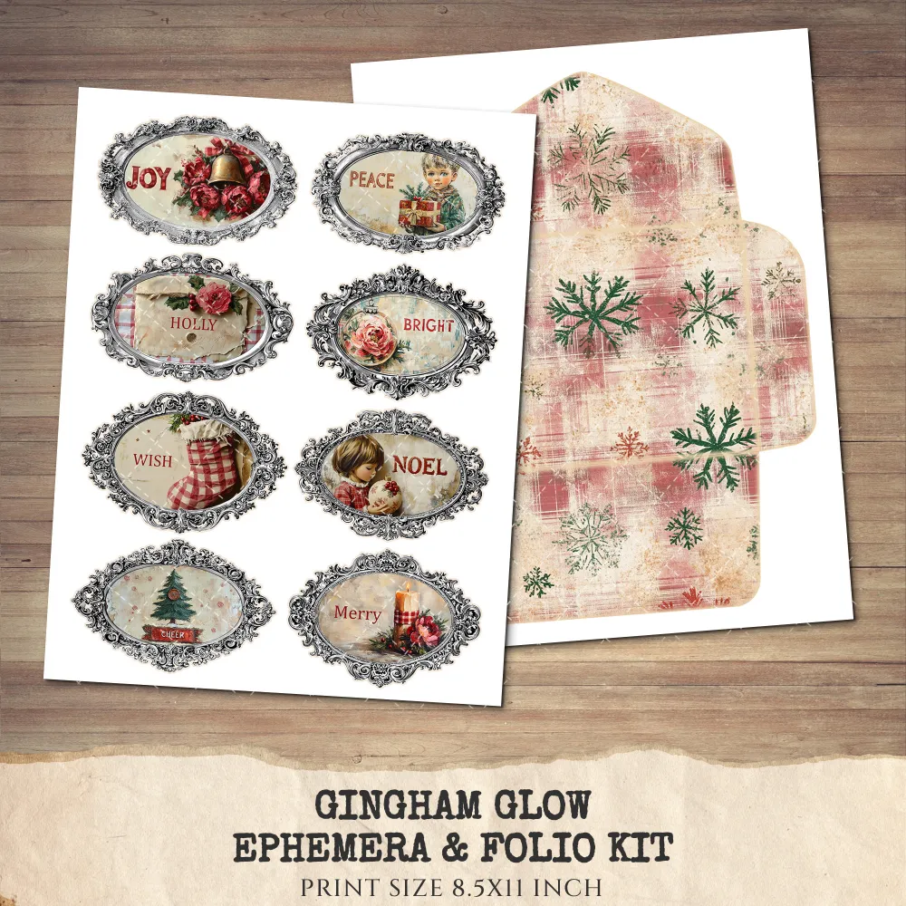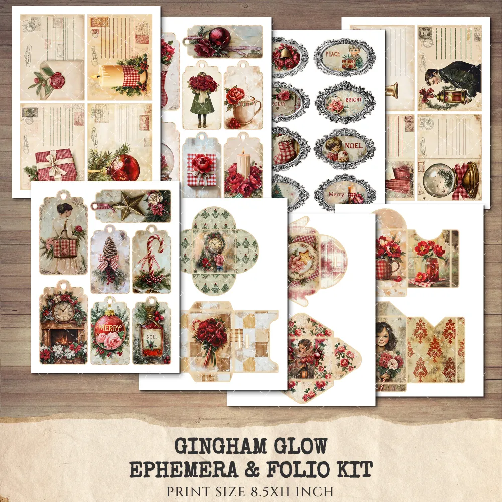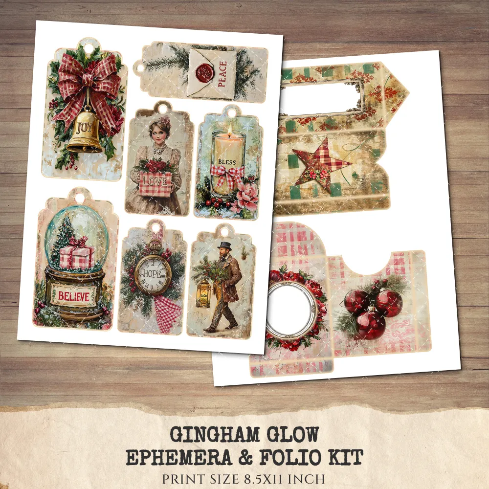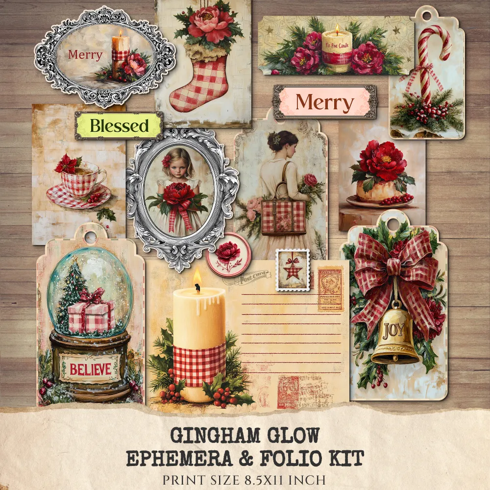 Gingham Glow Ephemera & Folio Kit – Plaid Holiday, Christmas, Floral Printables, Magical, Festive Art, Xmas Tags, kits, Digital Download