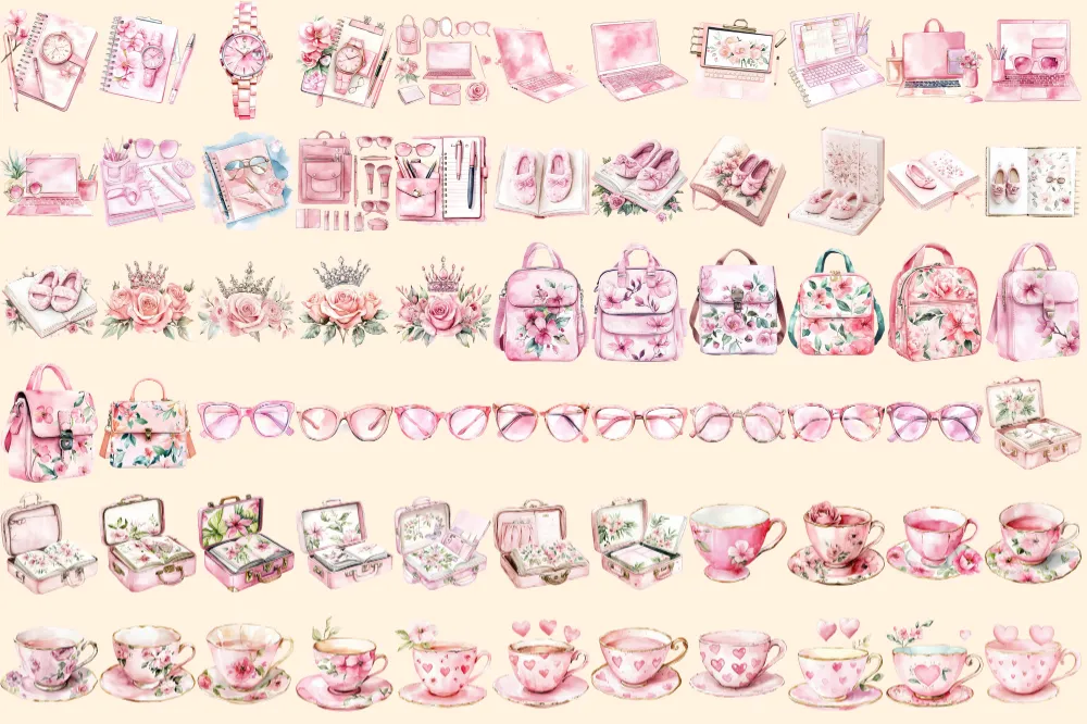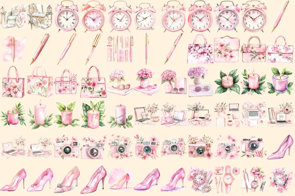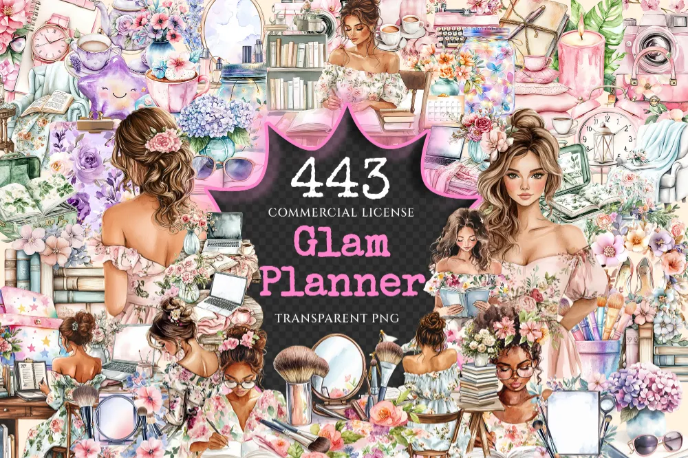 Glam Planner Watercolor Clipart Bundle – 440+ transparent PNG, Trendy organizing graphics, Stylish designs, Commercial use, Digital download