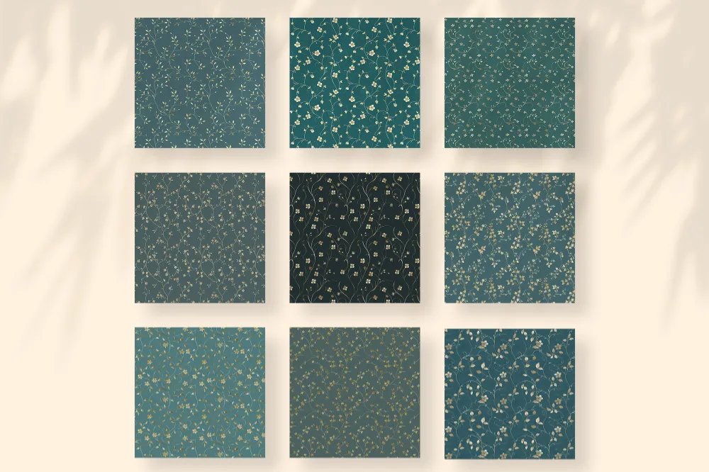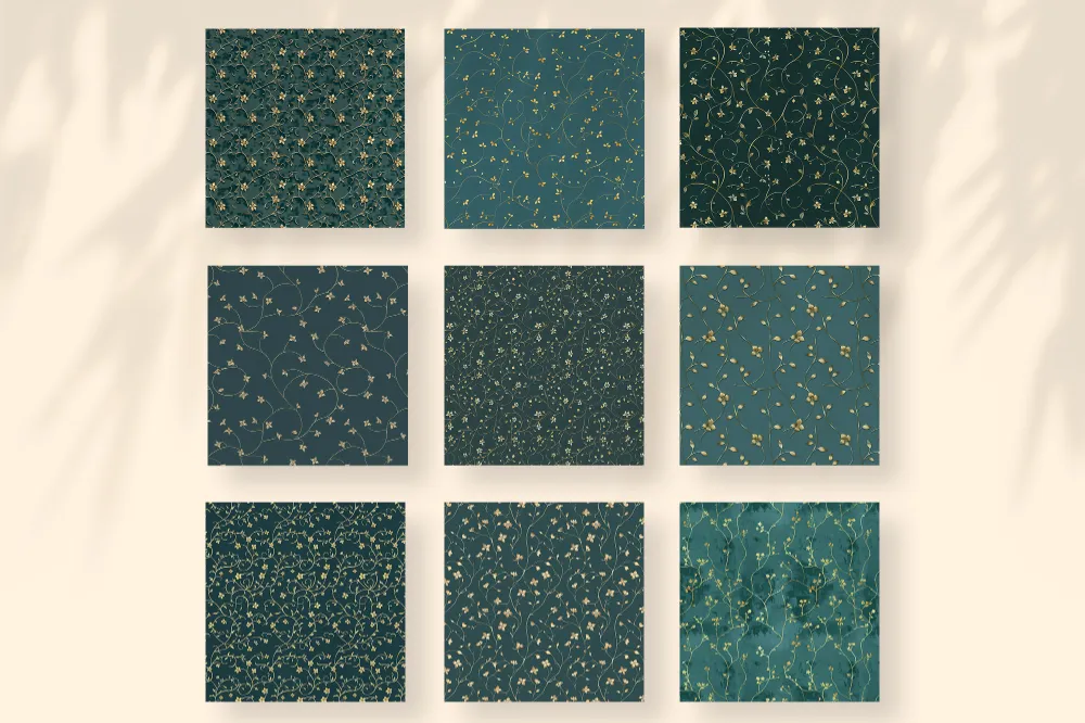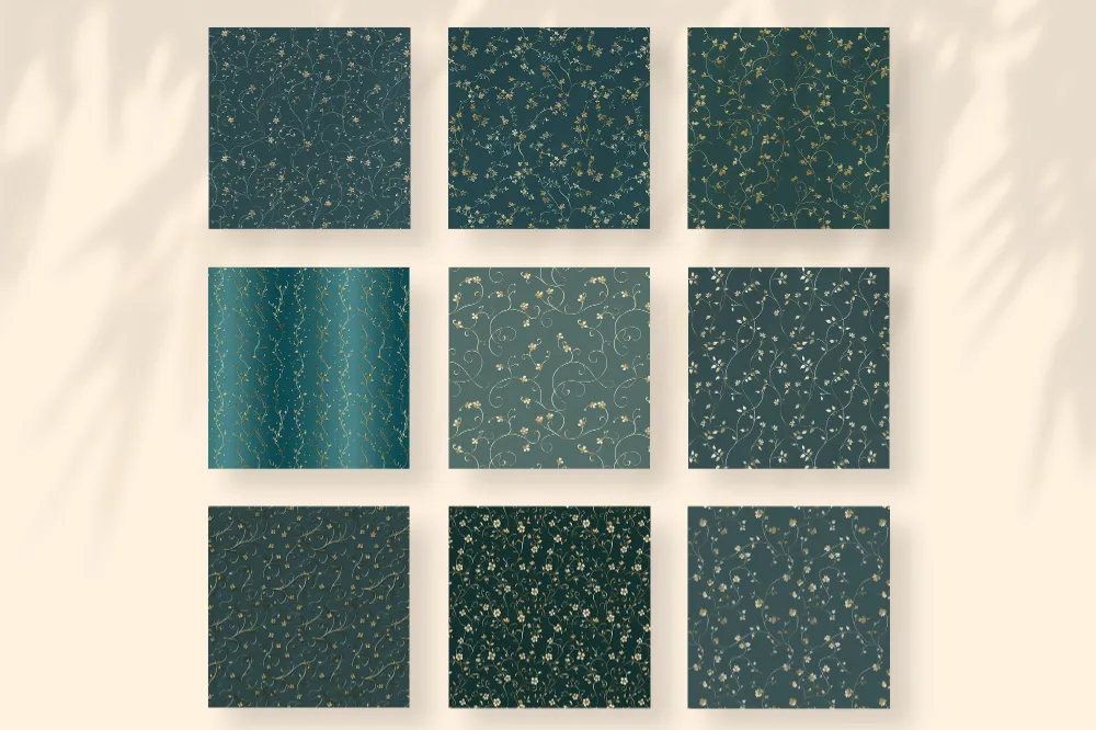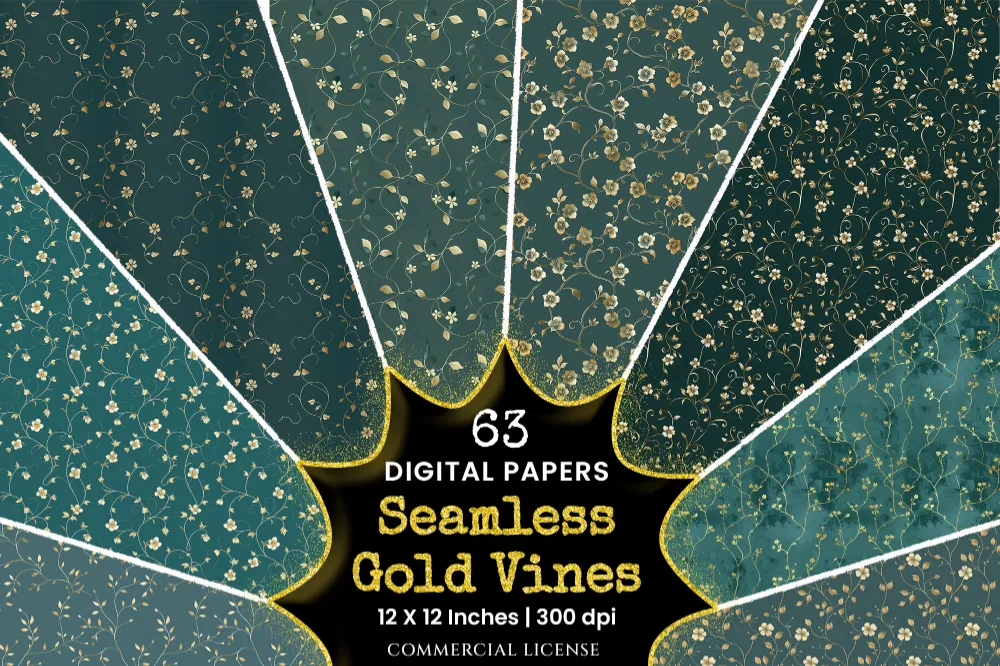 Gold Vines Flowers Seamless Digital Paper – 63 Scrapbook patterns, Vine flower textures, Gold leaf pattern, Commercial use, Digital download