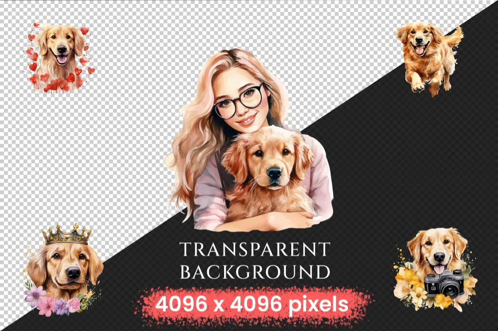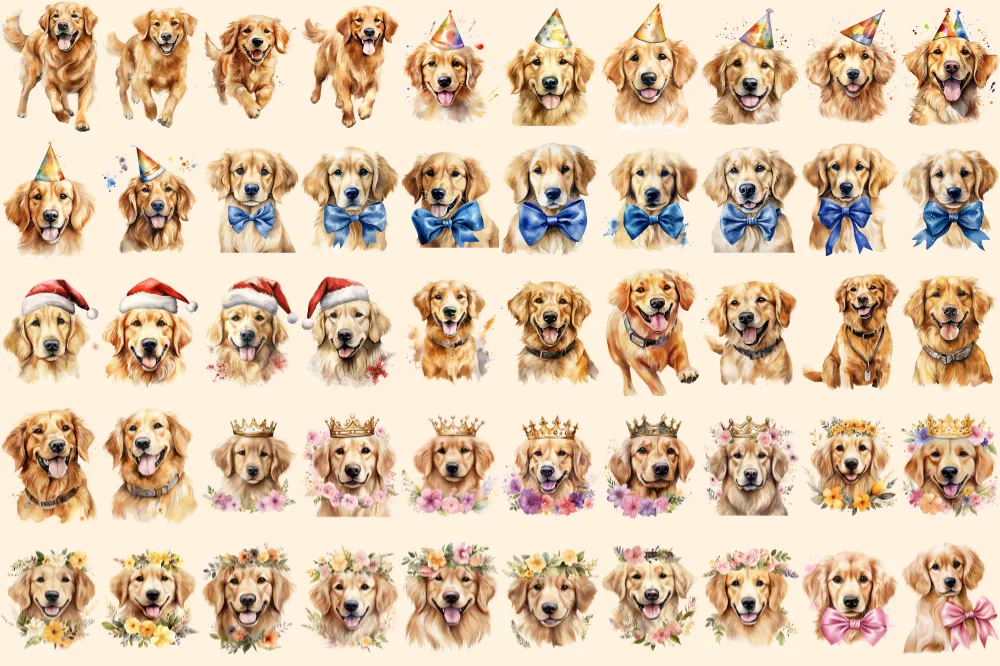 Golden Retrievers Watercolor Clipart Bundle – 345+ transparent PNG, Playful dog graphics, Golden pup art, Commercial use, Digital download