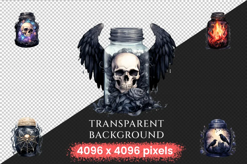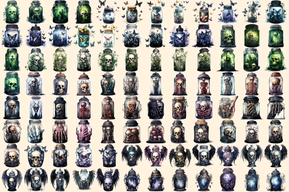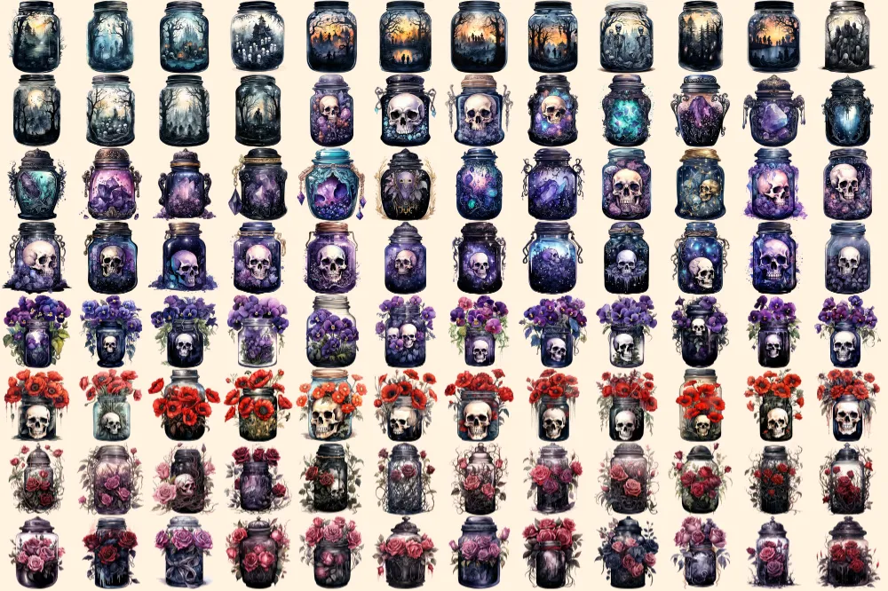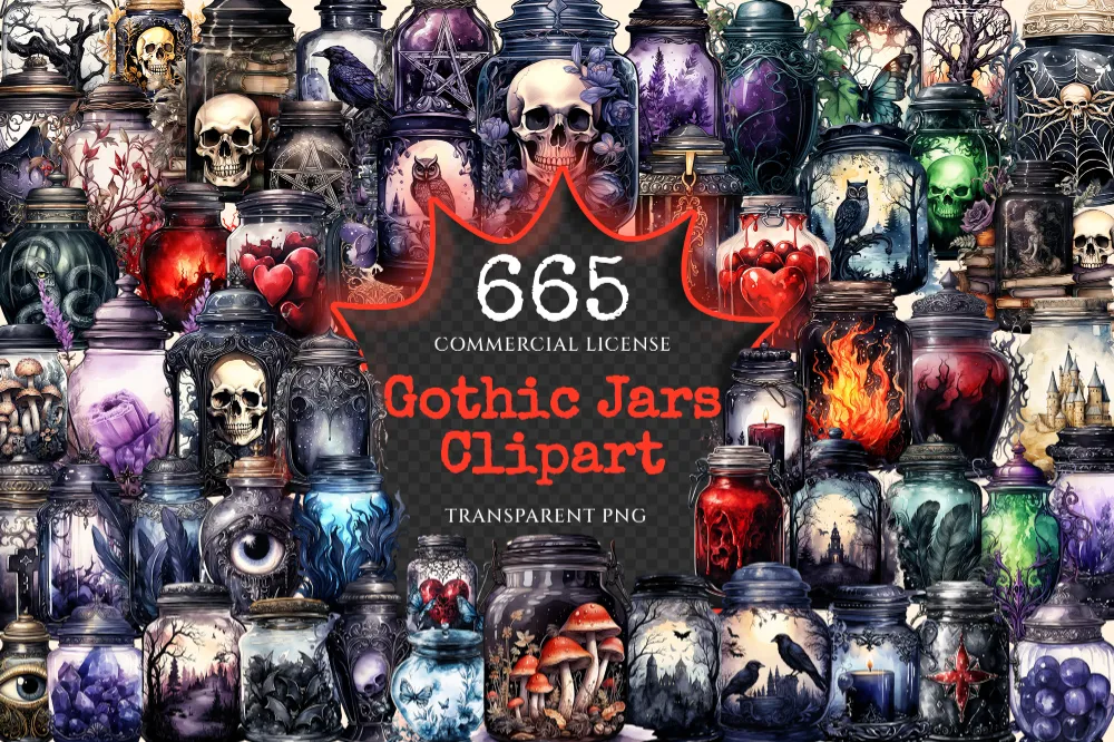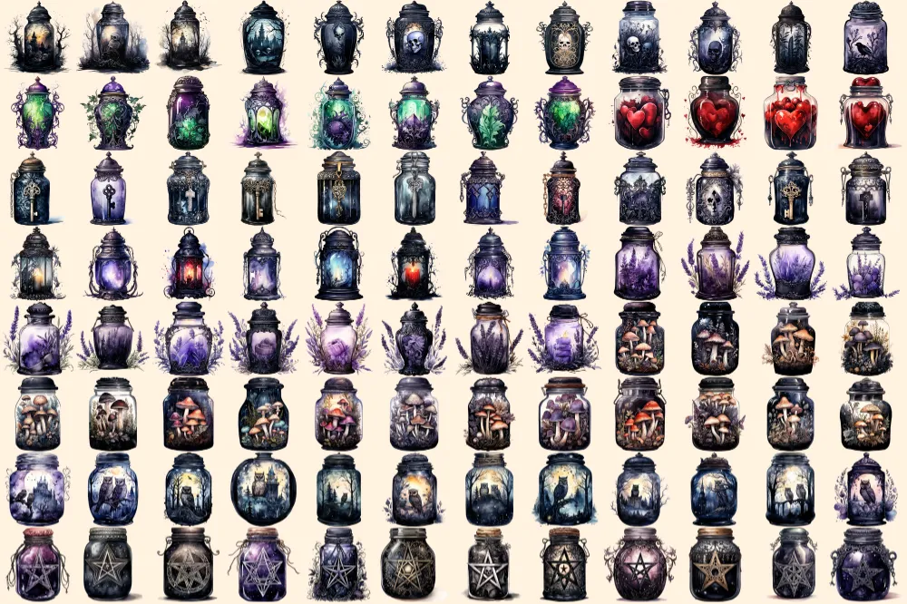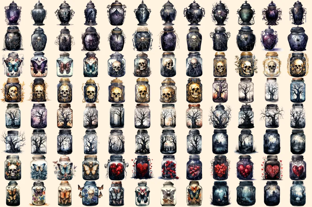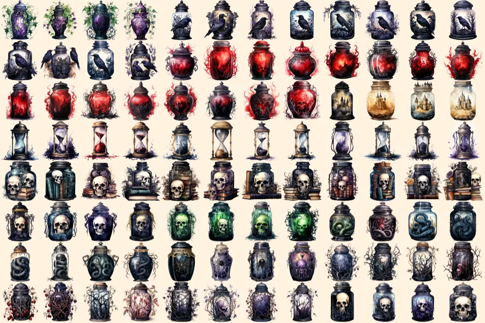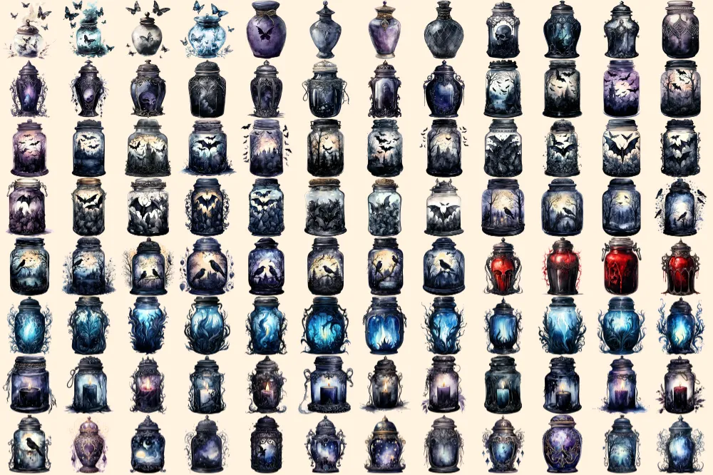 Gothic Jars Watercolor Clipart Bundle – 660+ transparent PNG, Elegant dark illustrations, Mystic jar png, Commercial use, Digital download