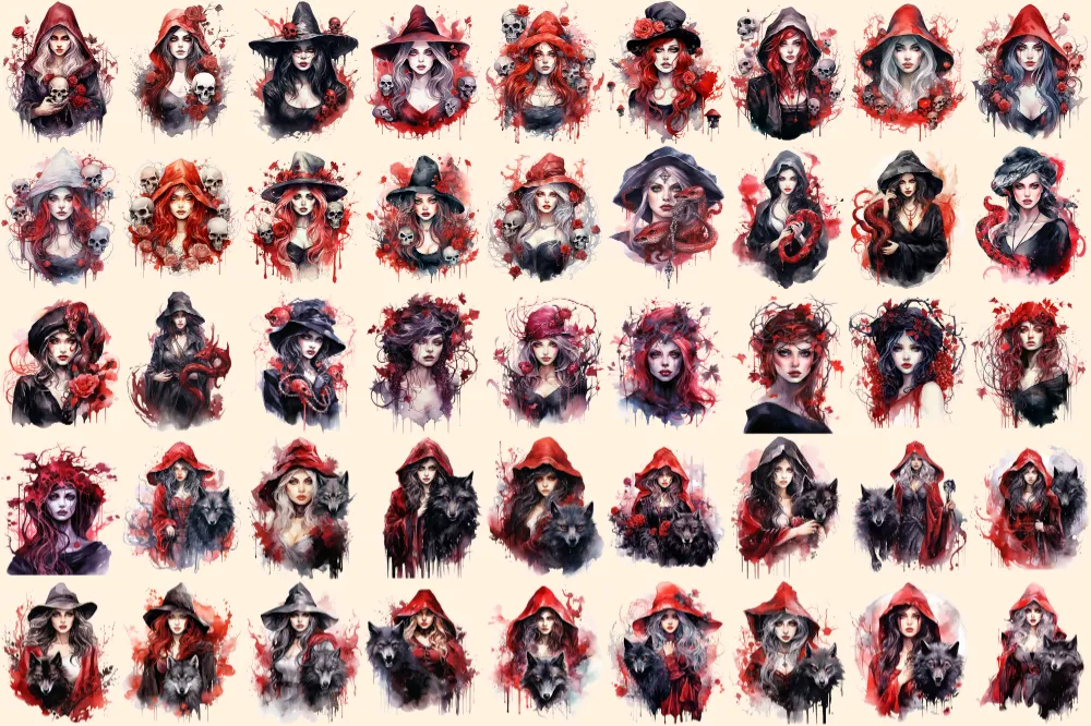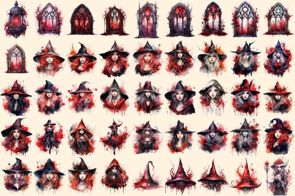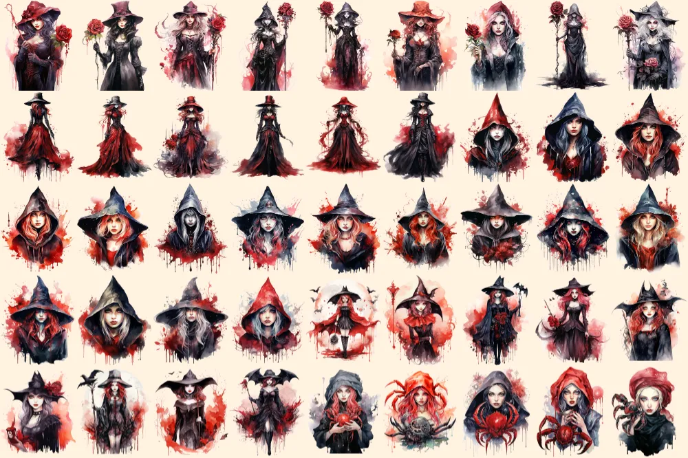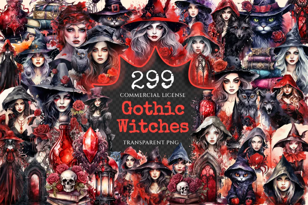 Gothic Witches Watercolor Clipart Bundle – 295+ transparent PNG, Fantasy fairytale graphics, Enchanting png, Commercial use,Digital download