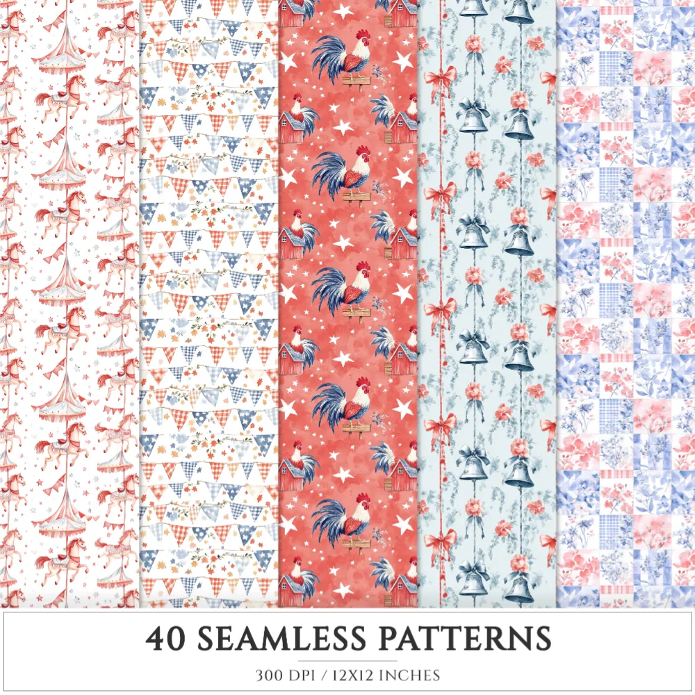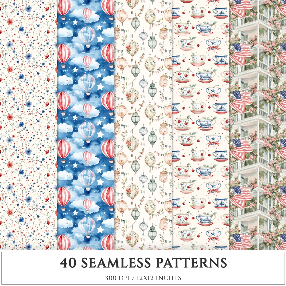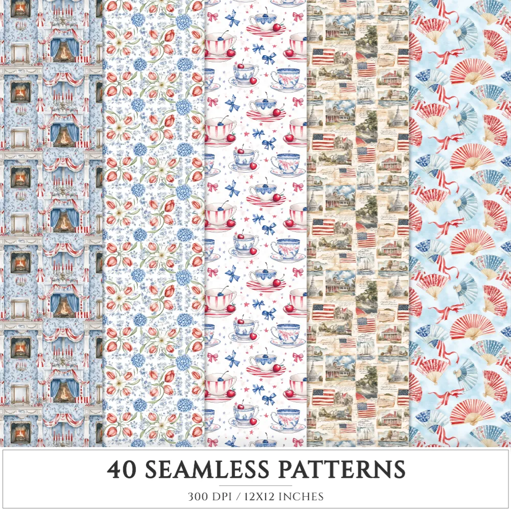 Grandmillennial Patriotic Seamless Patterns, Patriotic JPEG, 4th of july pattern, Red white blue repeating pattern, Digital scrapbook paper