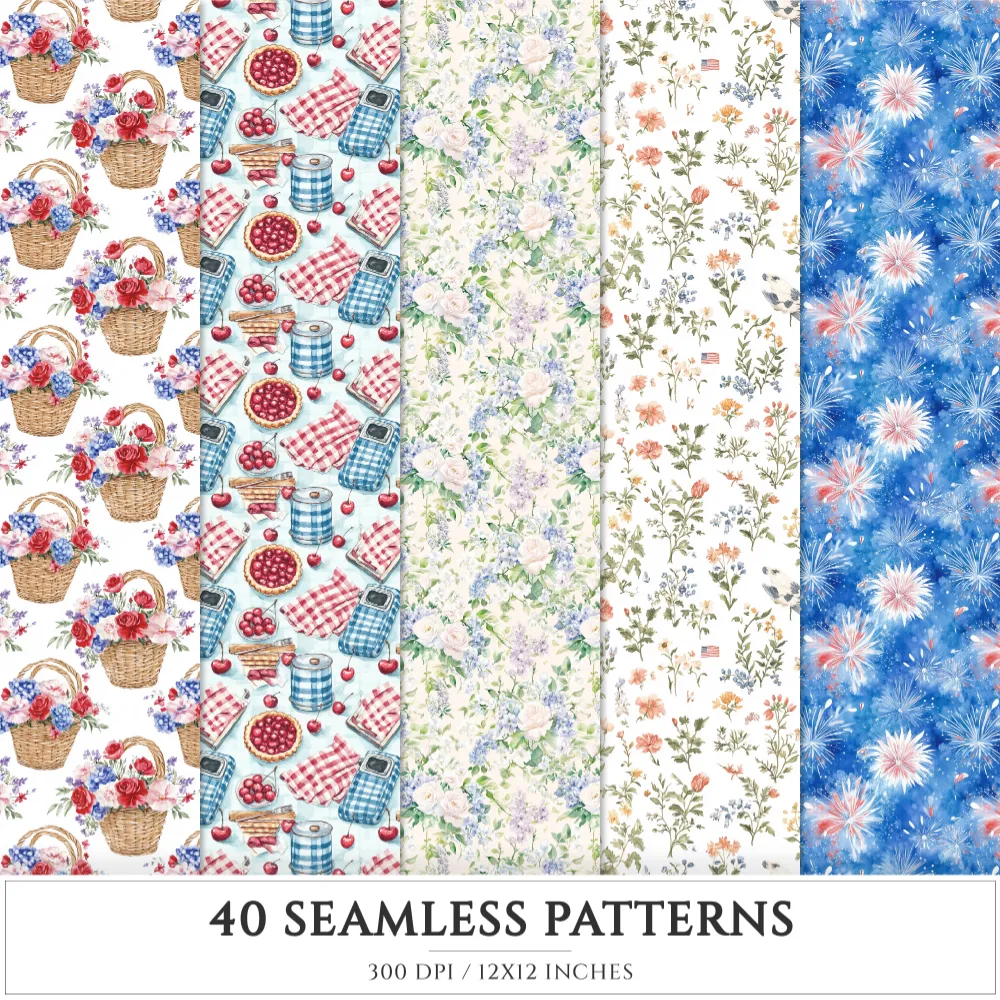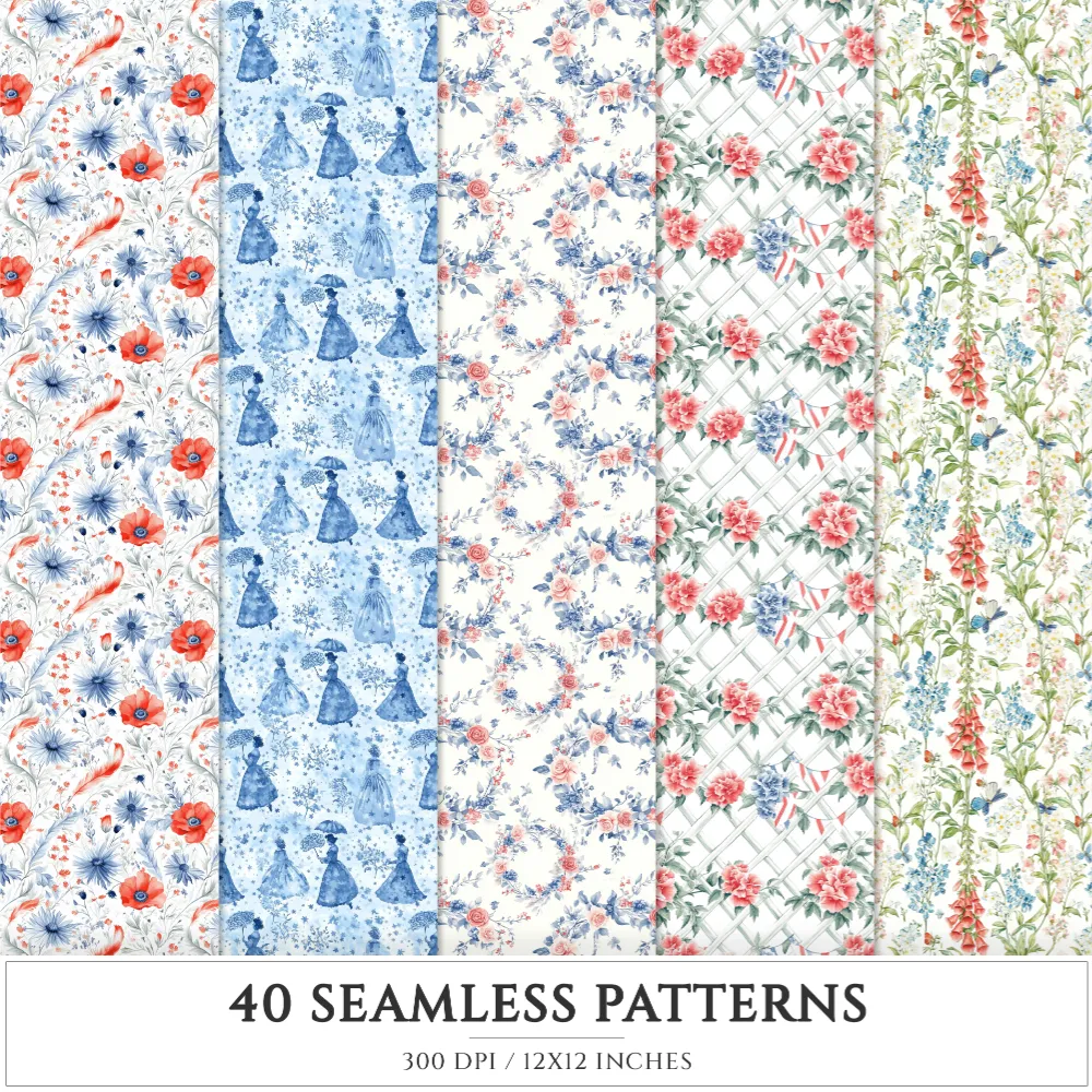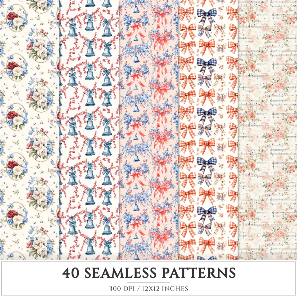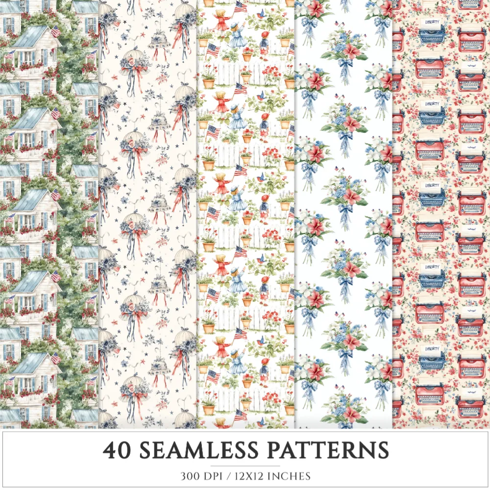 Grandmillennial Patriotic Seamless Patterns, Patriotic JPEG, 4th of july pattern, Red white blue repeating pattern, Digital scrapbook paper
