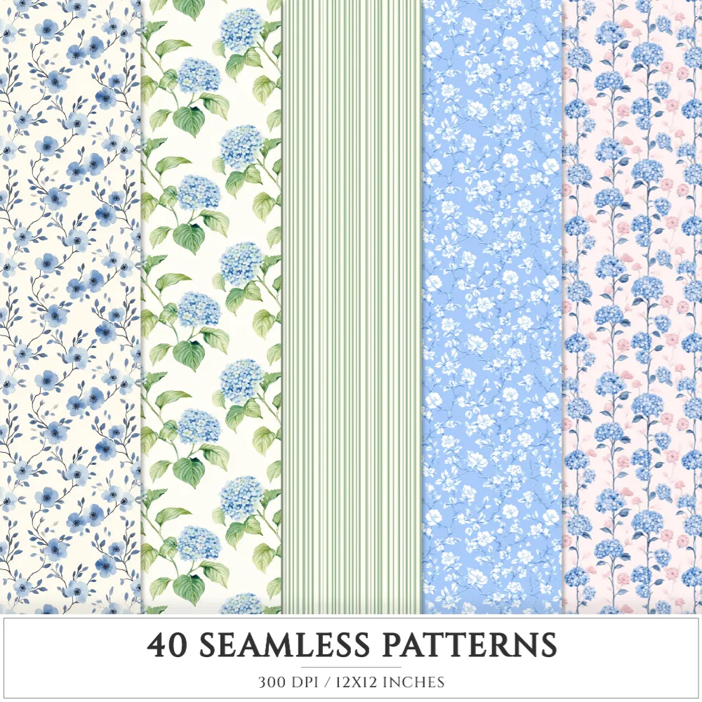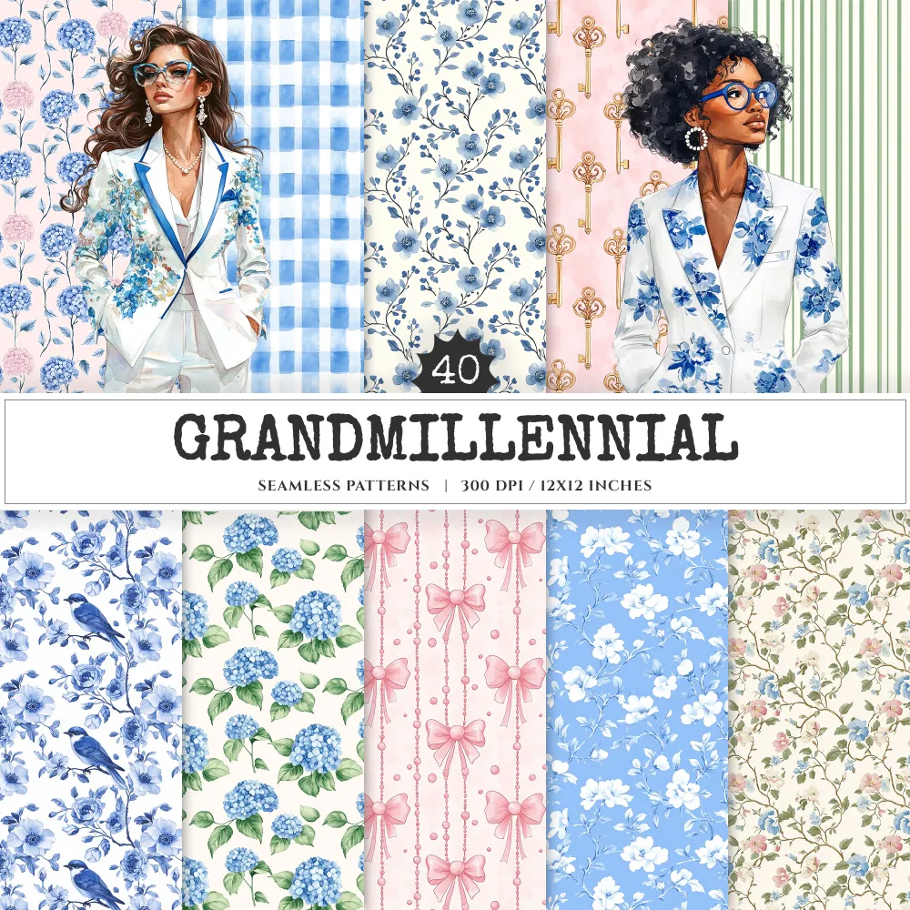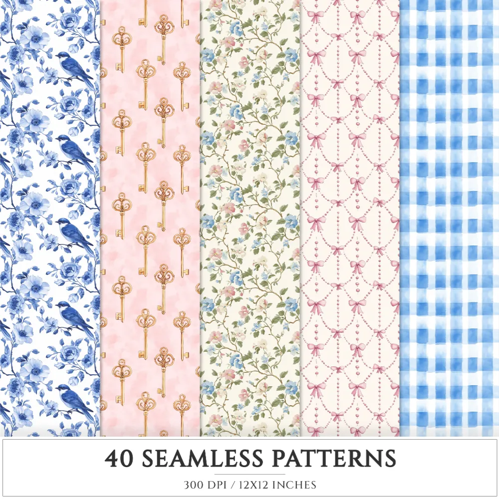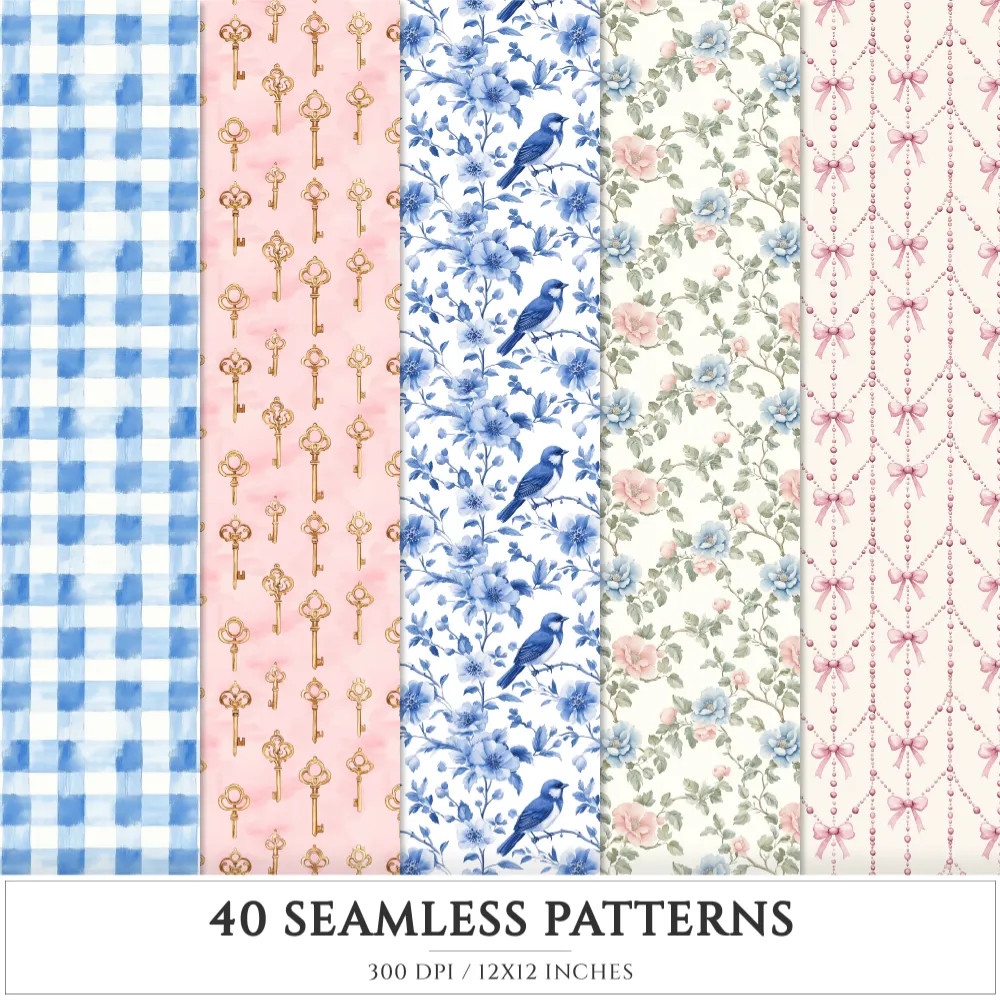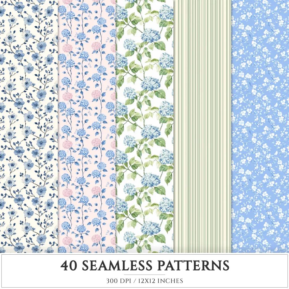 Grandmillennial Seamless Patterns, Chinoiserie JPEG, Pastel floral pattern, Stripes and plaid repeating pattern, Digital scrapbook paper