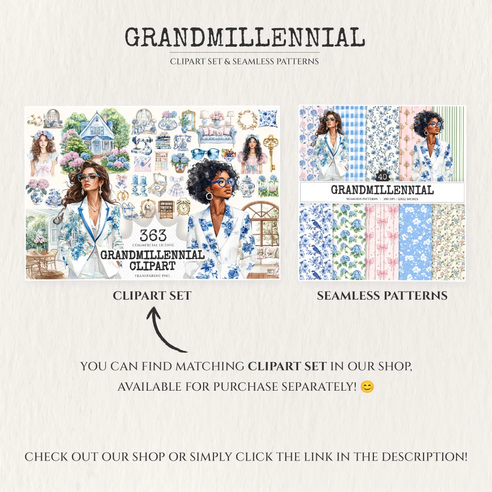 1. Grandmillennial Watercolor Clipart Set (363 PNG files):