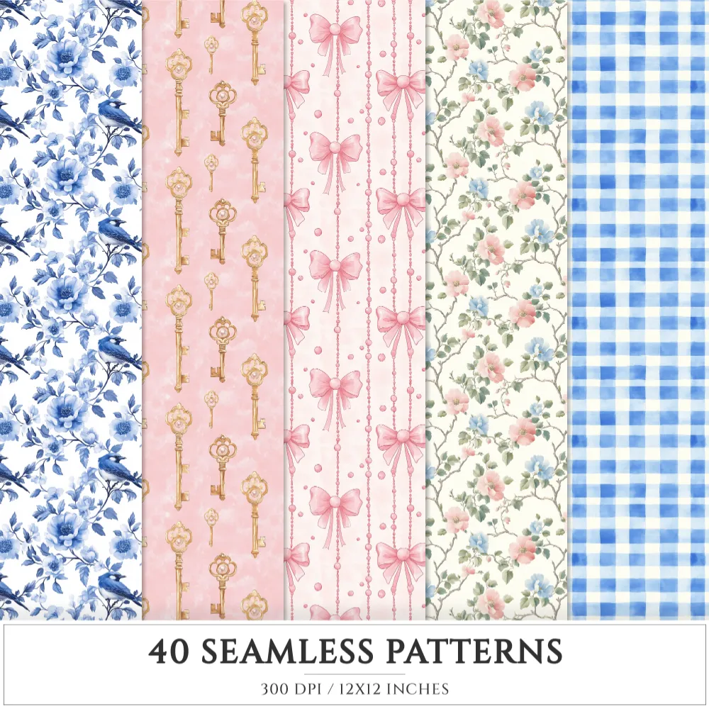 Grandmillennial Seamless Patterns, Chinoiserie JPEG, Pastel glitter pattern, Stripes and plaid repeating pattern, Digital scrapbook paper