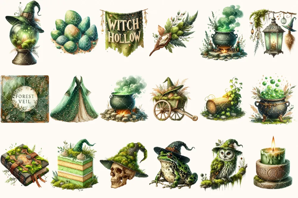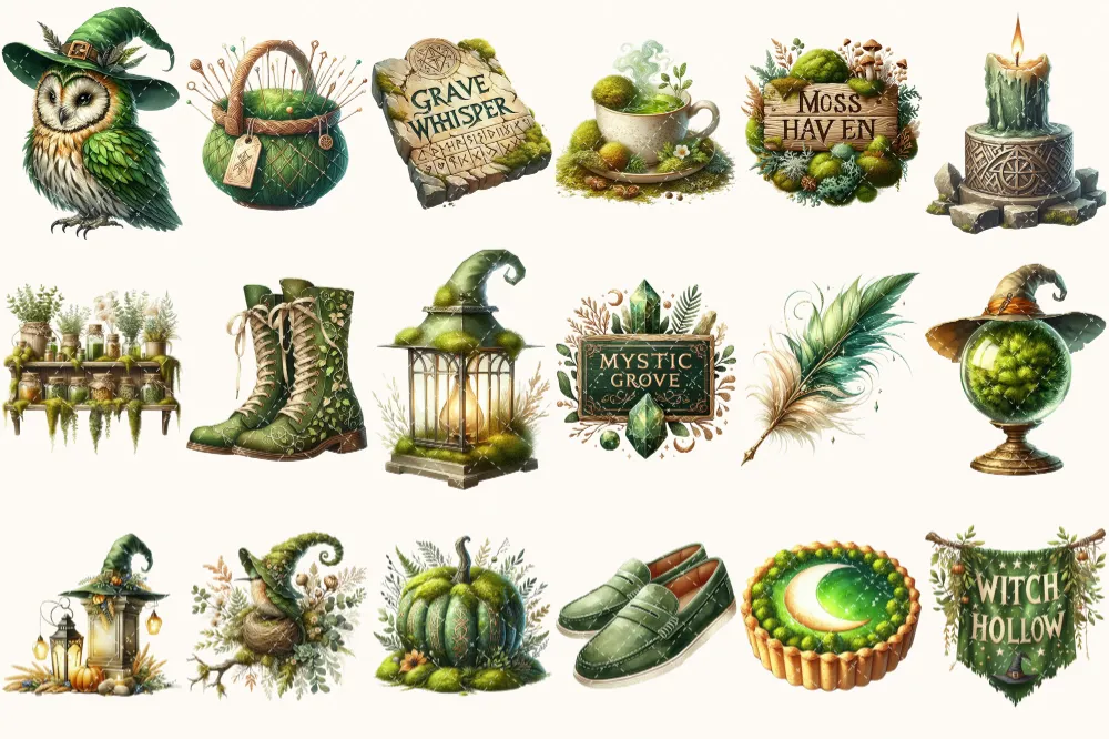 Gravemoss Witch Clipart Mini Set – Fantasy Clipart, Mystic forest graphics, Witchy fantasy art, Moss Art, Magical Images, Digital download