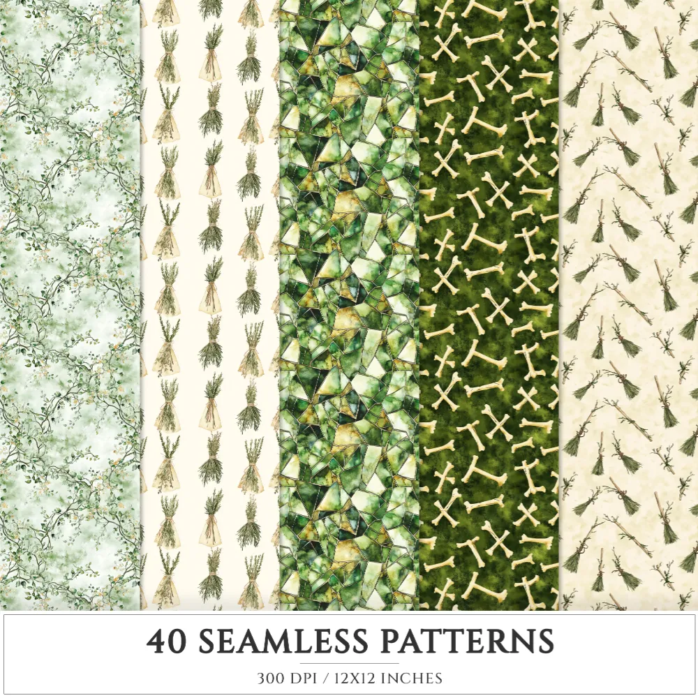 Gravemoss Witch Seamless Patterns, Mystical forest JPEG, Cauldron pattern, Grave, Moss and fern repeating pattern, Digital scrapbook paper