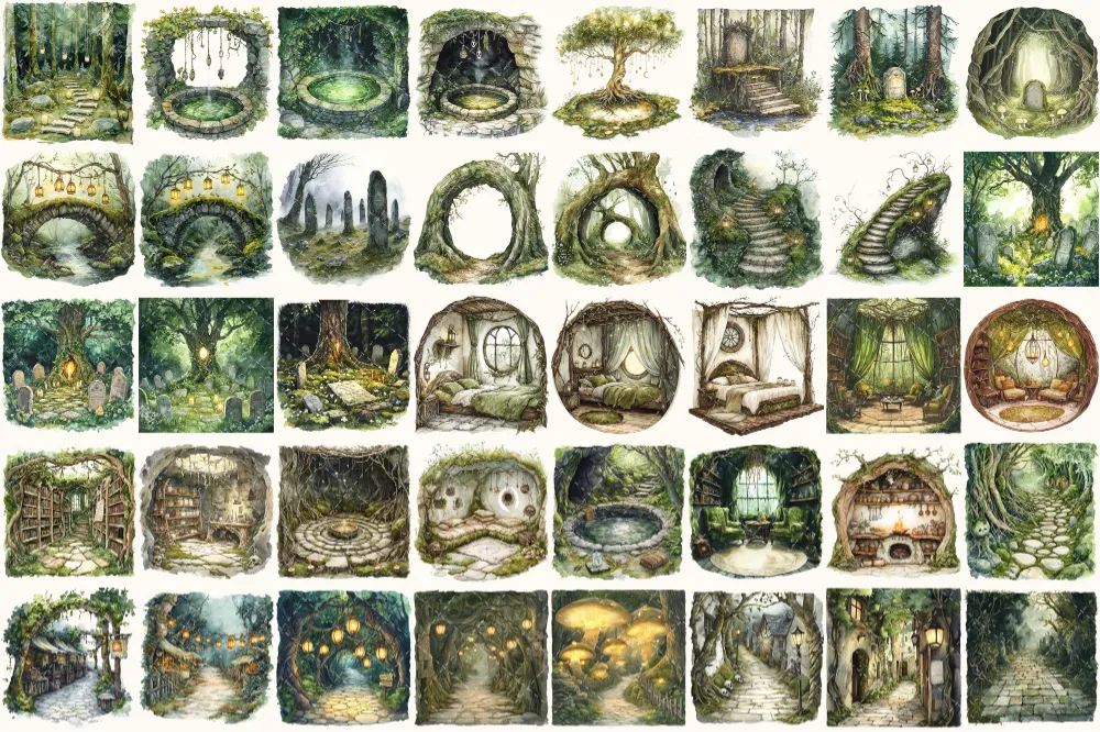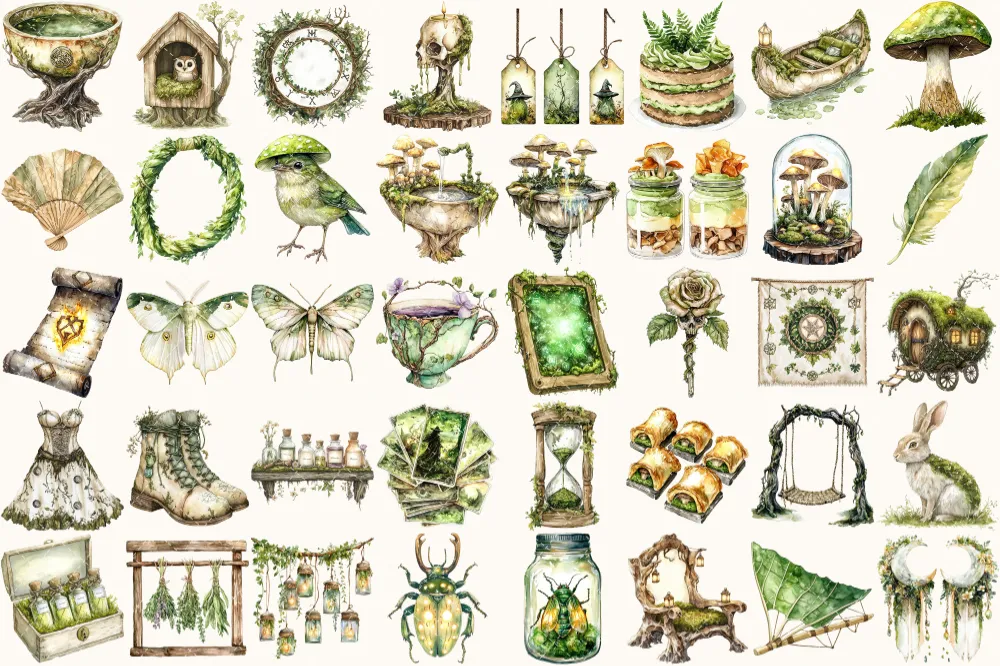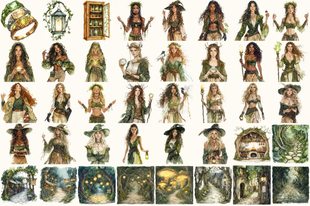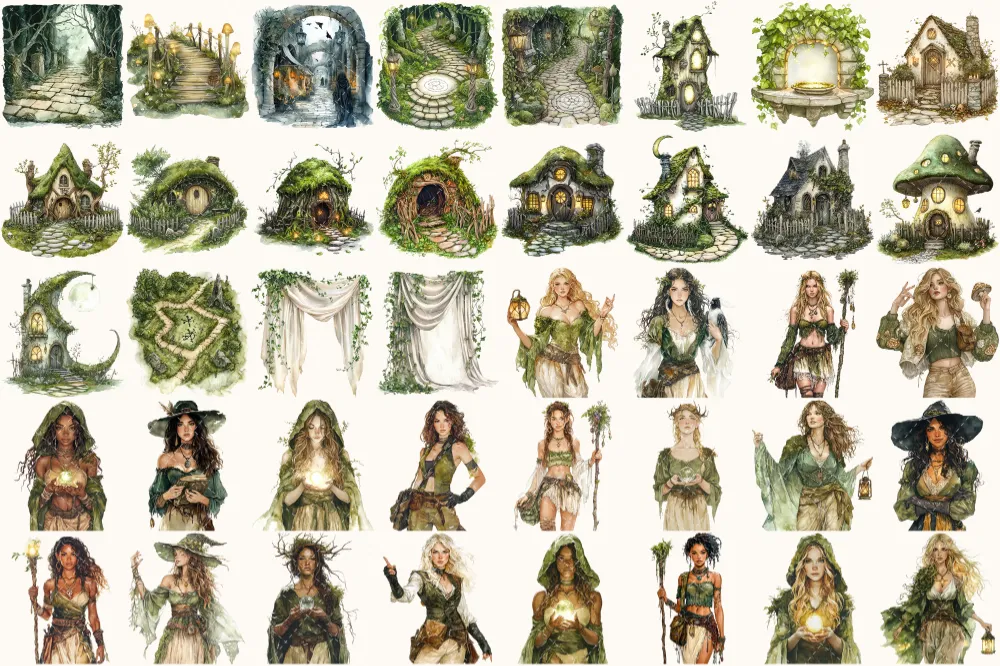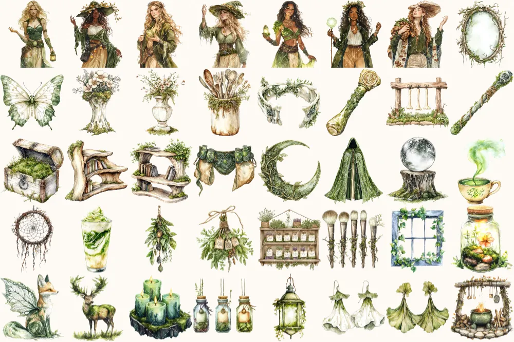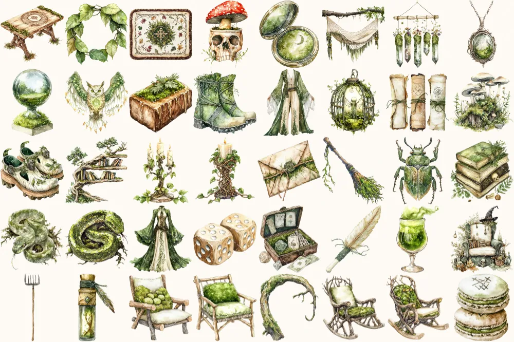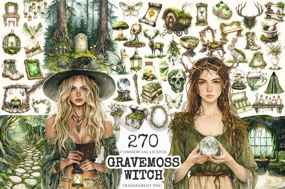 Gravemoss Witch Watercolor Clipart Set – 265+ transparent PNG, Mystic forest graphics, Witchy fantasy art, Commercial use, Digital download
