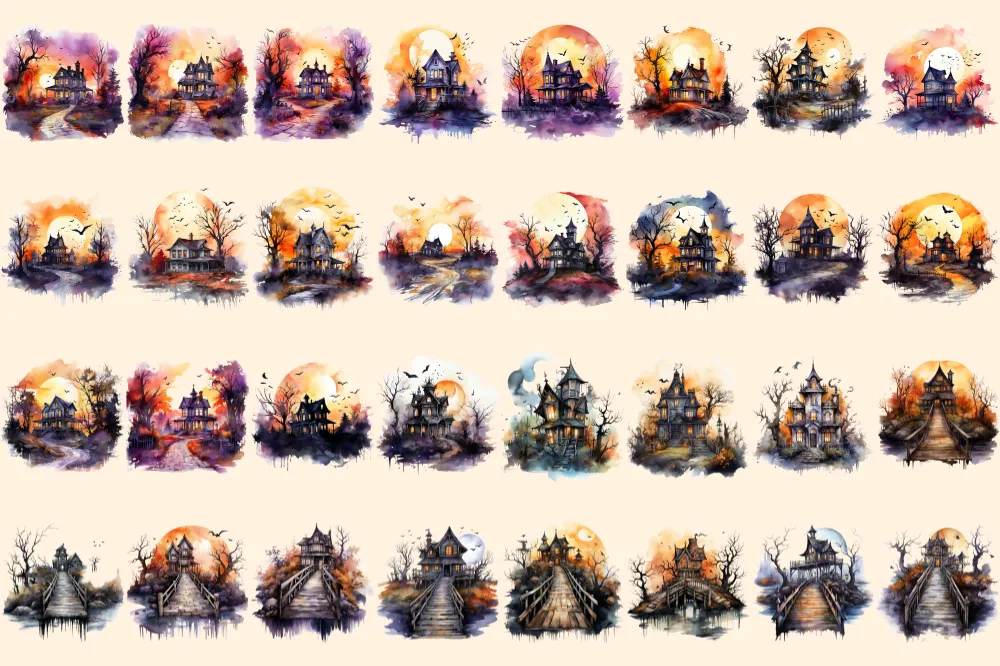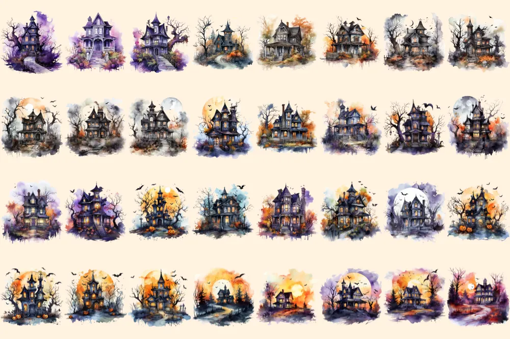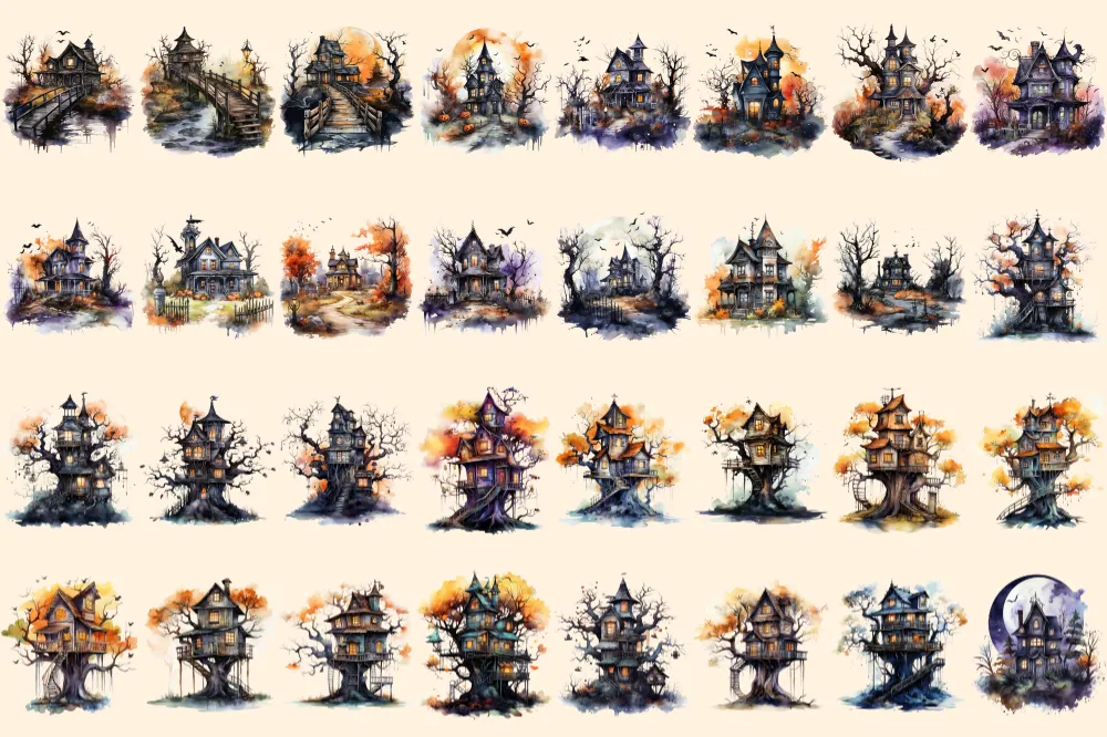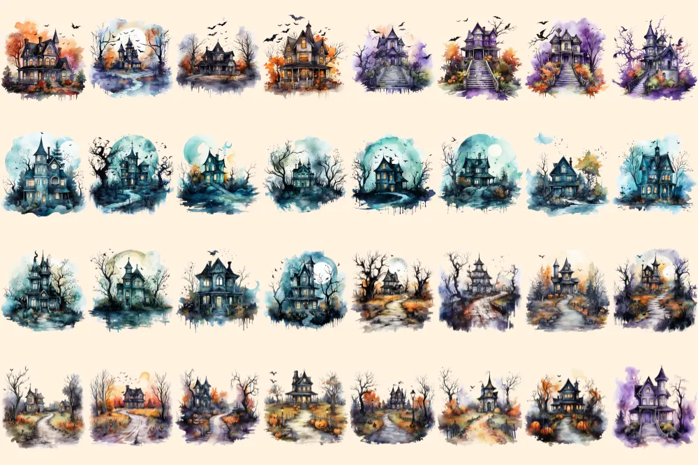 Halloween Houses Watercolor Clipart Bundle – 220+ transparent PNG, Eerie mansion images, Haunted house png, Commercial use, Digital download