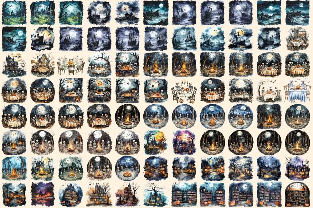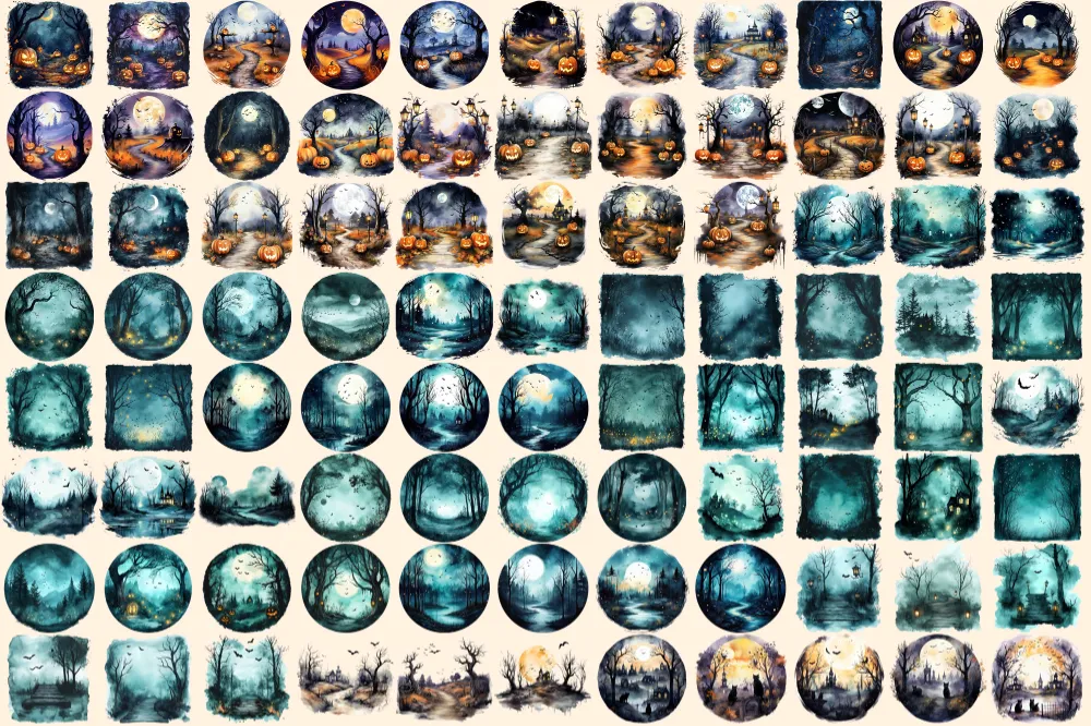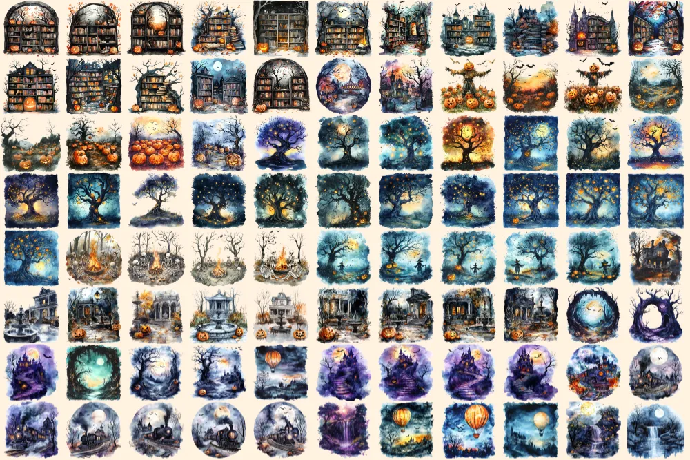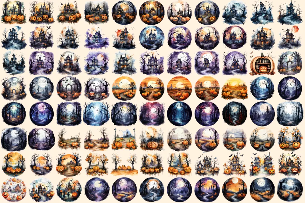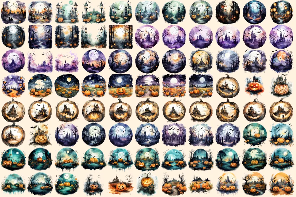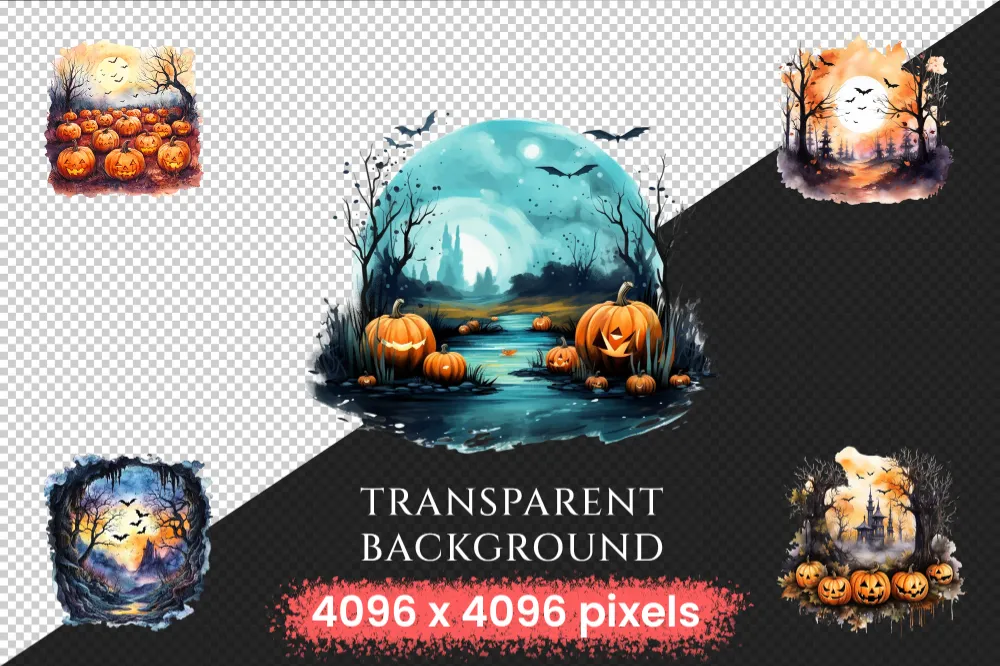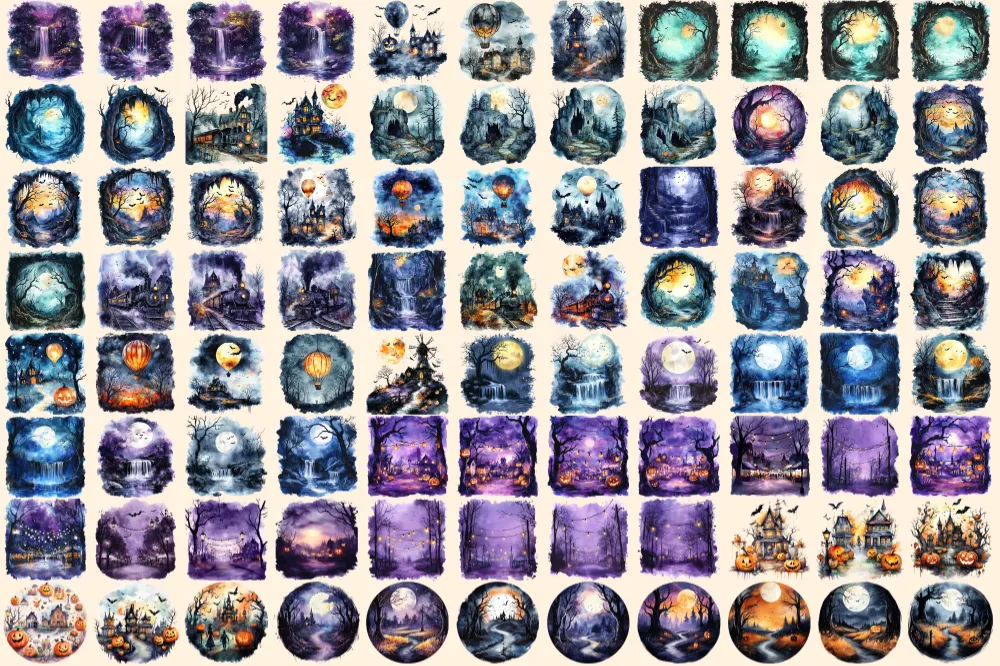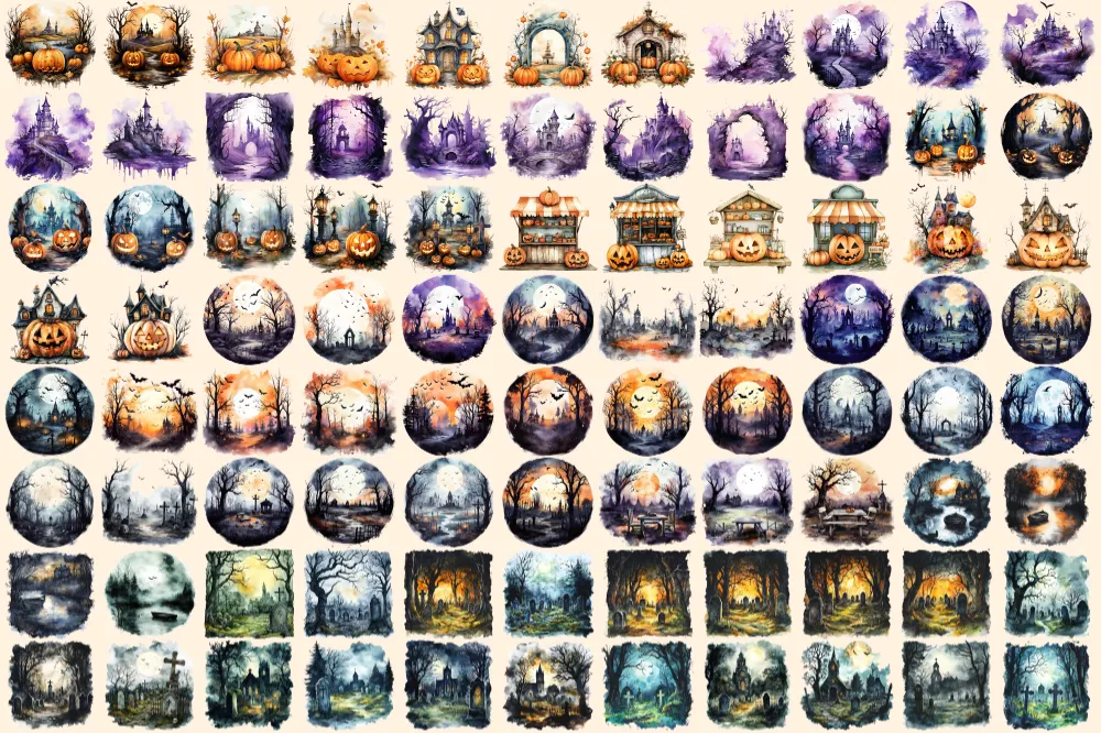 Halloween Landscapes Watercolor Clipart Bundle – 600+ transparent PNG, Haunted illustrations, Eerie images, Commercial use, Digital download