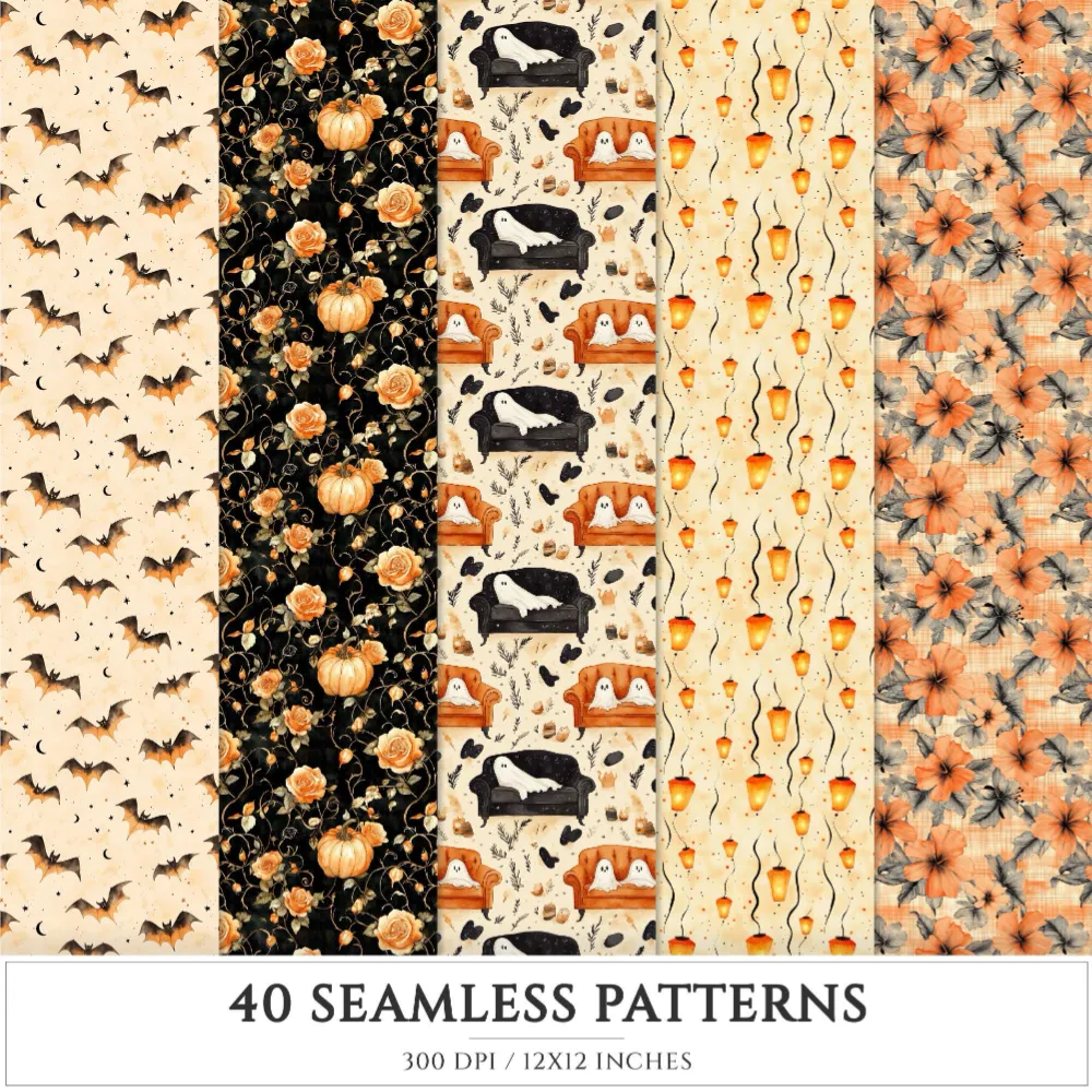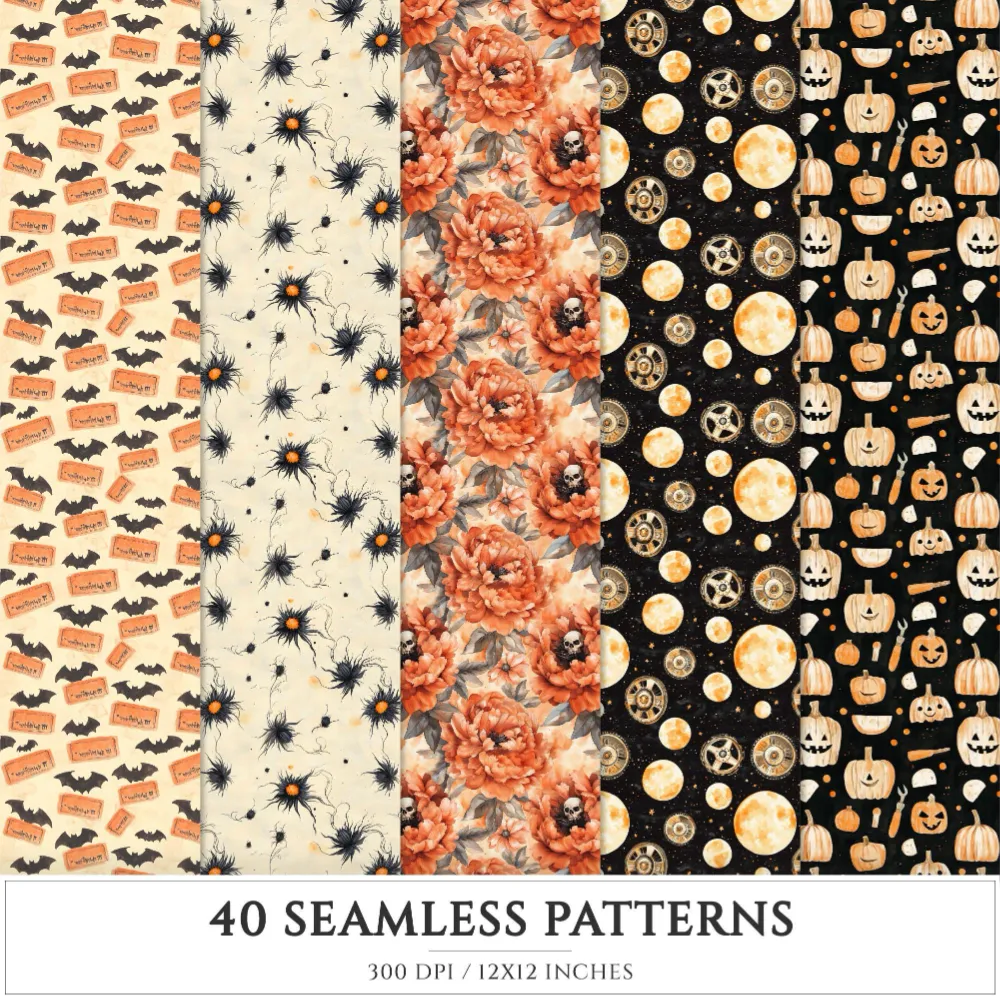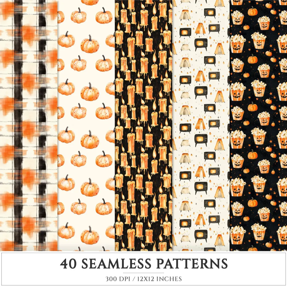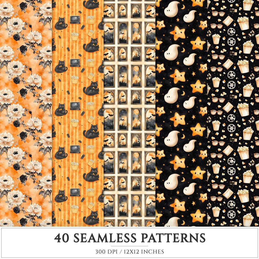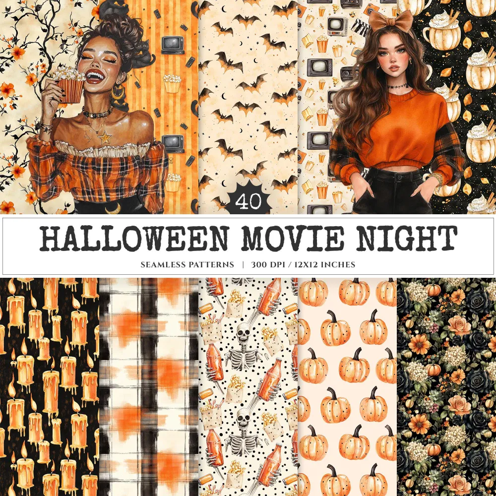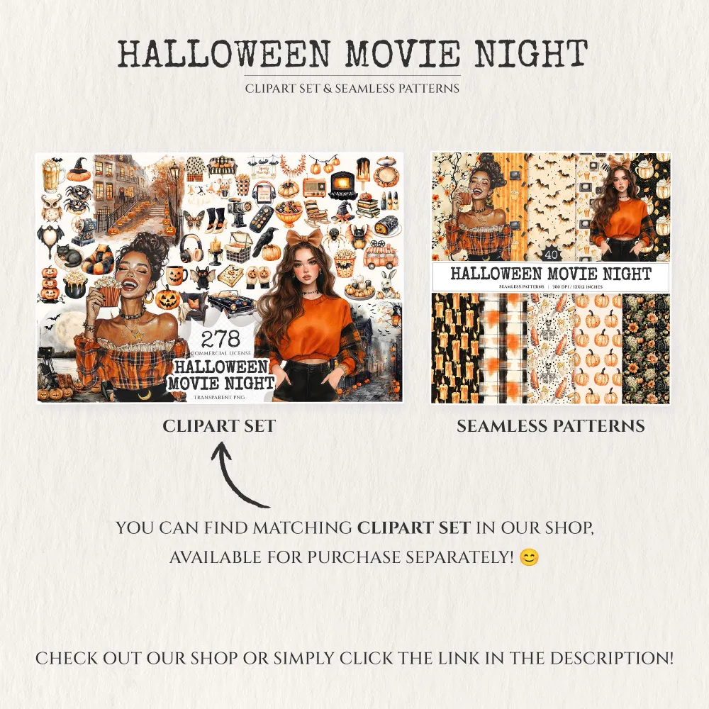 Halloween Movie Night Seamless Patterns, Spooky night JPEG, Popcorn pattern, Pumpkin, Skeleton repeating pattern, Digital scrapbook paper