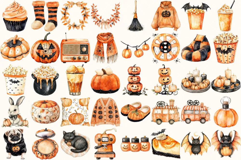 Halloween Movie Night Watercolor Clipart Set – 275+ transparent PNG, Hallows eve graphics, Spooky night art, Commercial use, Digital download
