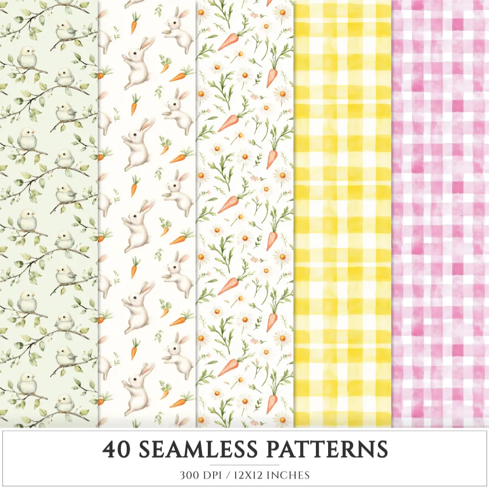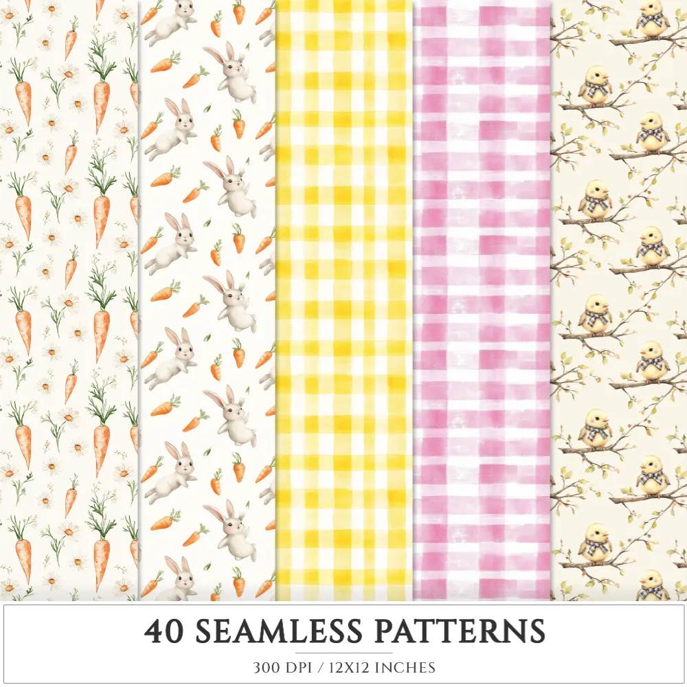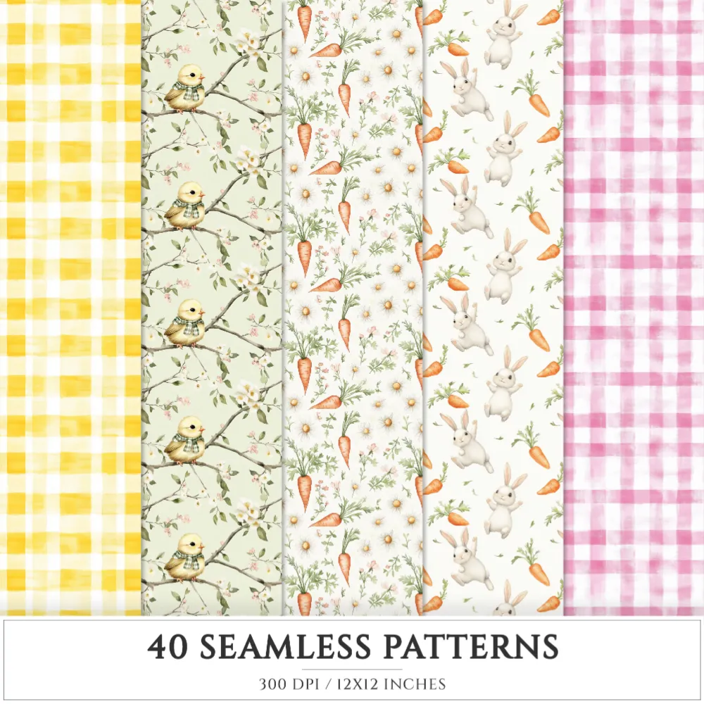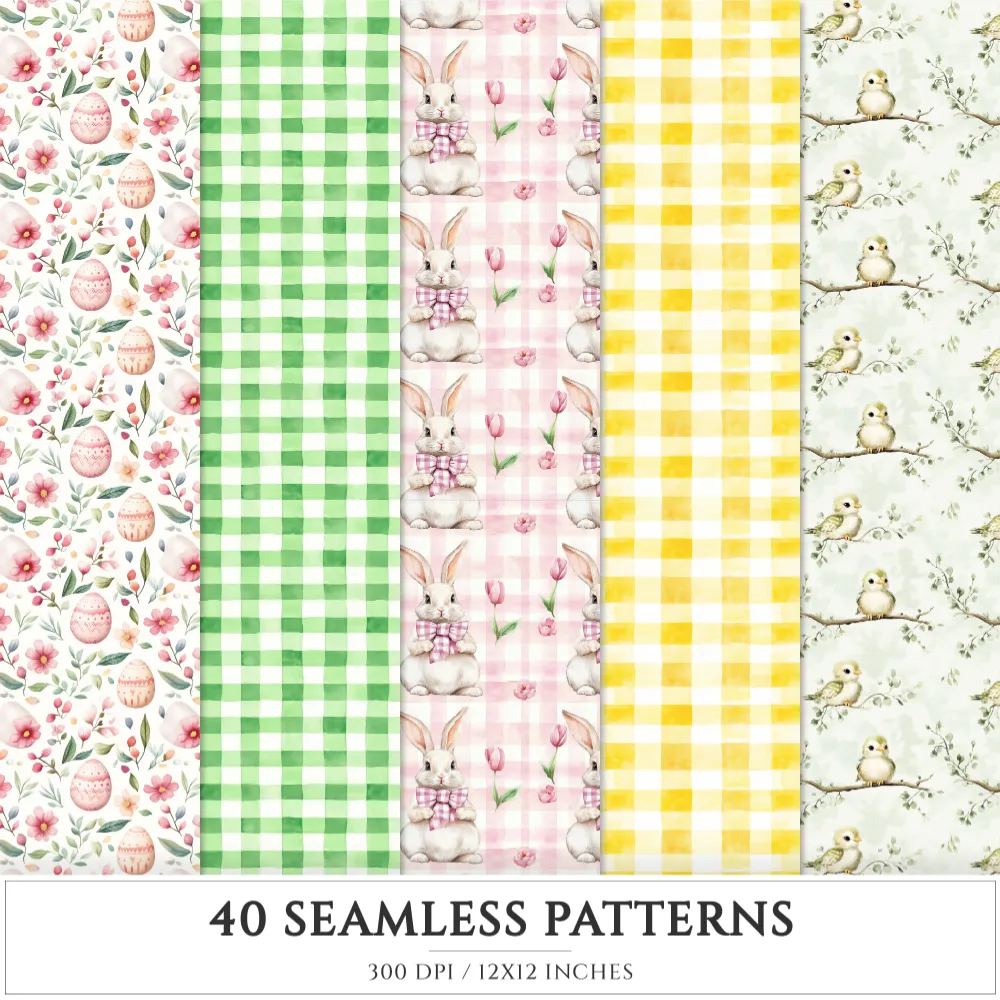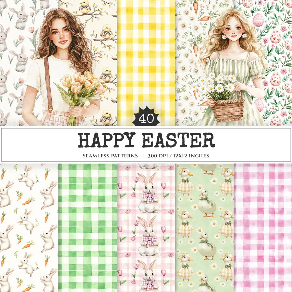Happy Easter Seamless Patterns, Cozy floral easter JPEG, Checkered plaid pattern, Easter bunnies repeating pattern, Digital scrapbook paper