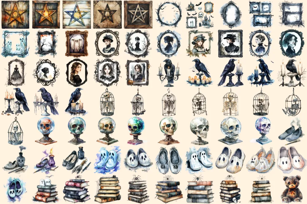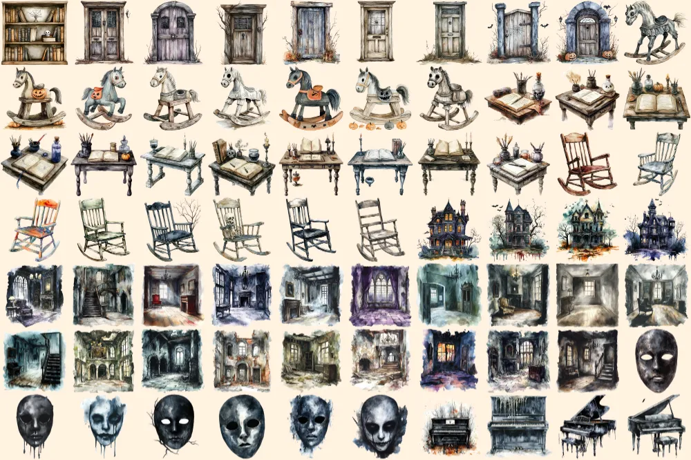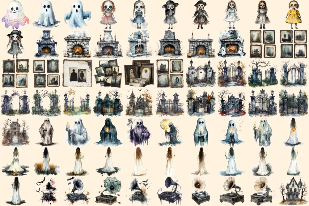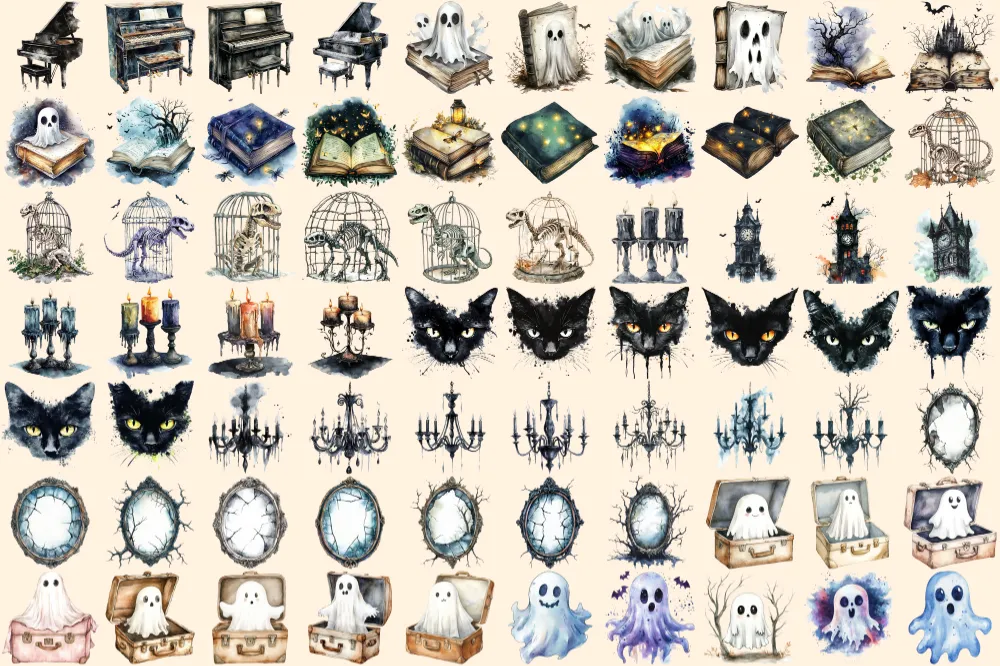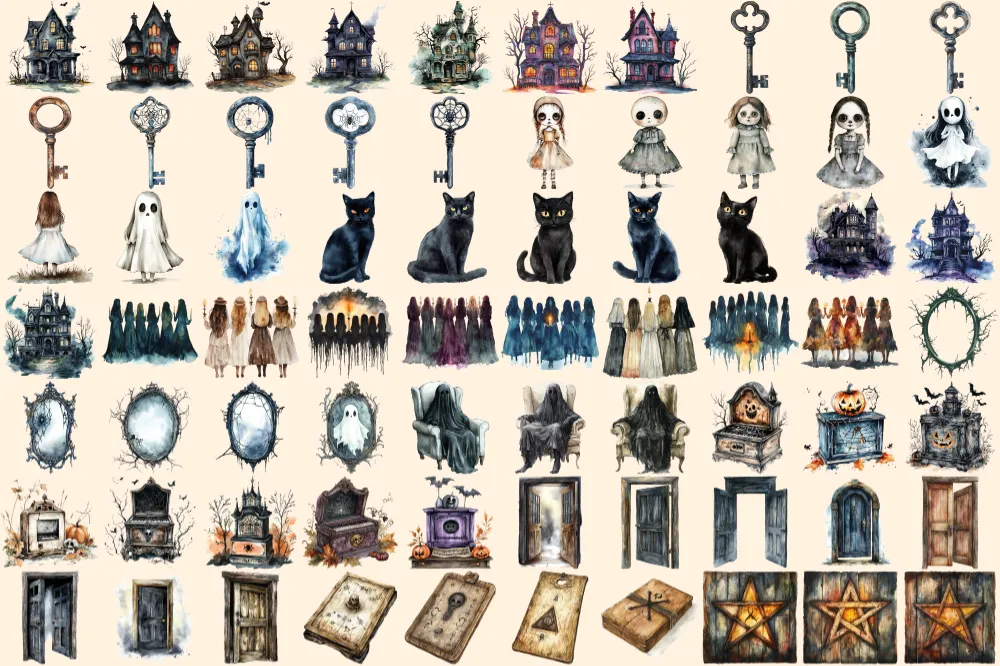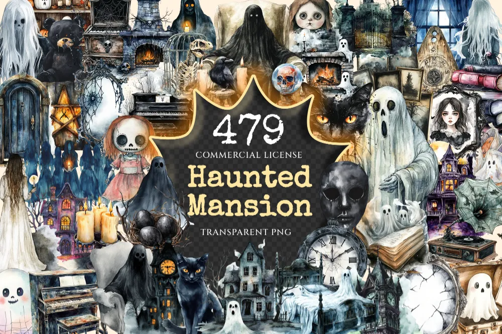 Haunted Mansion Watercolor Clipart Bundle – 475+ transparent PNG, Eerie house png, Ghostly spooky decor, Commercial use, Digital download