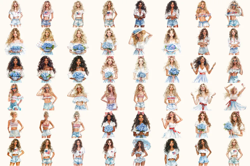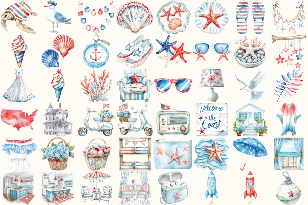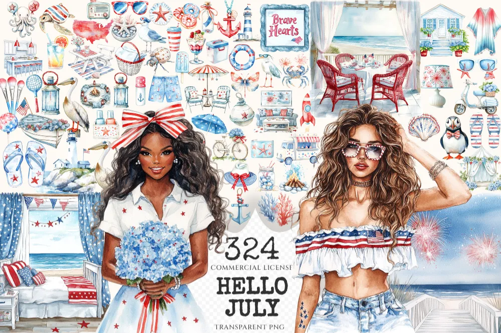 Hello July Watercolor Clipart Set – 320+ transparent PNG, Patriotic summer illustrations, 4th of july art, Commercial use, Digital download