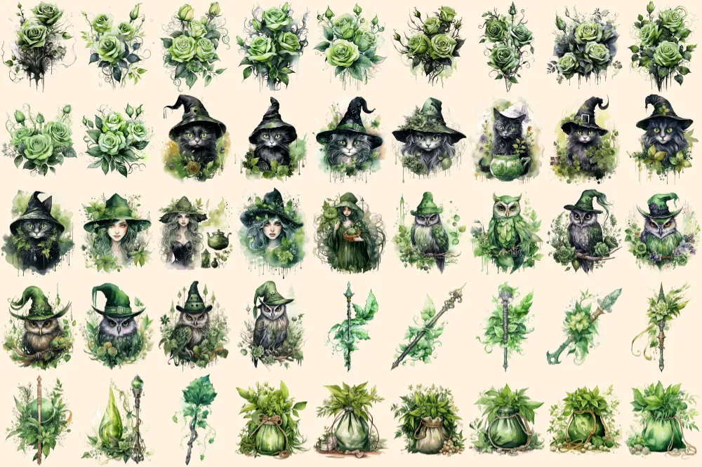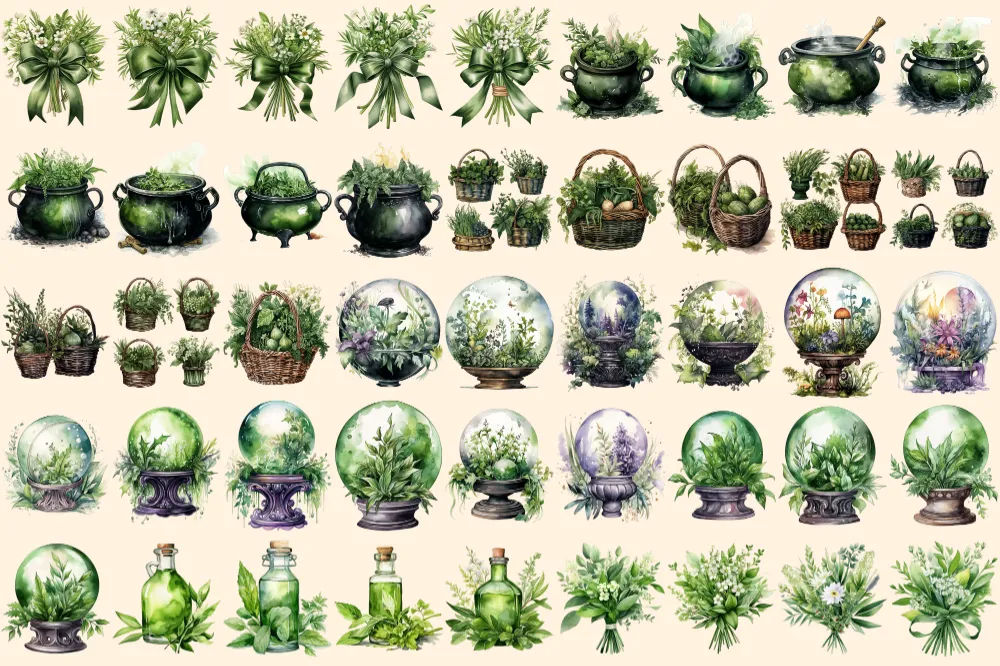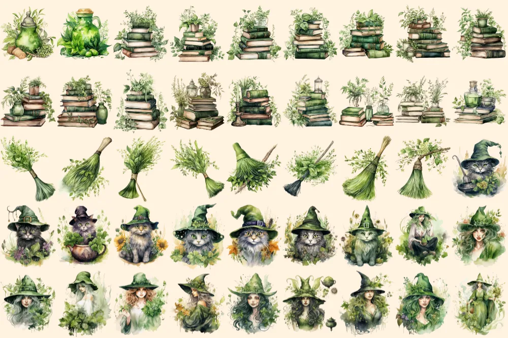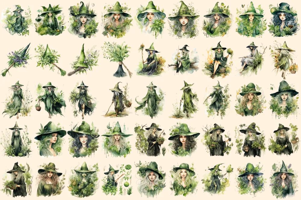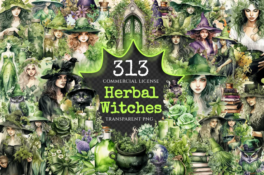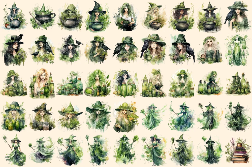 Herbal Witches Watercolor Clipart Bundle – 310+ transparent PNG, Whimsical fantasy graphics, Enchanted png, Commercial use, Digital download