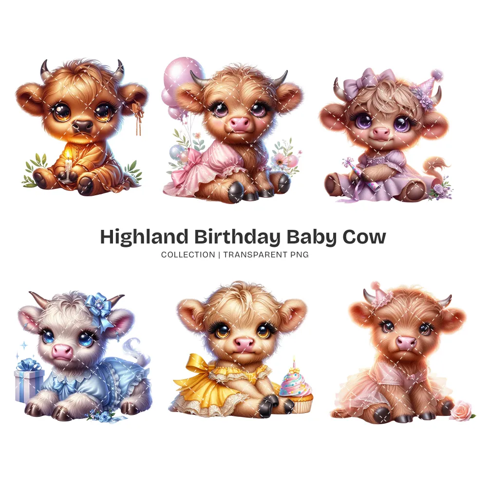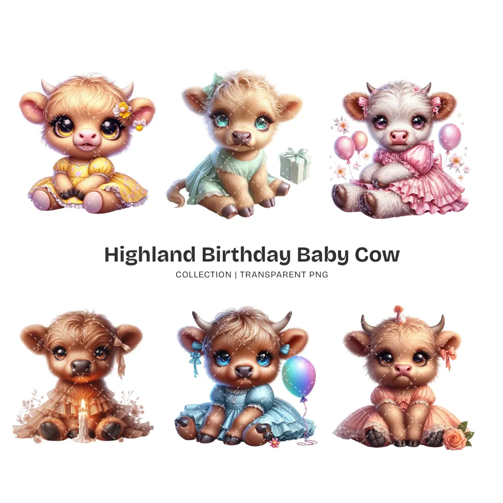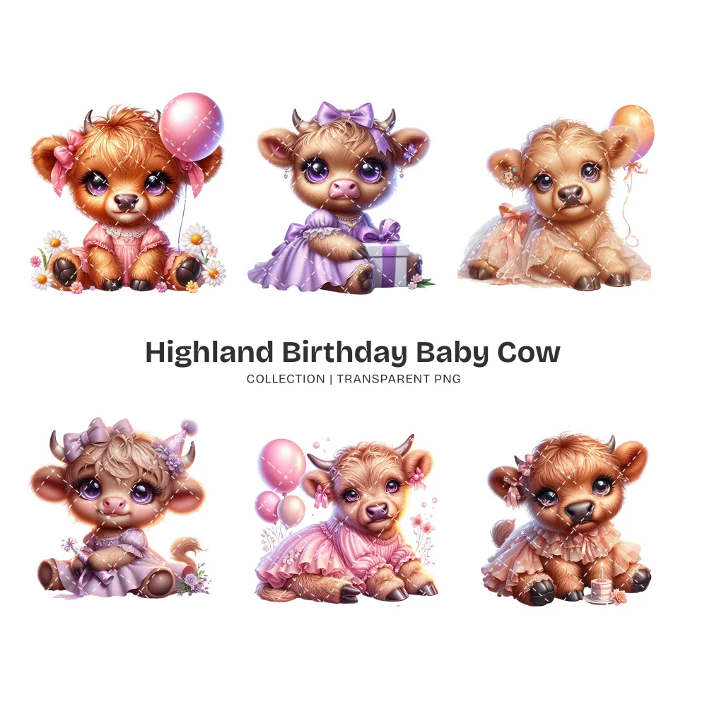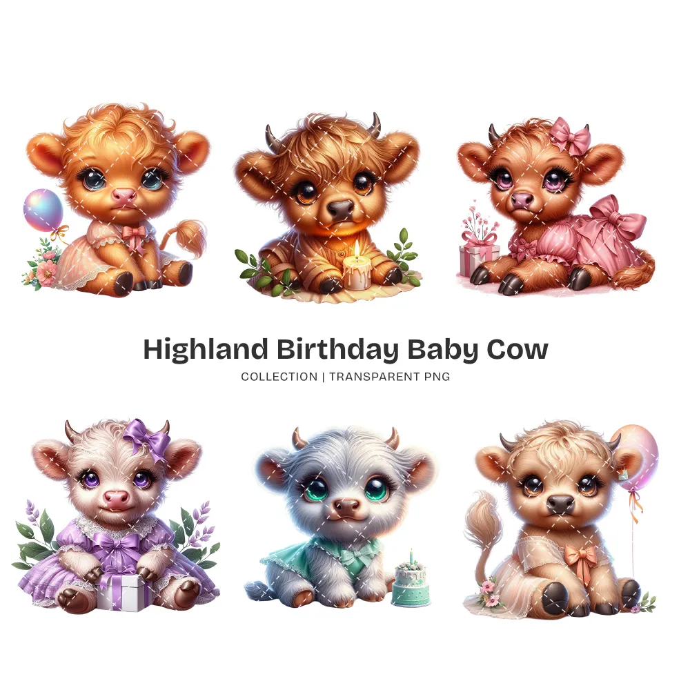 Highland Baby Cow Birthday PNG Clipart Collection – 50 PNG, Cute Farm Graphics, Party Decoration Printables, Commercial use,Digital download