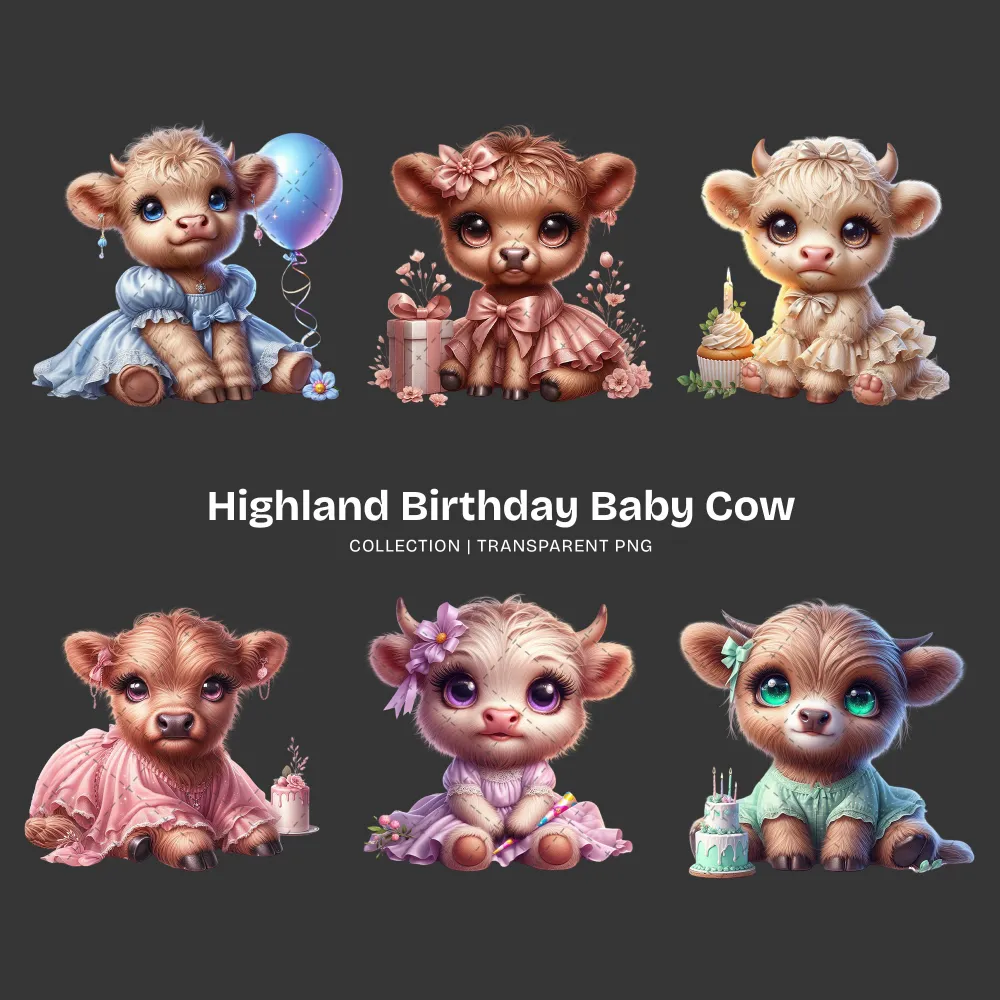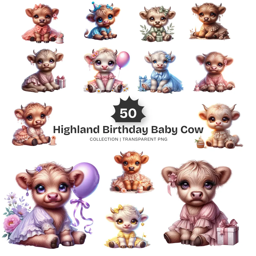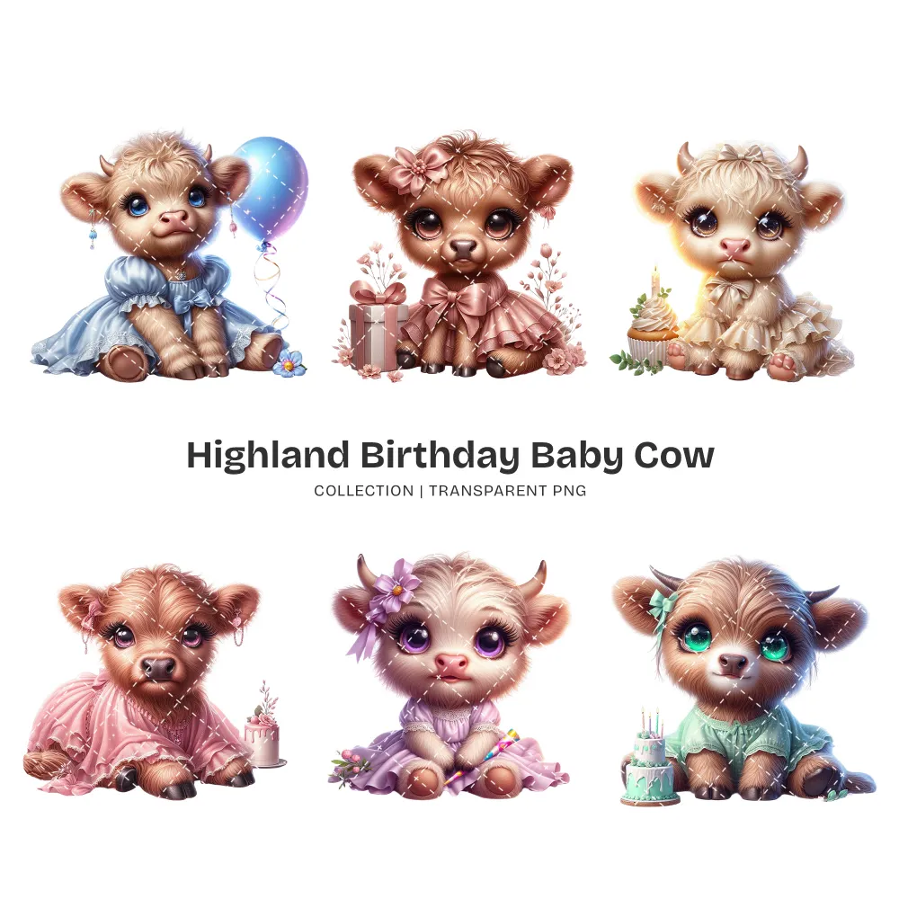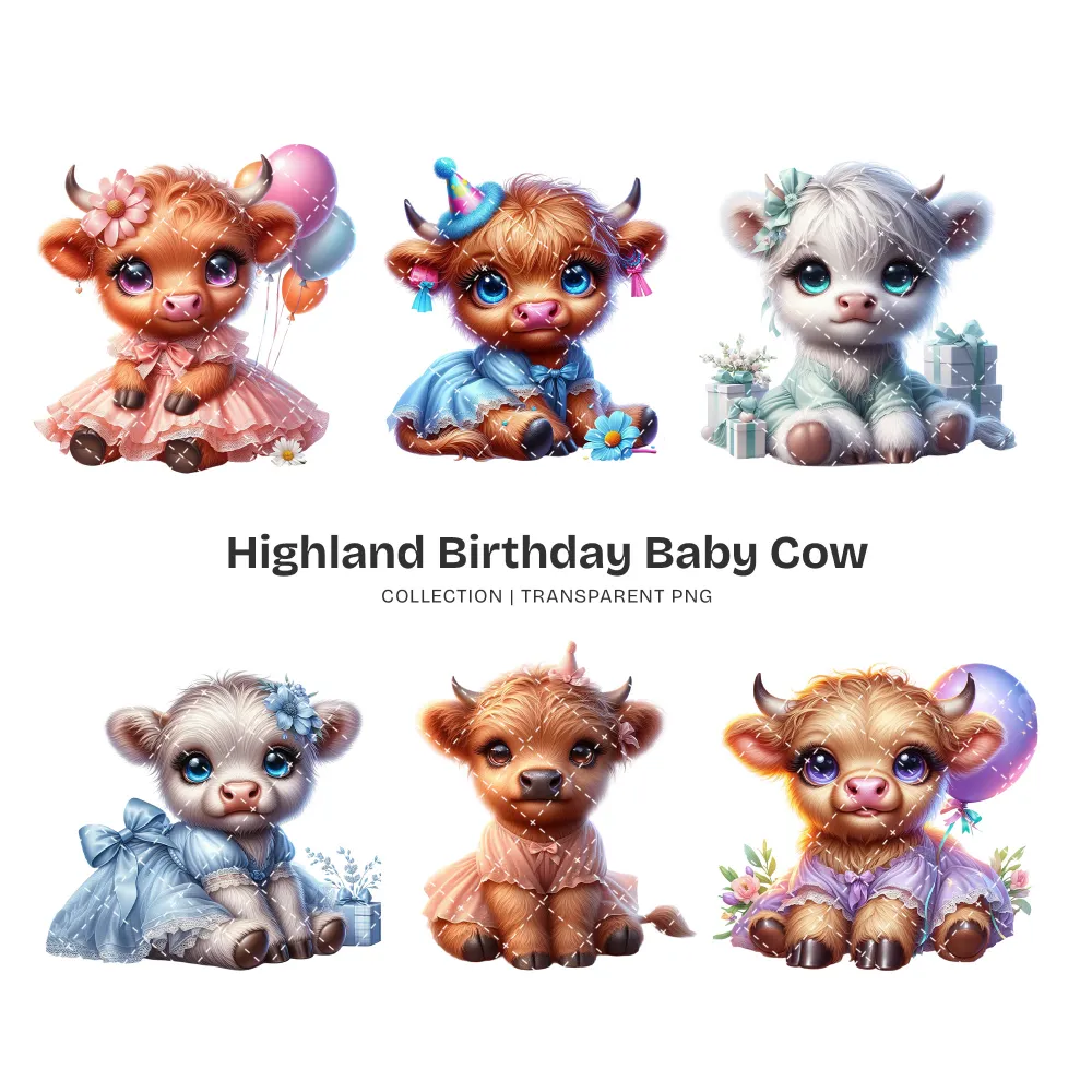 Highland Baby Cow Birthday PNG Clipart Collection – 50 PNG, Cute Farm Graphics, Party Decoration Printables, Commercial use,Digital download