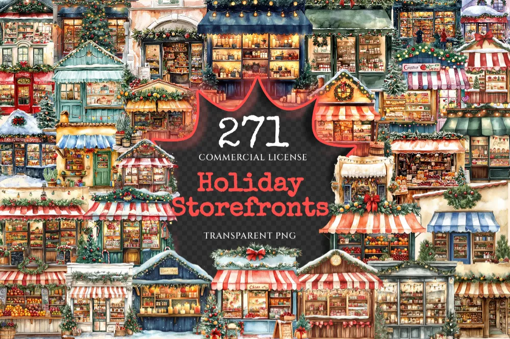 Holiday Storefronts Watercolor Clipart Bundle – 270+ transparent PNG, Festive market png, Holiday shop art, Commercial use, Digital download