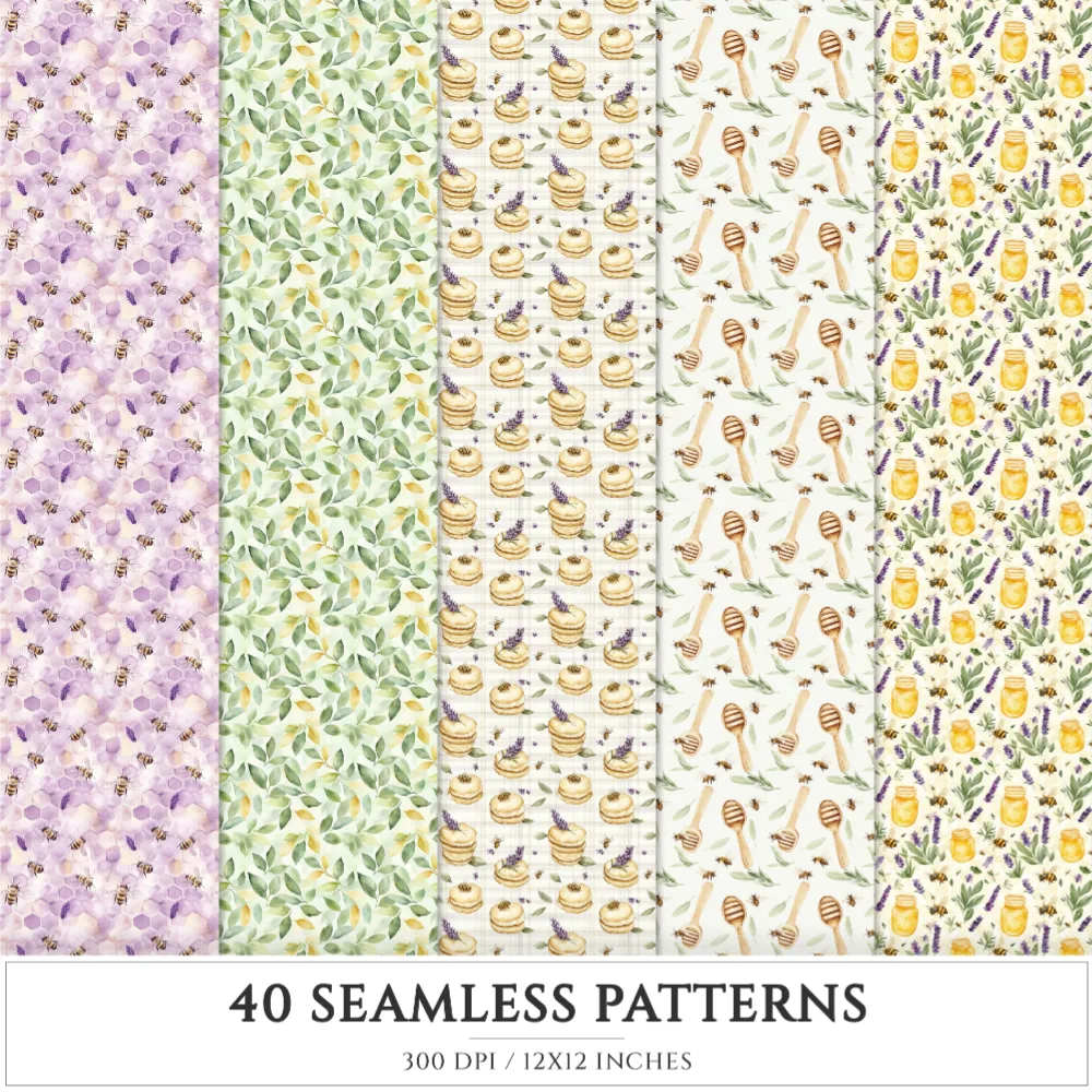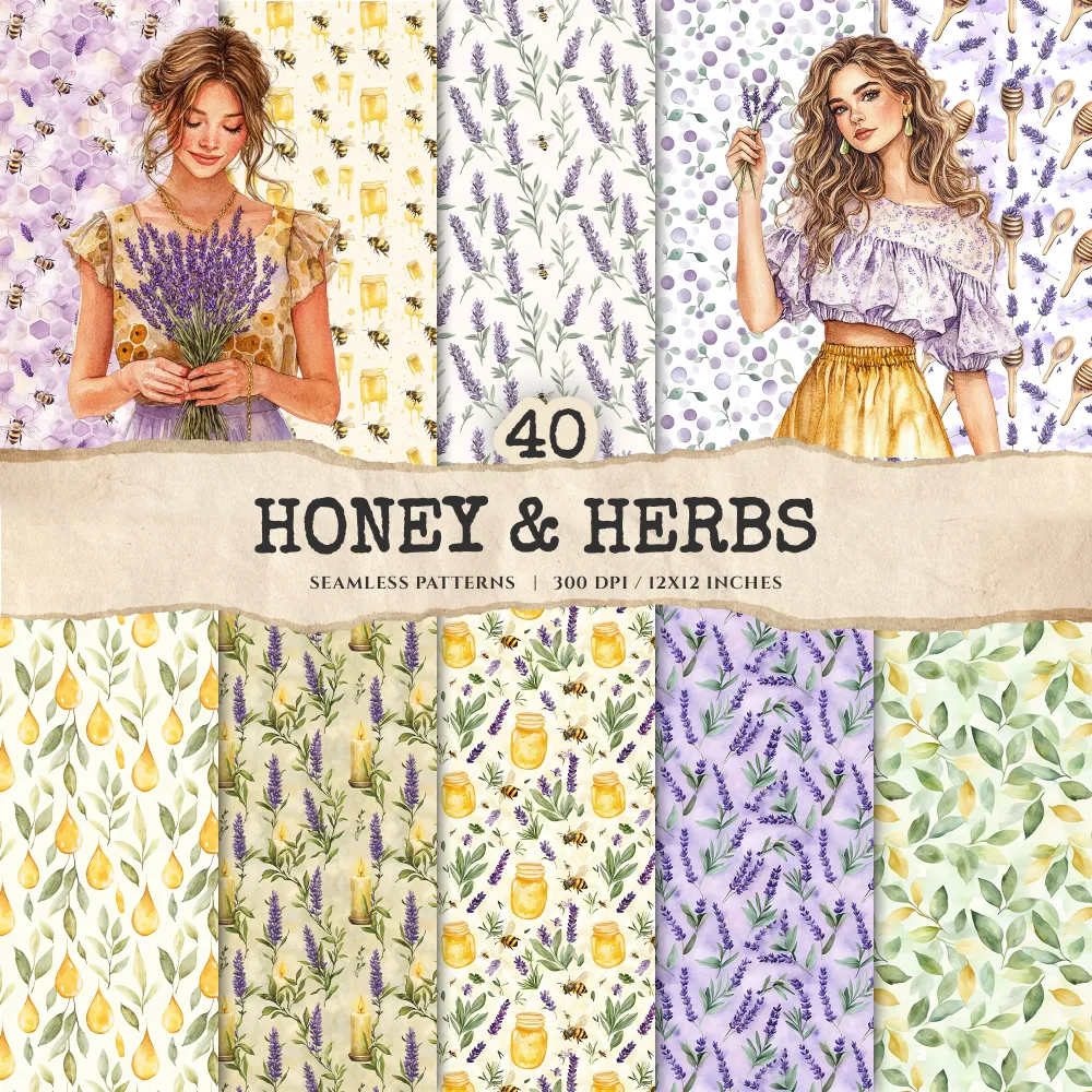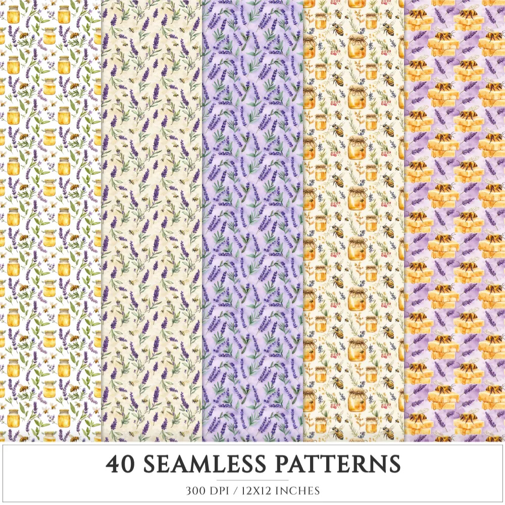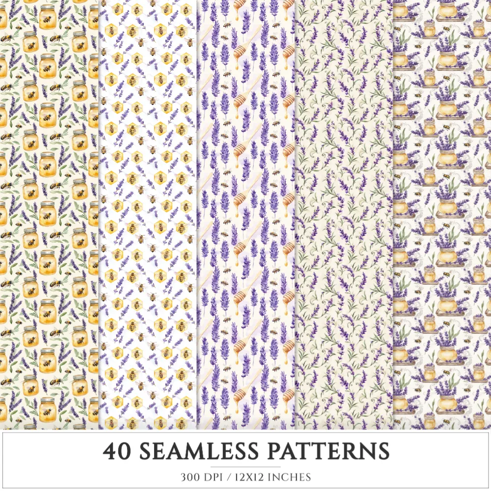 Honey and Herbs Seamless Patterns, Lavender Herb JPEG, Honey Pot, Bee Pattern, Herbal, Lavender Repeating Pattern, Digital Scrapbook Paper