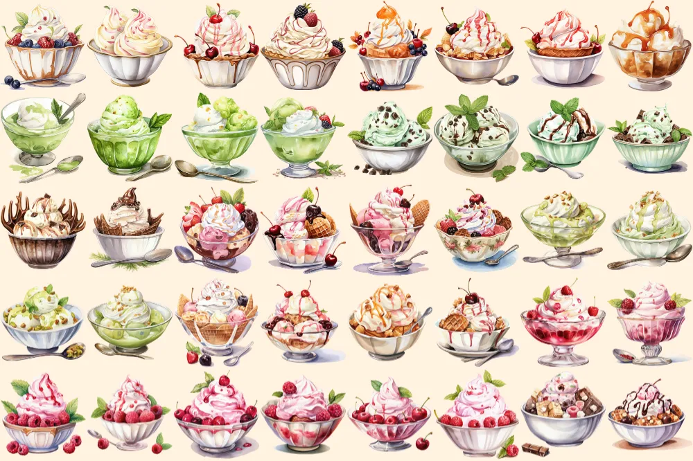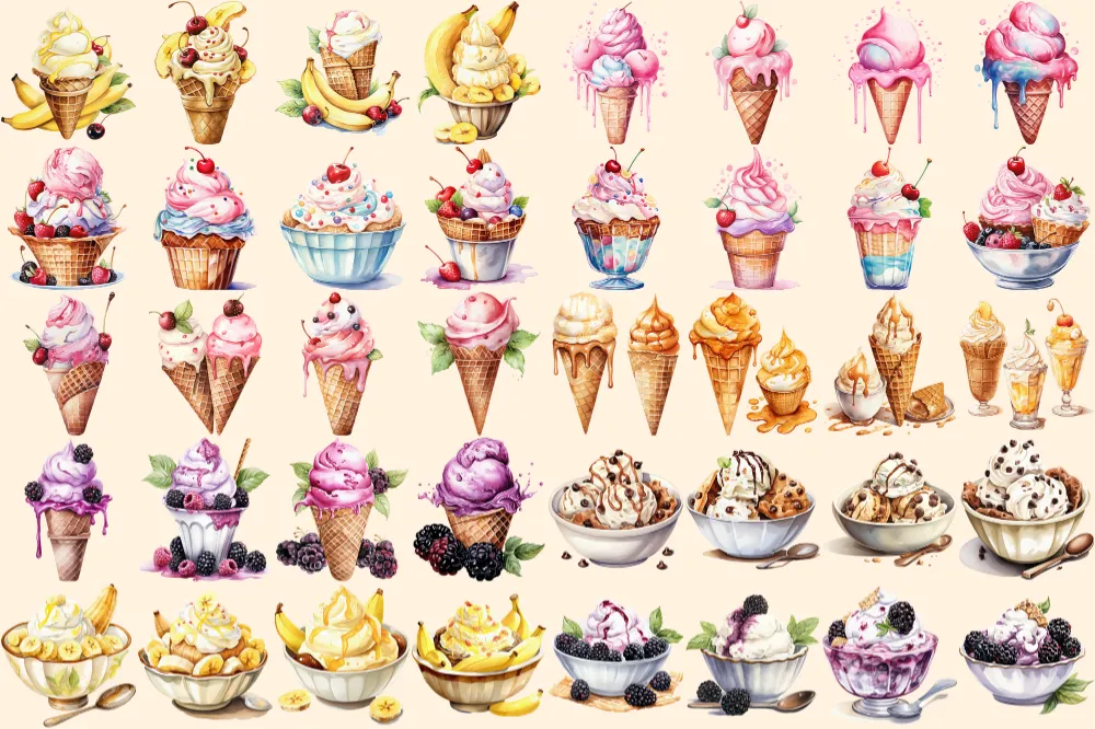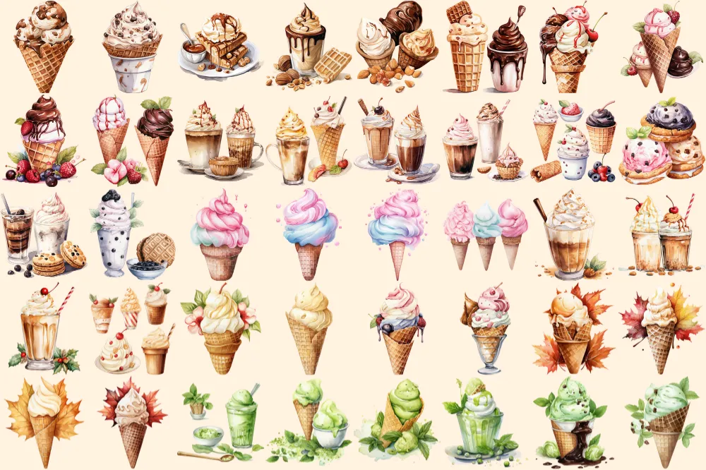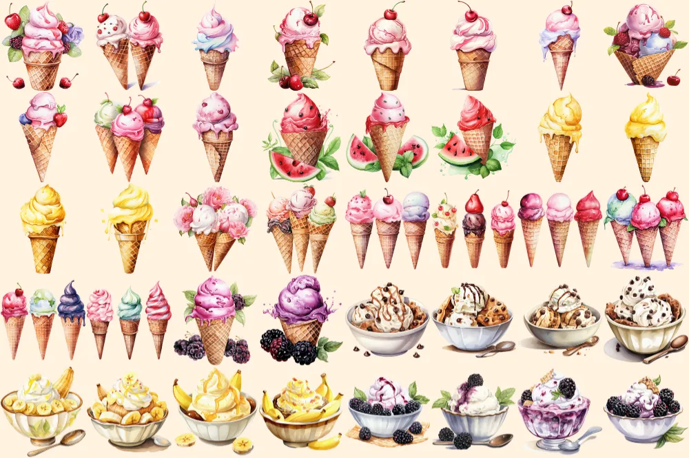 Ice Cream Watercolor Clipart Bundle – 260+ transparent PNG, Savory tasty desserts, Beach dessert, Sweets Commercial use, Digital download