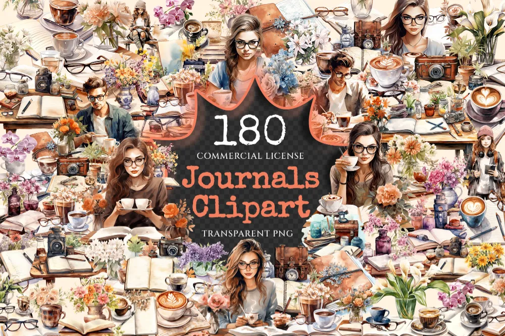 Journals Watercolor Clipart Bundle – 170+ transparent PNG, Agenda images, Organizational illustrations, Commercial use, Digital download