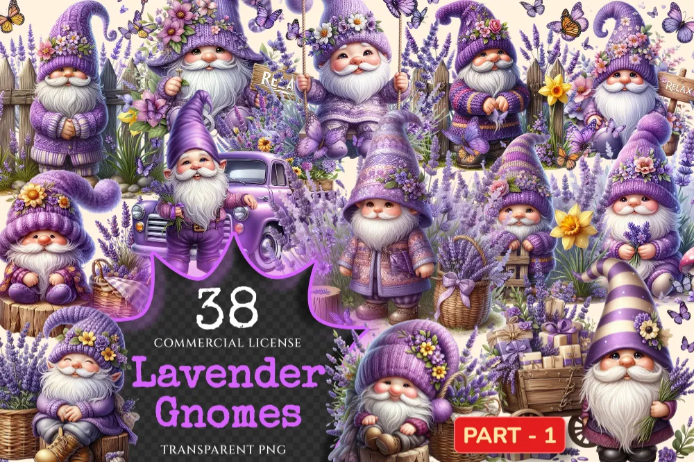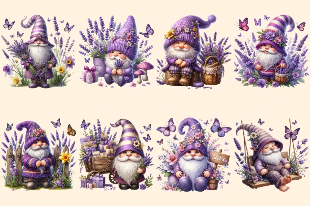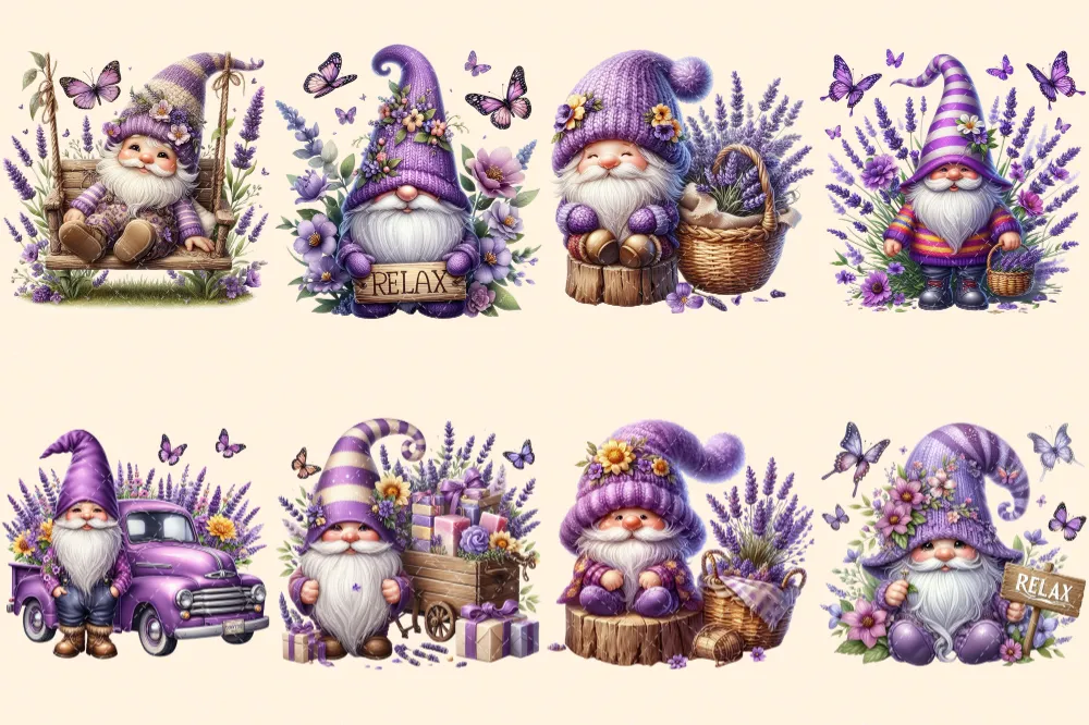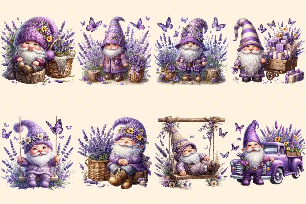 Lavender Gnomes PNG Clipart Collection – 38 PNG, Violet gnome graphics, Garden gnome printables, Commercial use, Digital download