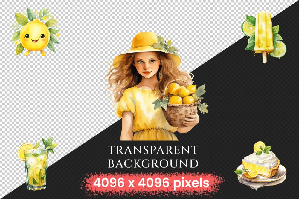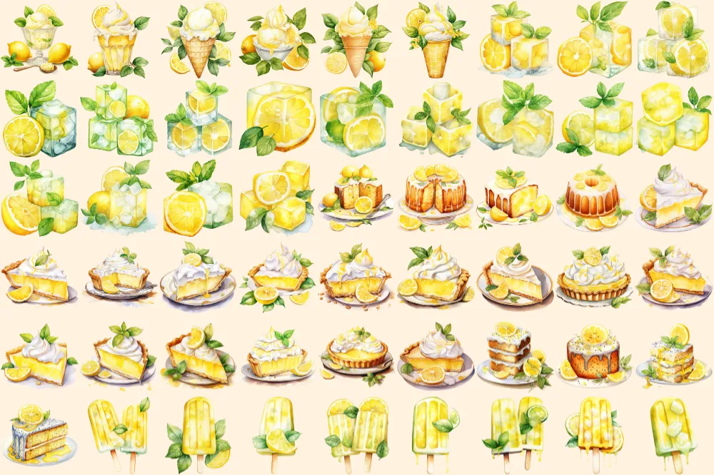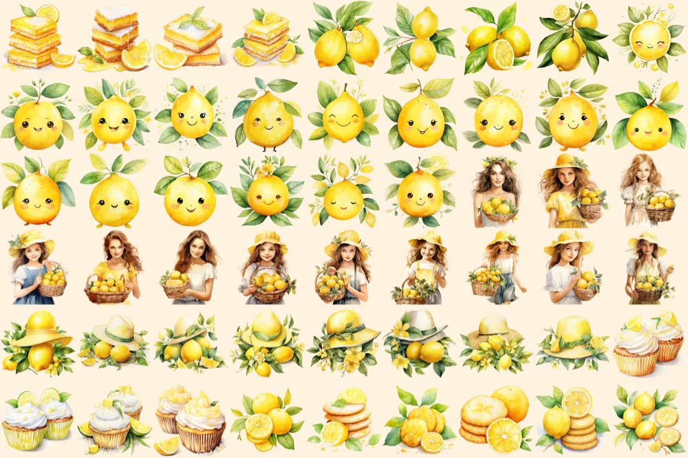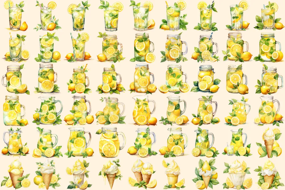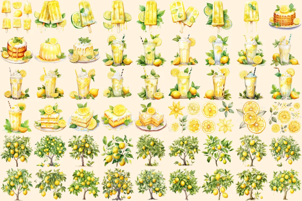 Lemons Watercolor Clipart Bundle – 355+ transparent PNG, Citrus summer refreshments, Mediterranean tile, Commercial use, Digital download